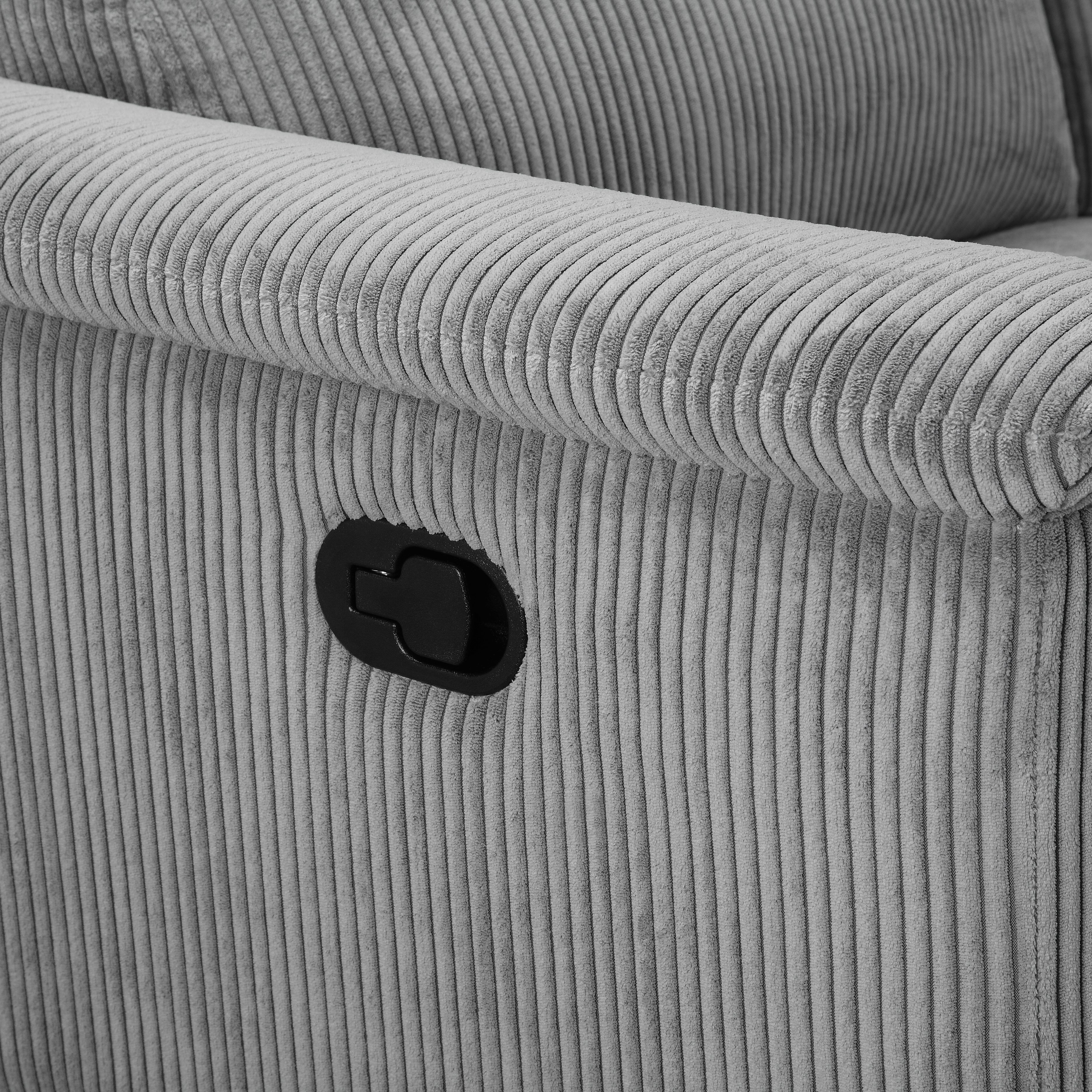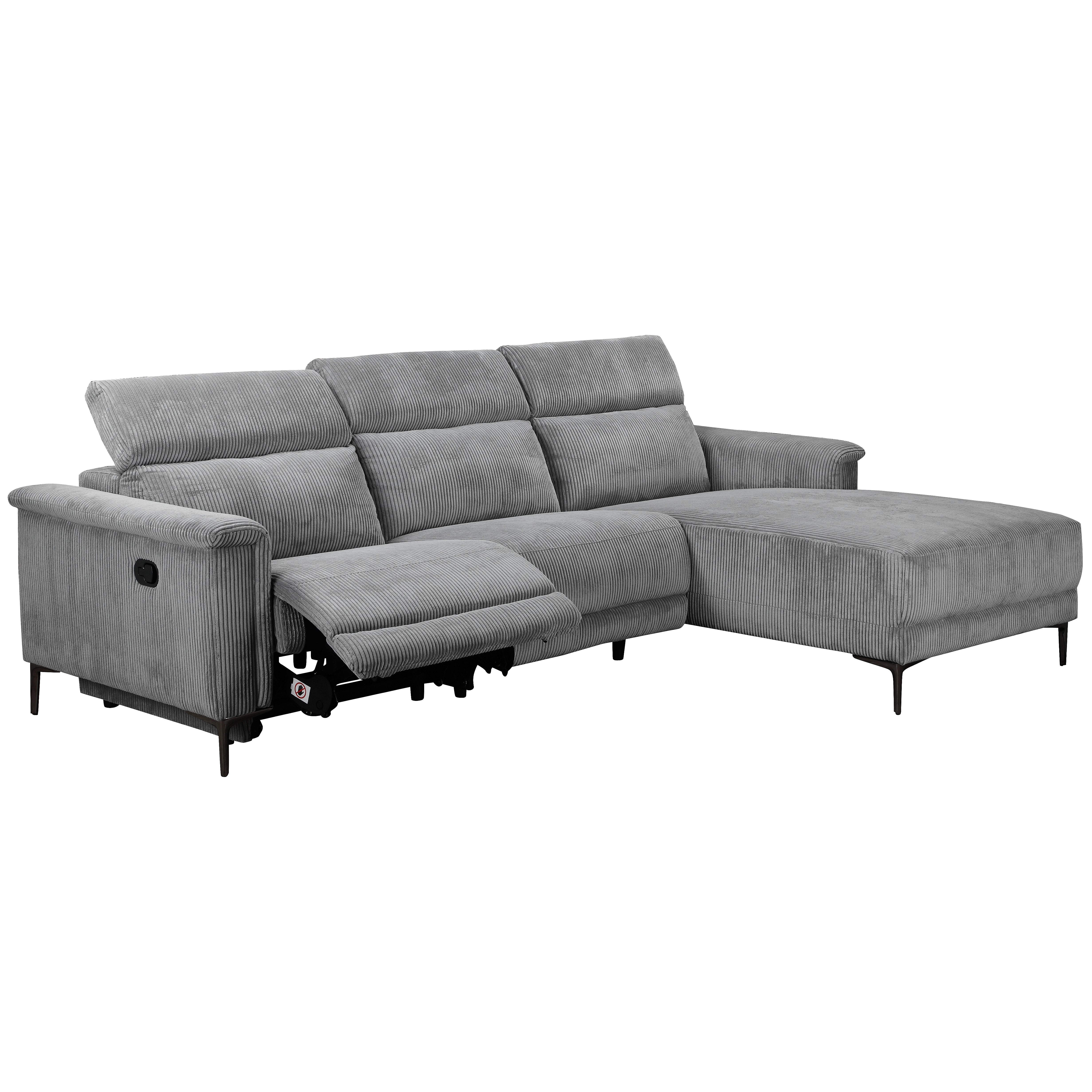 Denne hjørnesofa er designet til komfort og stil. Den har tre sæder med chaiselong i højre side. Det bløde fløjlsfibermateriale gør det hyggeligt og indbydende. Den manuelle hvilestol er placeret på den modsatte side af chaiselongen og bevæger sig jævnt uden trin. Ryglænet og fodsektionen justeres sammen for en afslappende oplevelse. Nakkestøtten kan indstilles i fem forskellige positioner for ekstra støtte. Sofaen er stærk og stabil med fem metalben i grå og ti sorte støtteben. Den kan holde op til 450 kg, og hvert sæde kan bære 150 kg. Denne sofa er et godt valg til ethvert moderne opholdsrum.