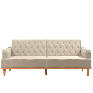 Klassisk vintage design med ryglænsknaptuft og en træløber henover bunden.