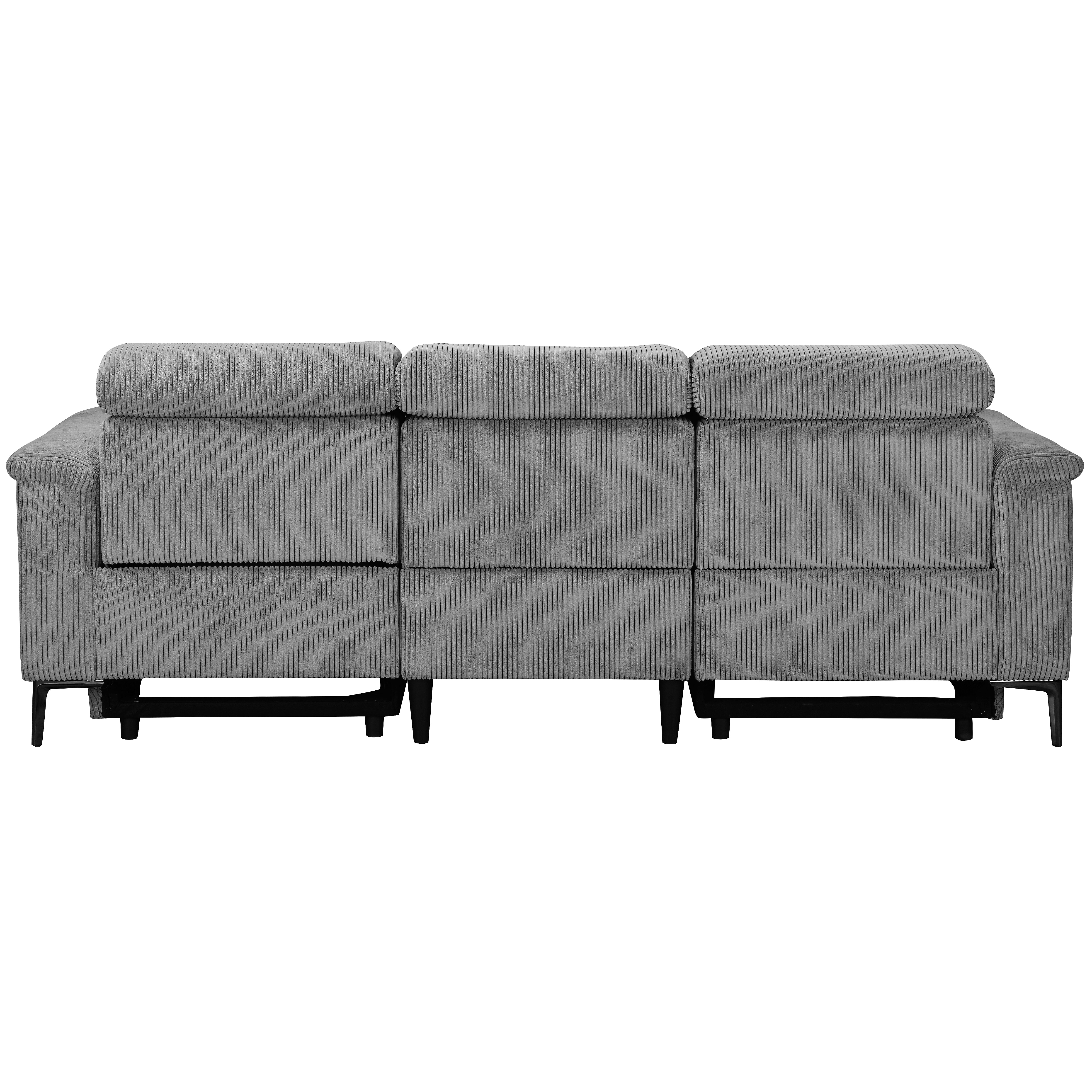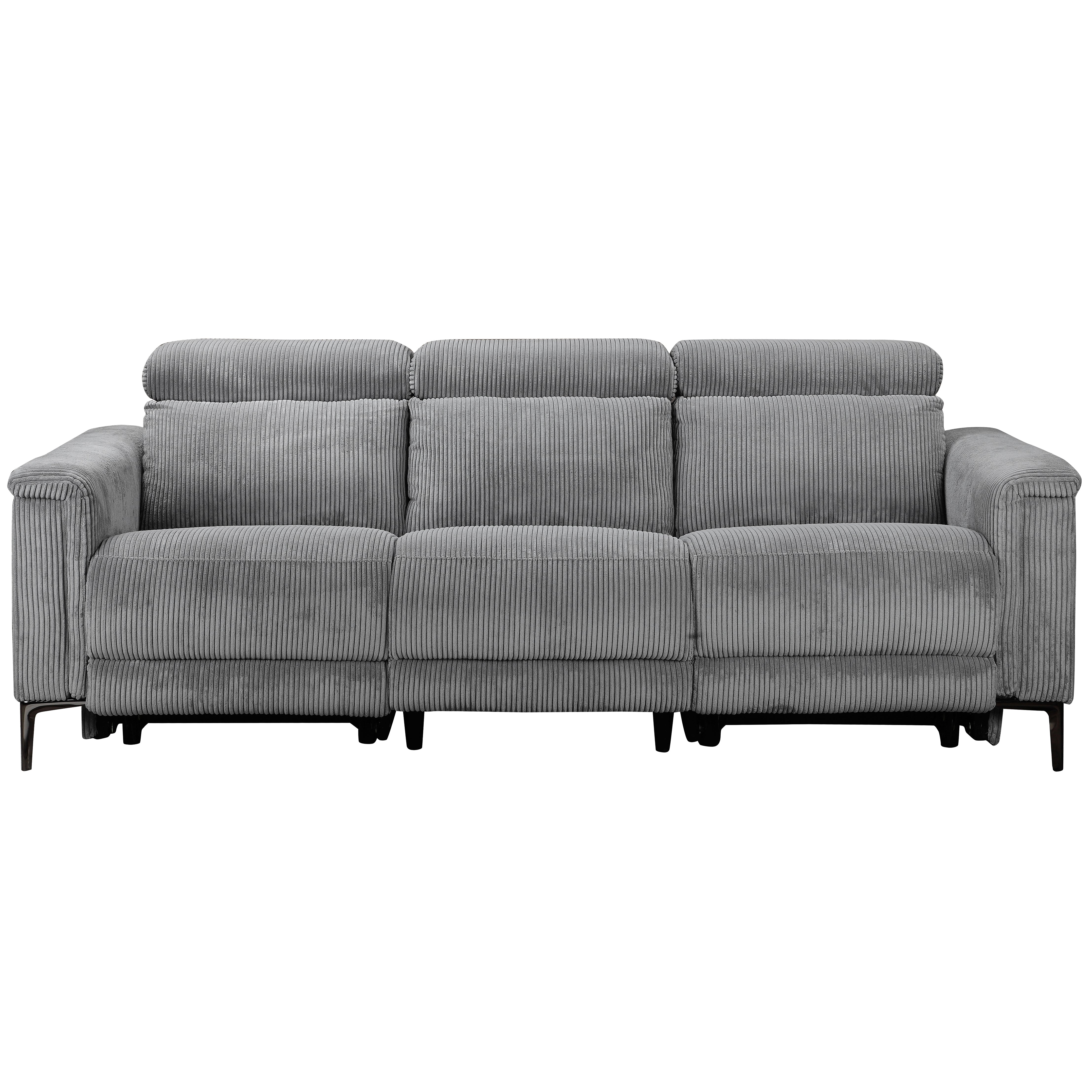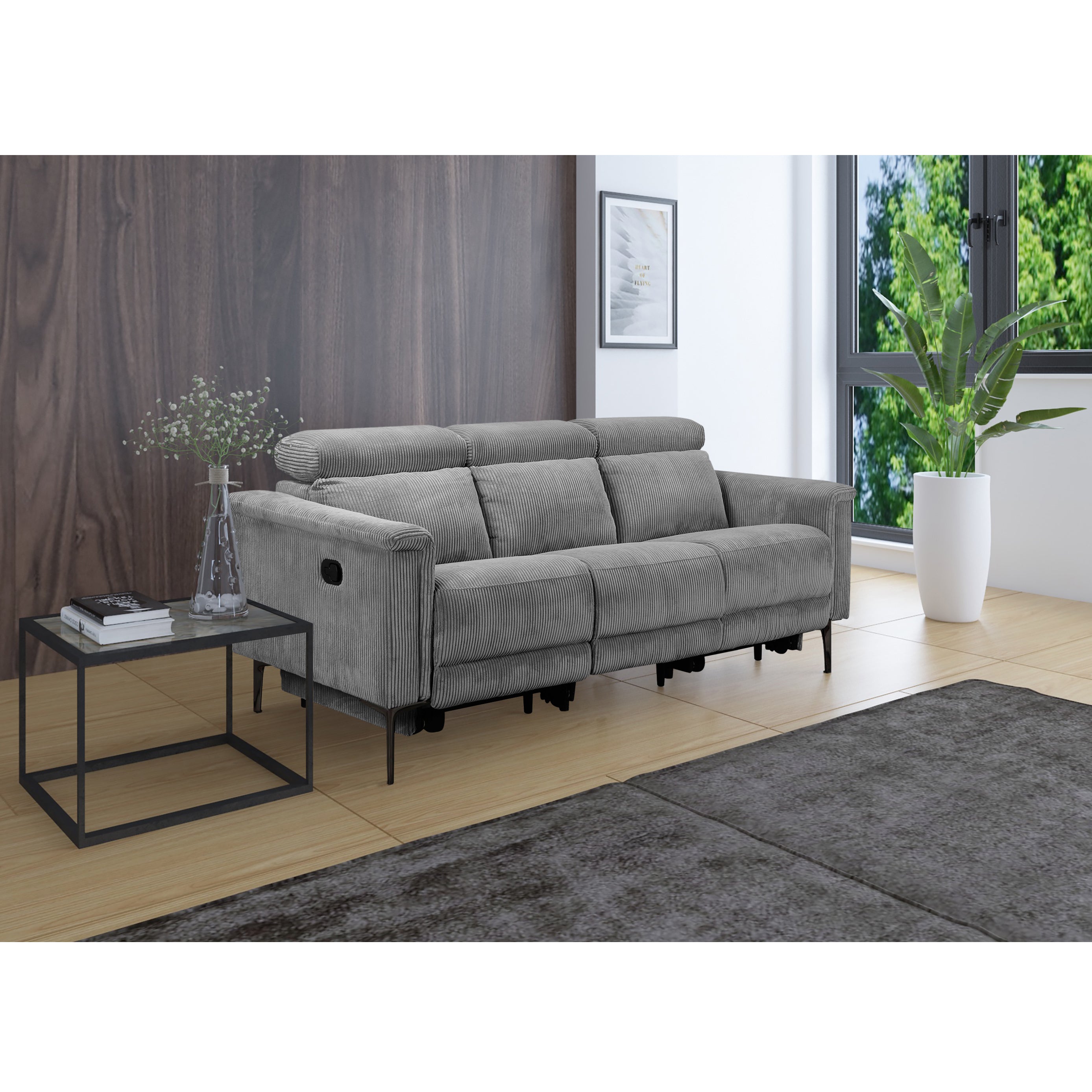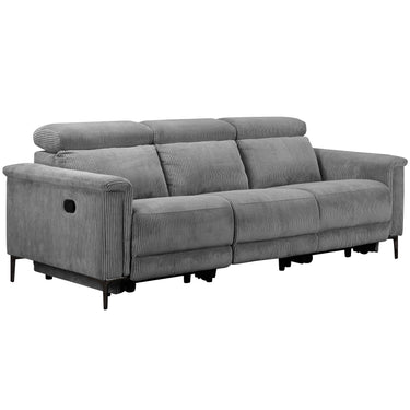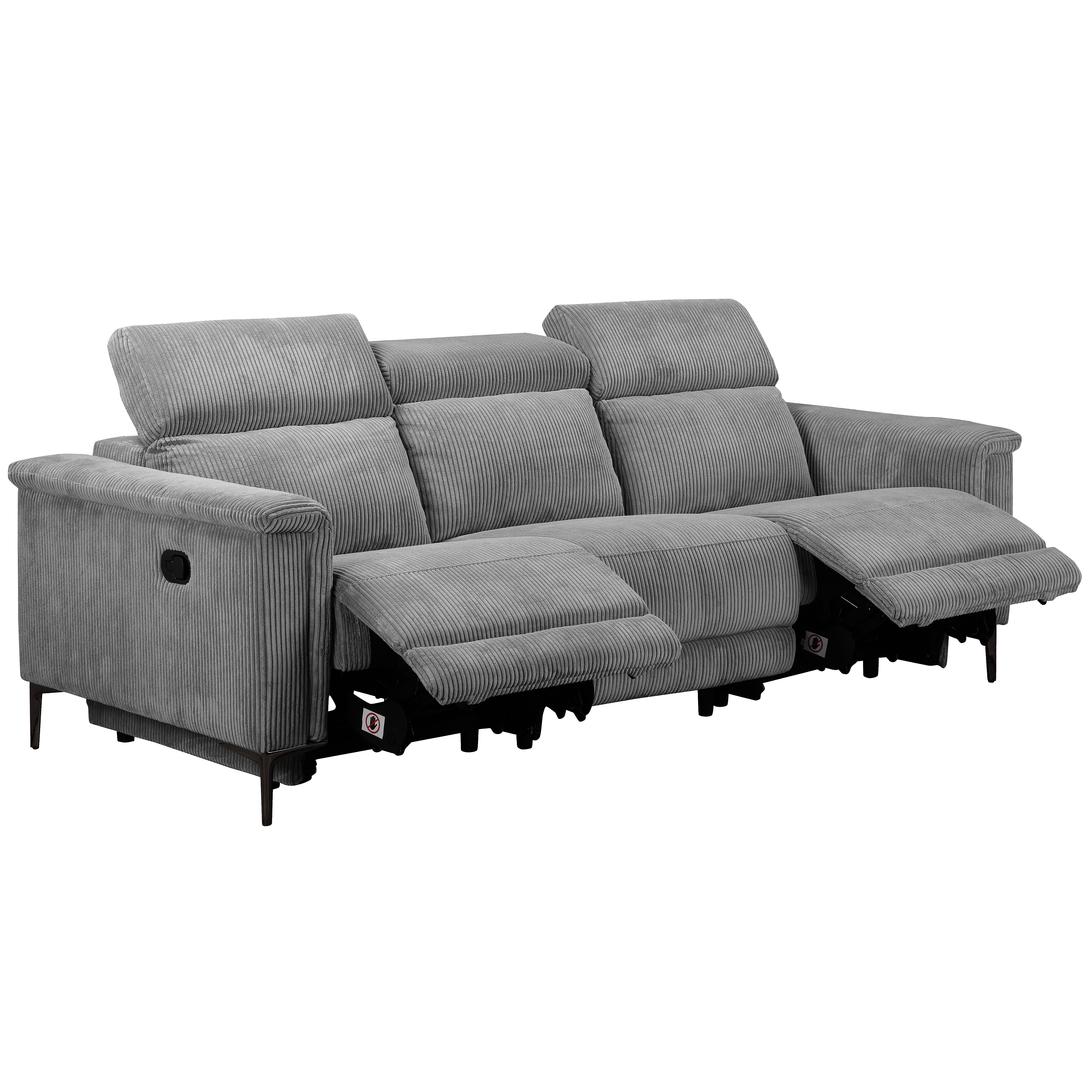 Denne tresædede sofa tilbyder både komfort og bekvemmelighed. Den er lavet af blødt fløjlsstof, som føles varmt og hyggeligt. Sofaen har to manuelle hvilestole, en på hver side, der kan justeres uden trin. Ryglænet og fodsektionen bevæger sig sammen og giver en afslappende oplevelse. Nakkestøtten kan justeres til fem forskellige positioner for ekstra støtte. Sofaen har fire robuste metalben i gråt og tolv sorte støtteben, der giver den stærk stabilitet. Den kan holde op til 450 kg, og hvert sæde kan bære 150 kg. Denne sofa er en stilfuld og praktisk tilføjelse til ethvert opholdsrum.