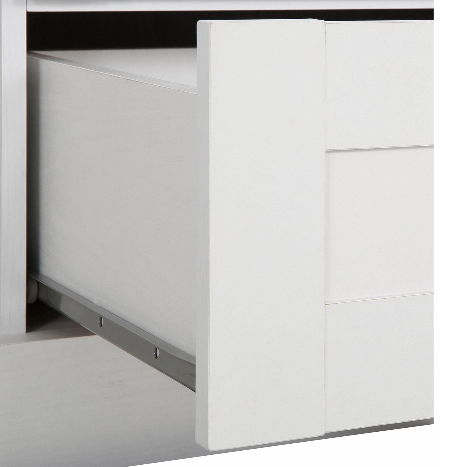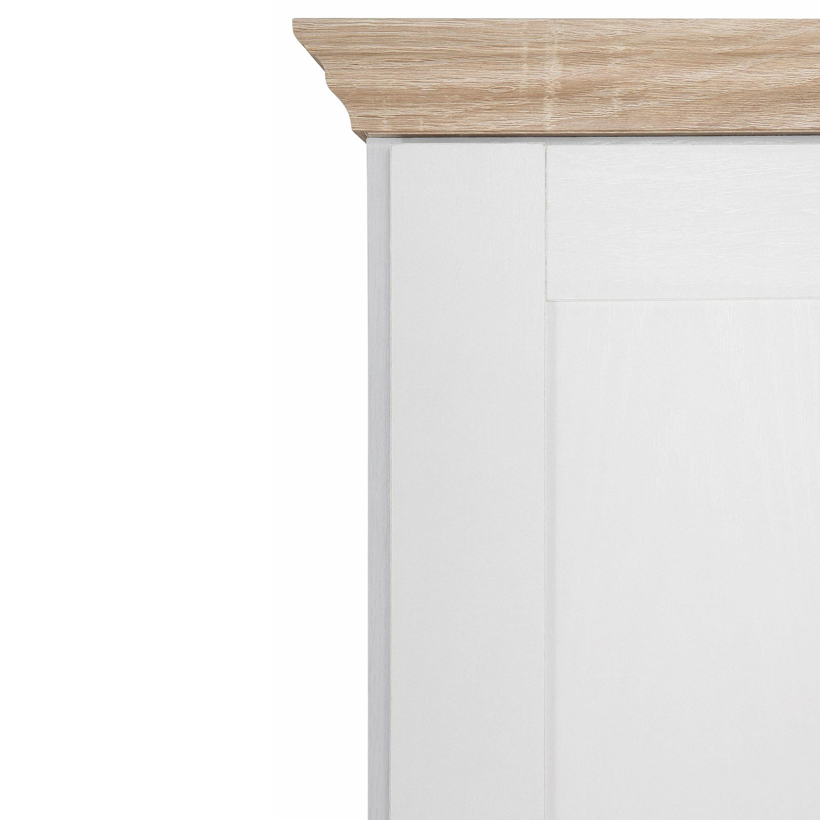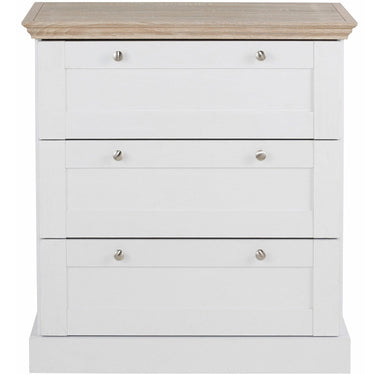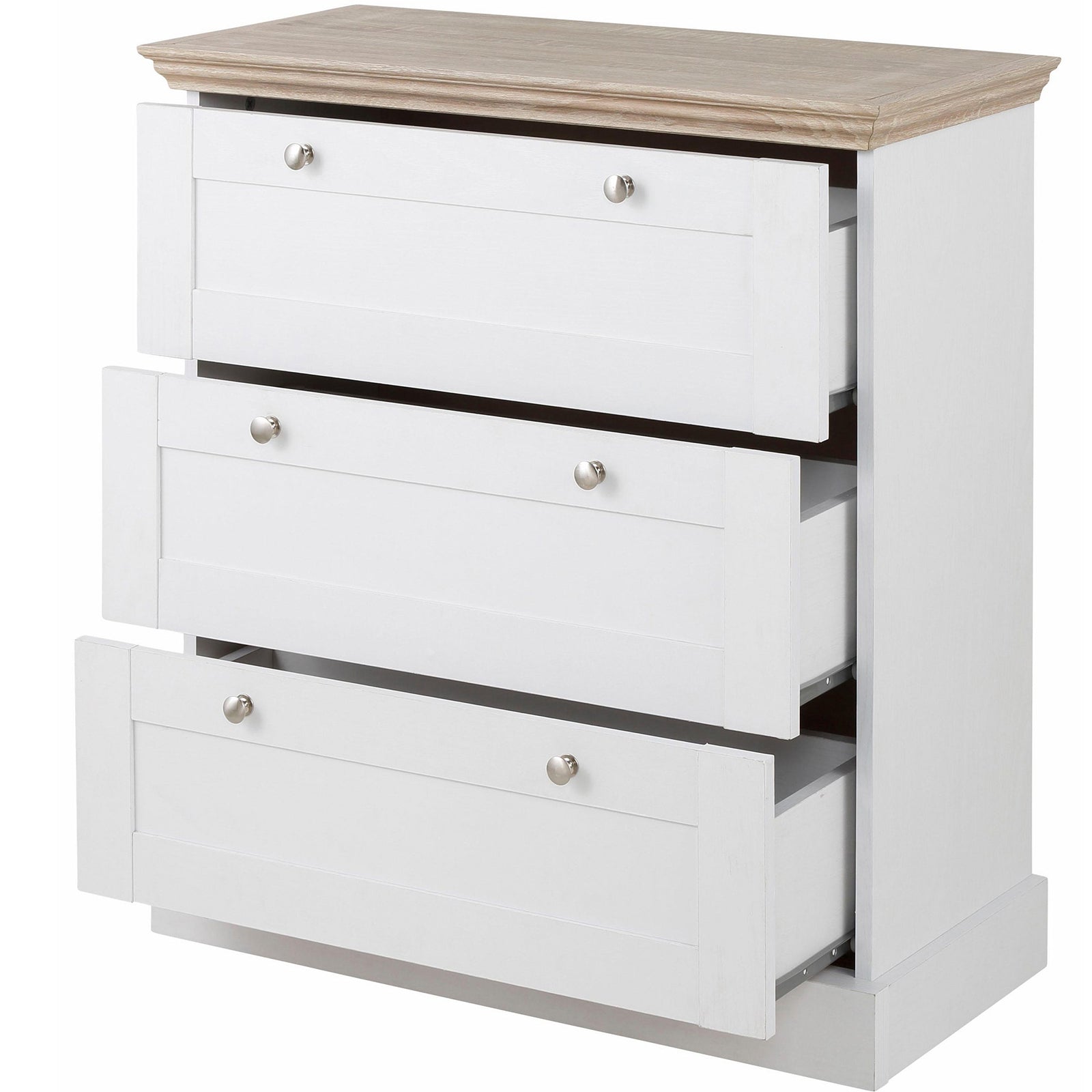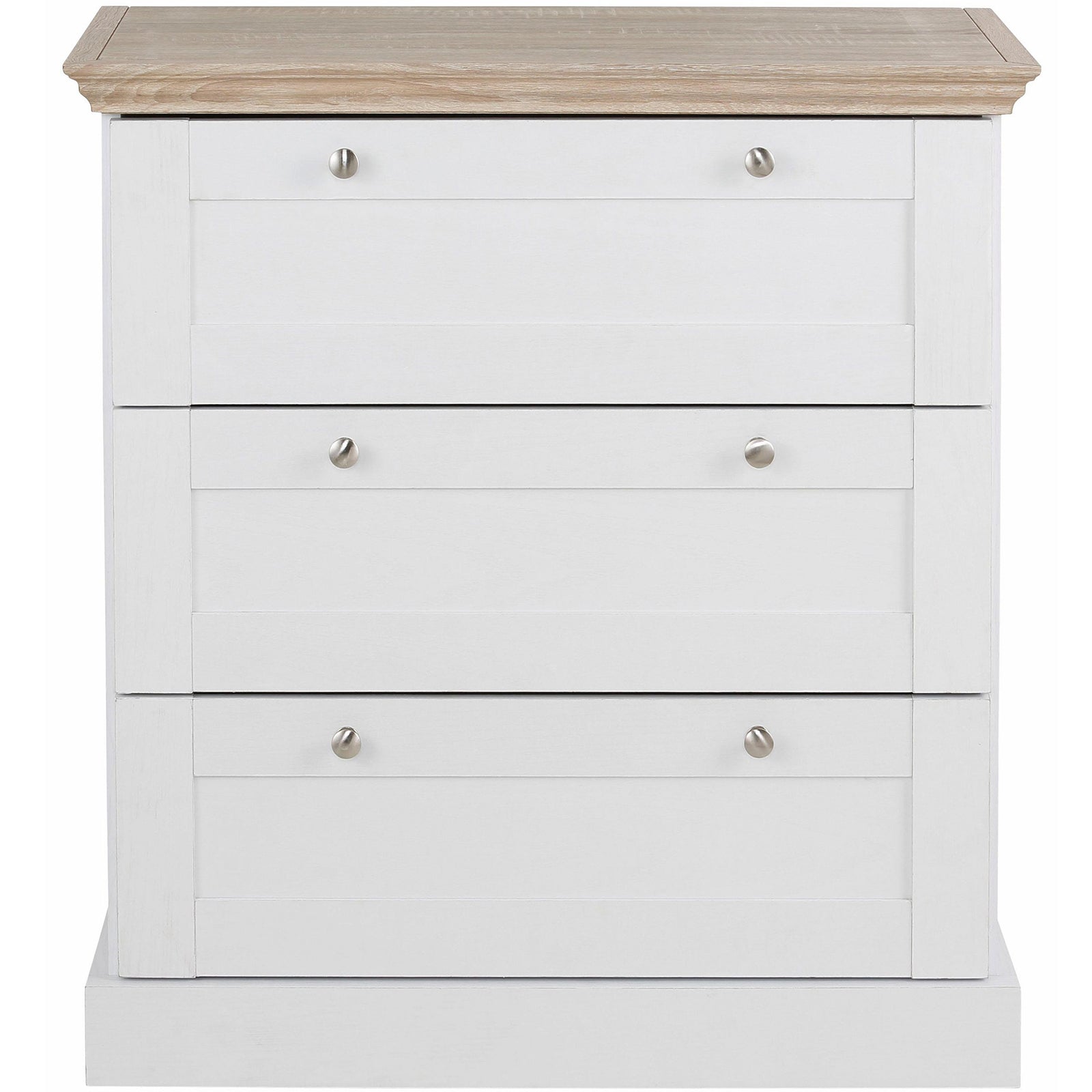 Denne kommode har tre rummelige skuffer med egetræslook og hvid finish. Fremstillet af holdbare spånplader giver den rigelig opbevaringsplads, mens den tilføjer et strejf af elegance til ethvert rum. Perfekt til soveværelset, stuen eller gangen, denne kiste kombinerer funktionalitet med et stilfuldt design.