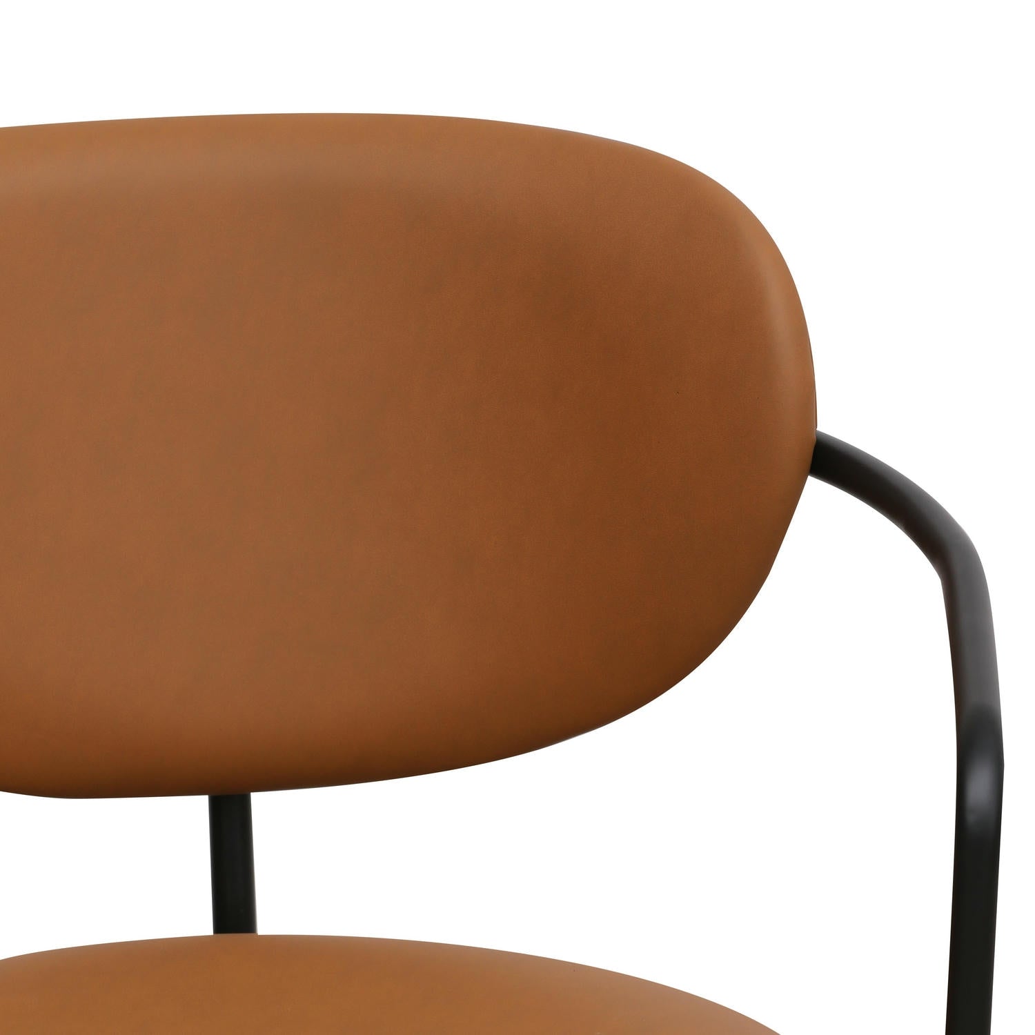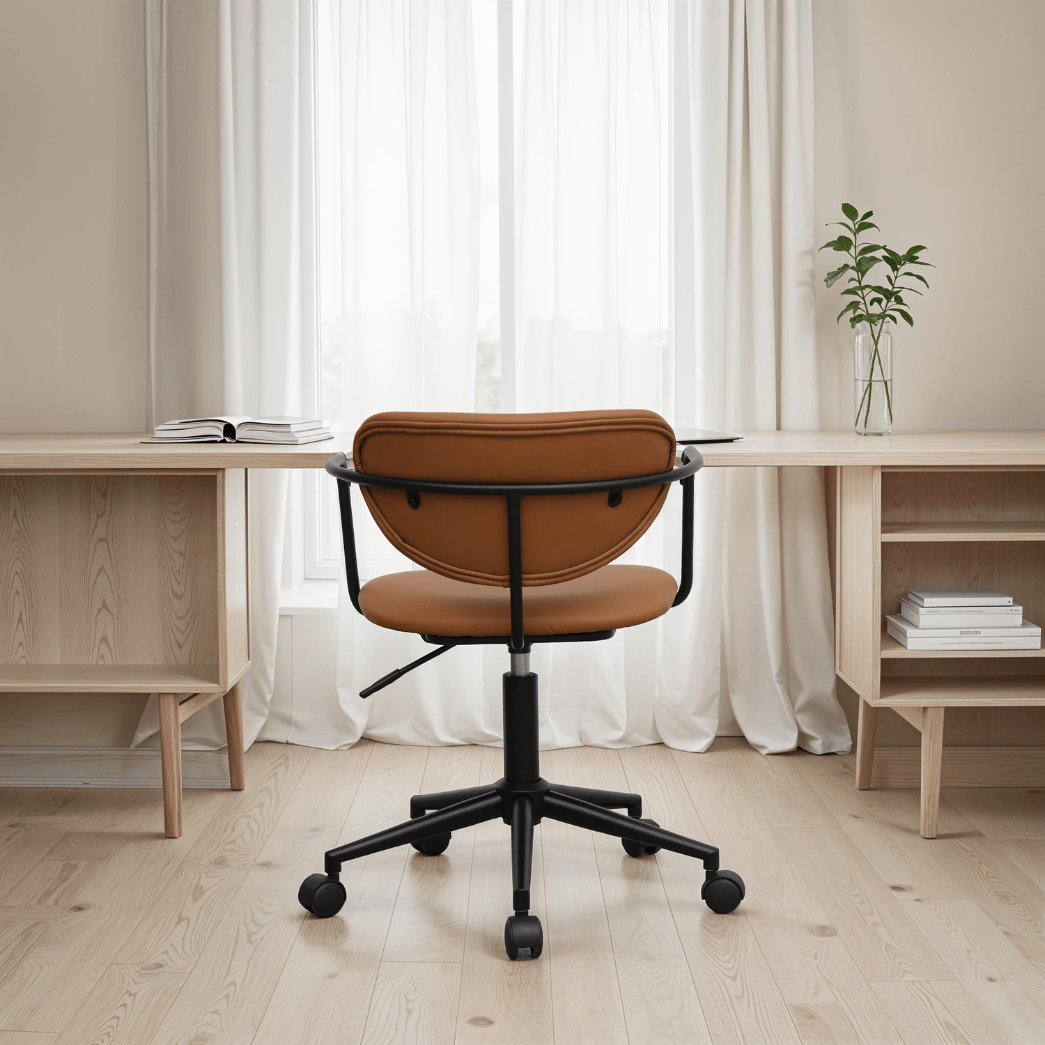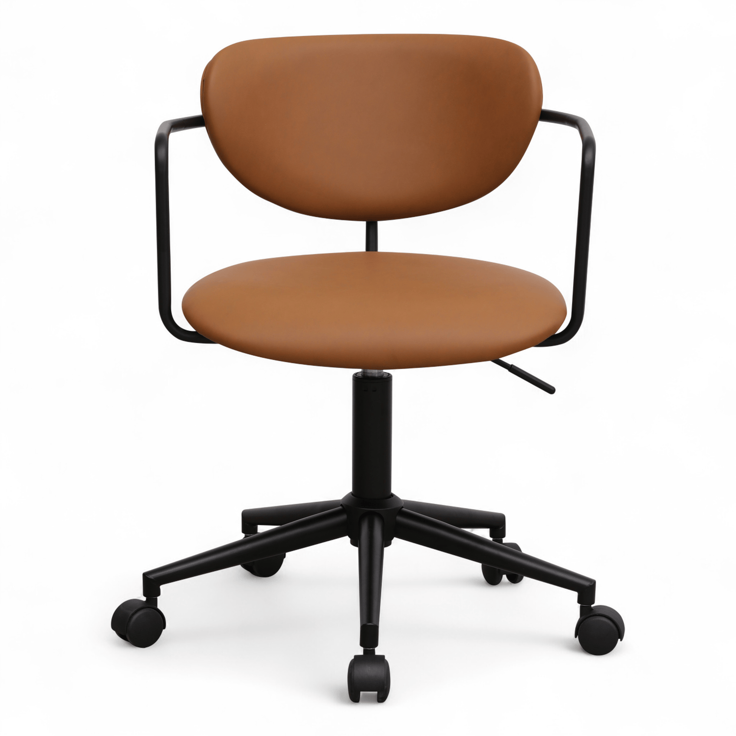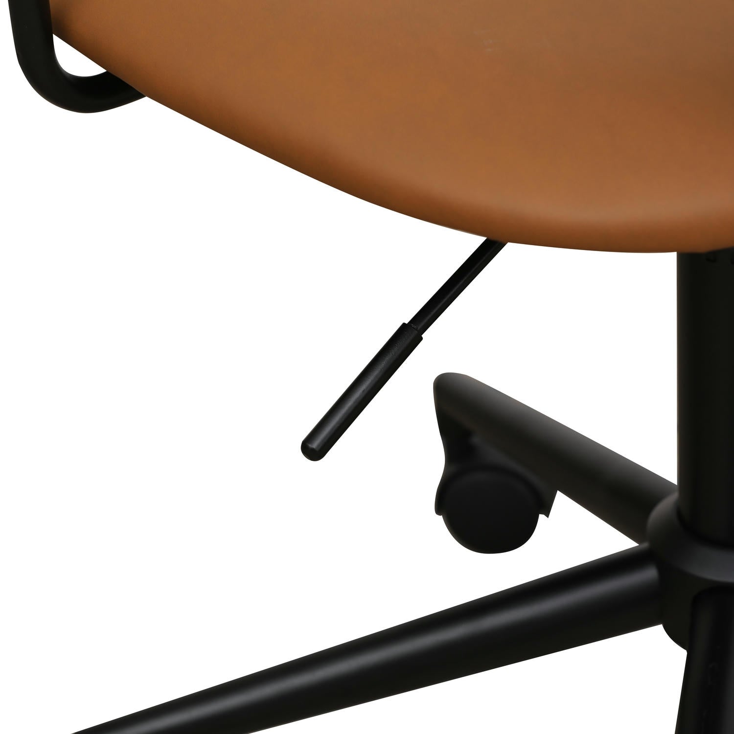 Lido kontorstolen har lysebrunt imiteret læderbetræk med skumpolstring på sæde og ryglæn. Den sorte metalbund med et centralt ben understøtter et 360° drejeligt sæde og justerbar højde fra 45 til 57 cm. Integrerede armlæn giver ekstra støtte. Designet blander skandinaviske, industrielle og japanske stilarter. Montering påkrævet. Kun indendørs brug.