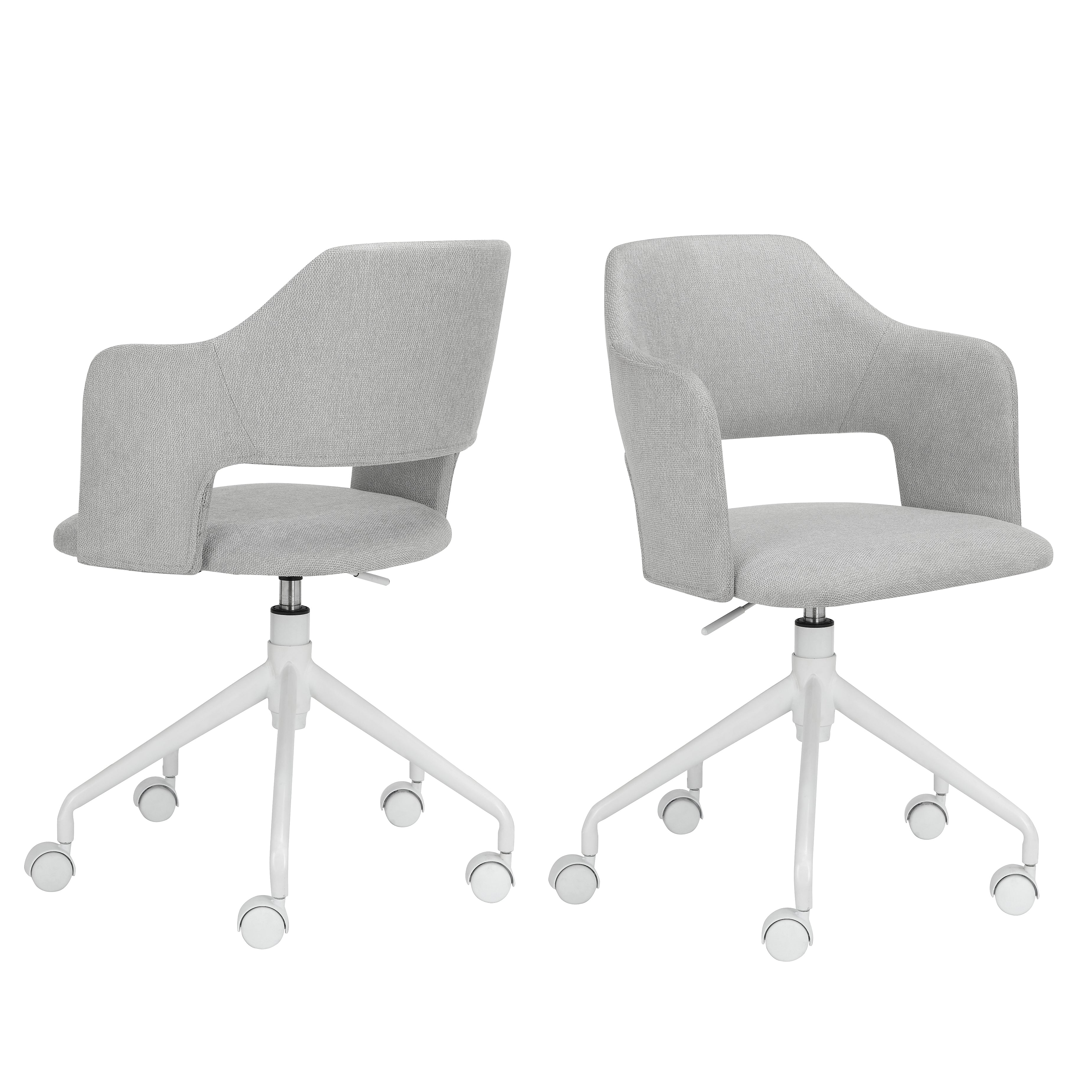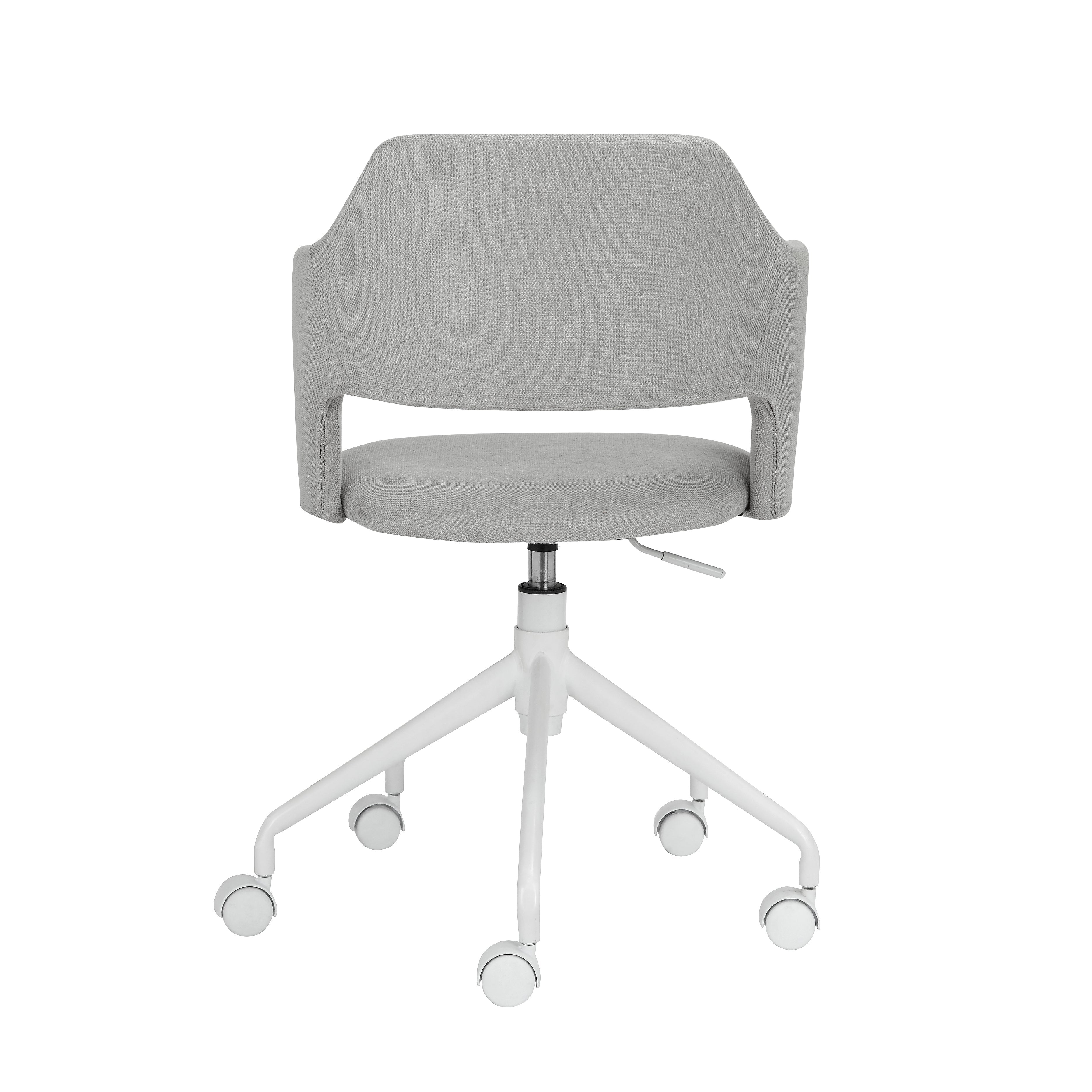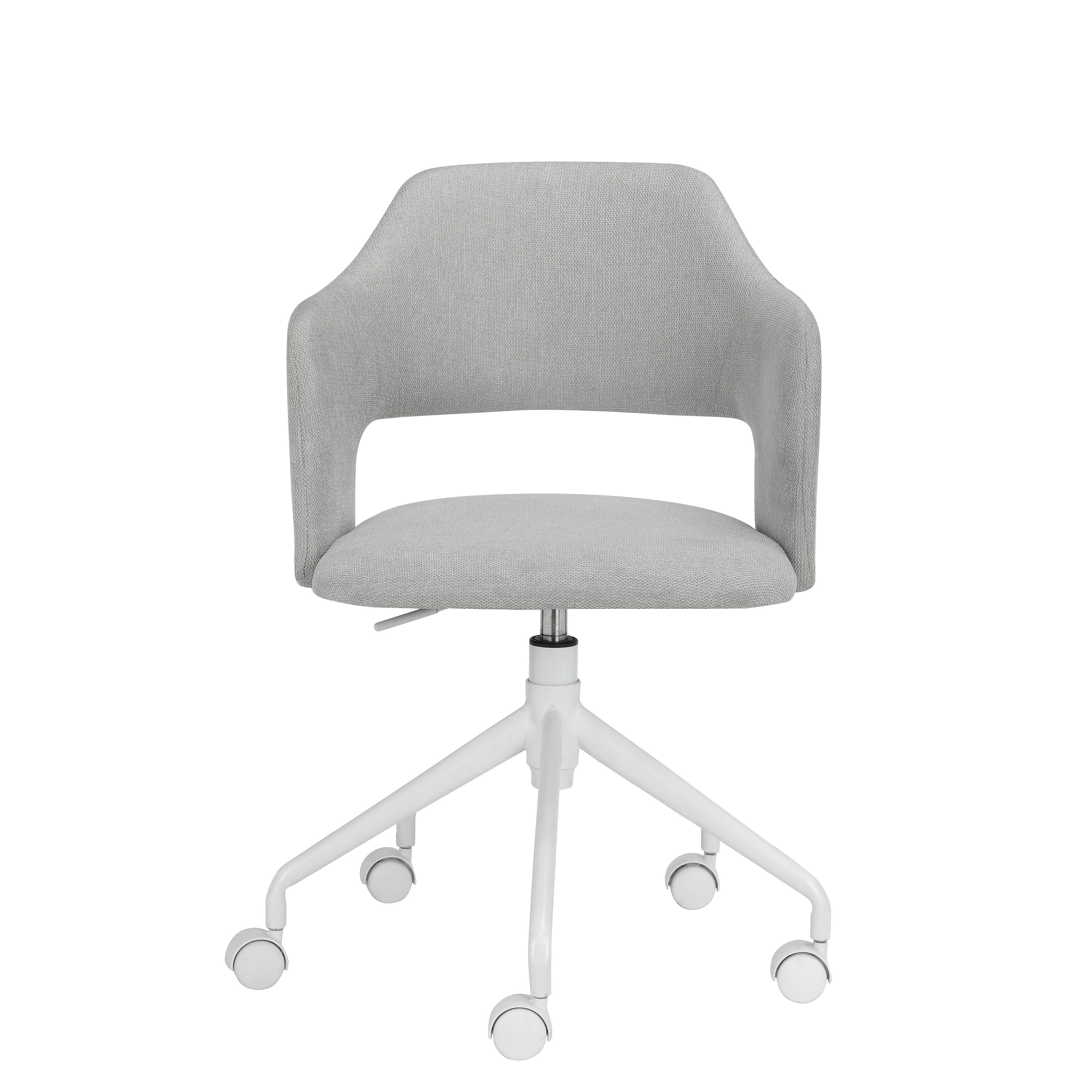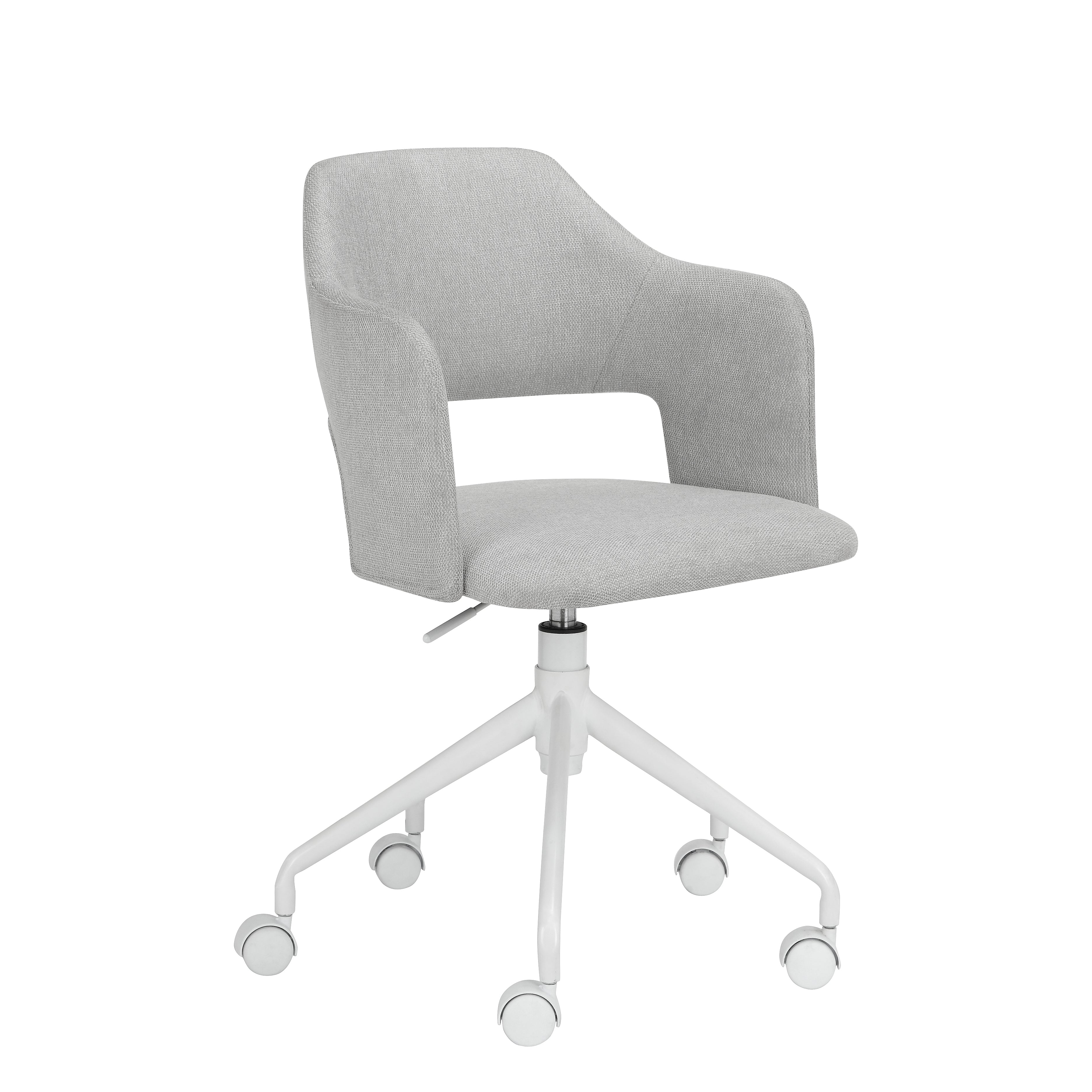 Denne kontorstol har et pulverlakeret metalstel og hvide plasthjul, der tilbyder et klassisk design. Drejefunktionen tillader nem bevægelse. Kontorstolen er ideel til mindre rum. Både sædet og det polstrede ryg- og armlæn sørger for komfort. Højden er justerbar. Støtter op til 120 kg.