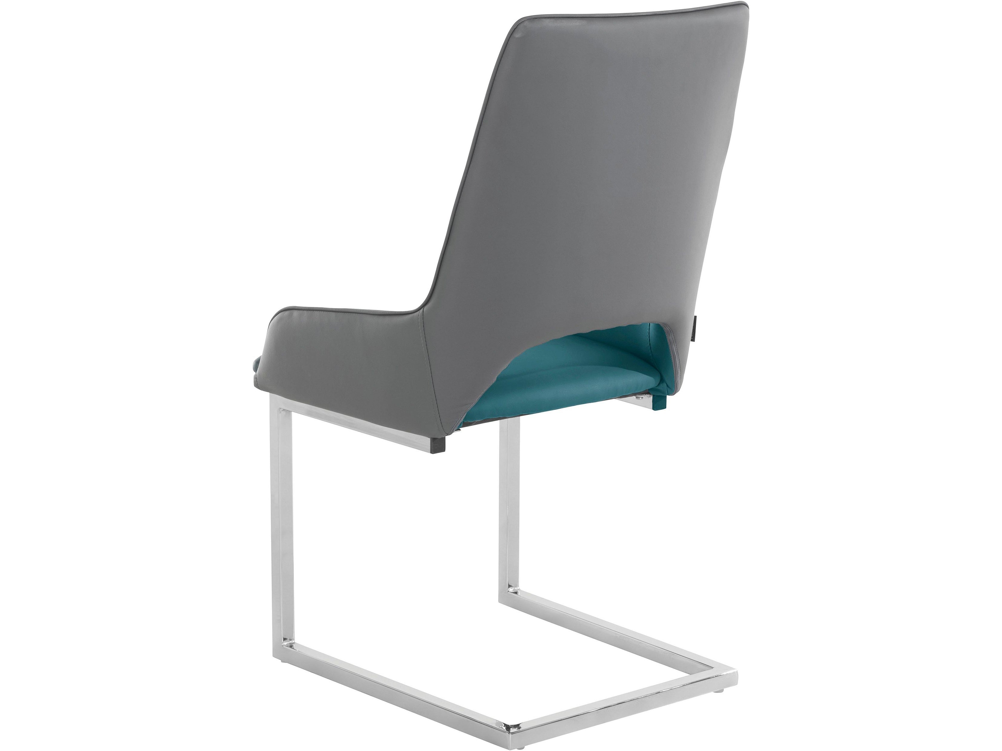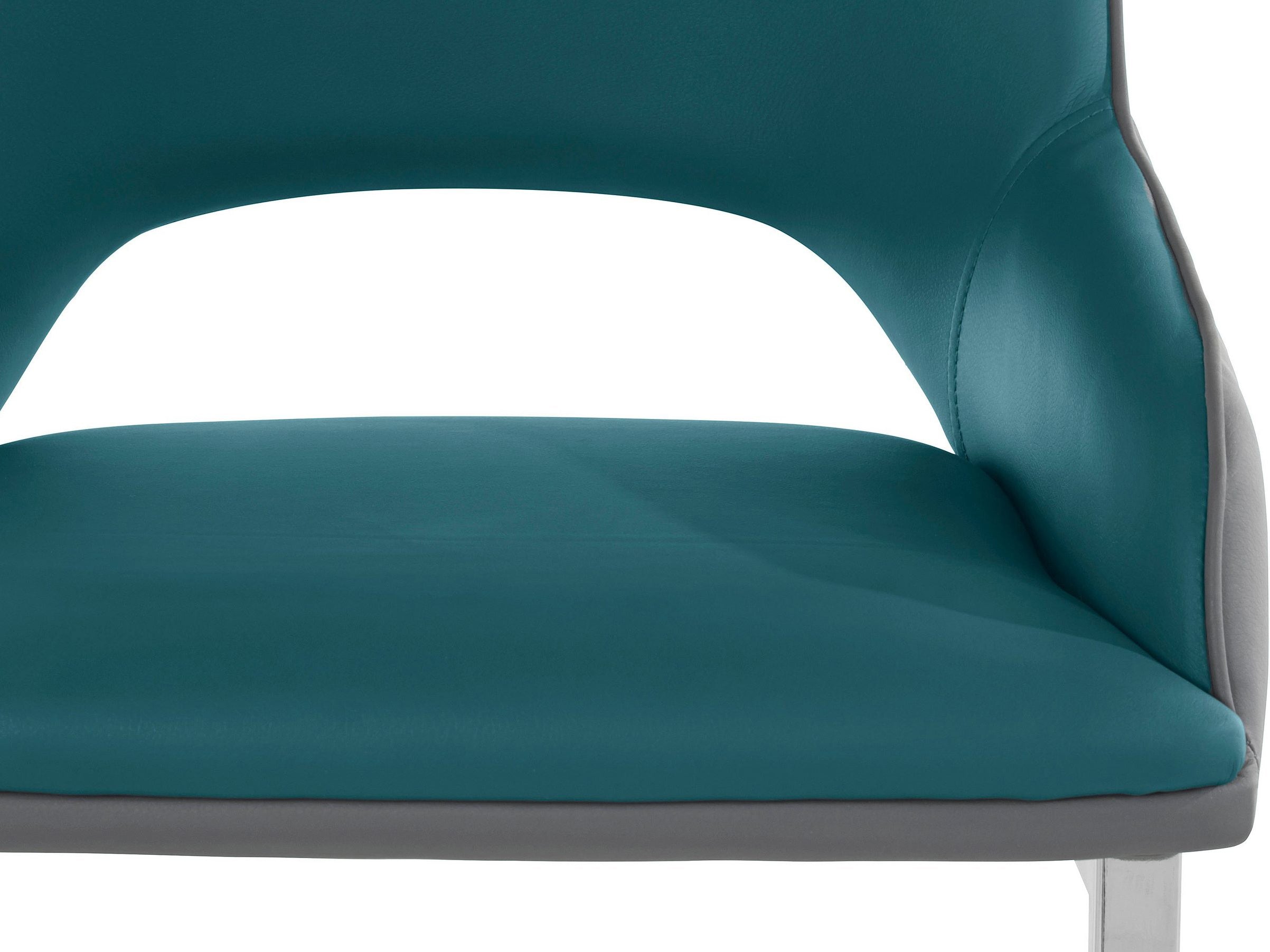 Den tofarvede spisestuestol har et trendy design. Den imponerer med moderne design med højt ryglæn og integrerede armlæn. Den kontrasterende farve giver denne stol sin beroligende appel. Dekorative fældede sømme og en fordybning i ryggen fuldender looket. Den kantede flade rørramme af metal, som har en forkromet overflade, passer godt til dette. Ryg og sæde er behageligt polstret og sikrer dermed en høj komfort.