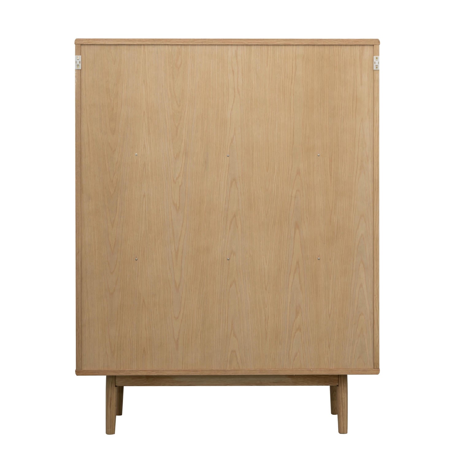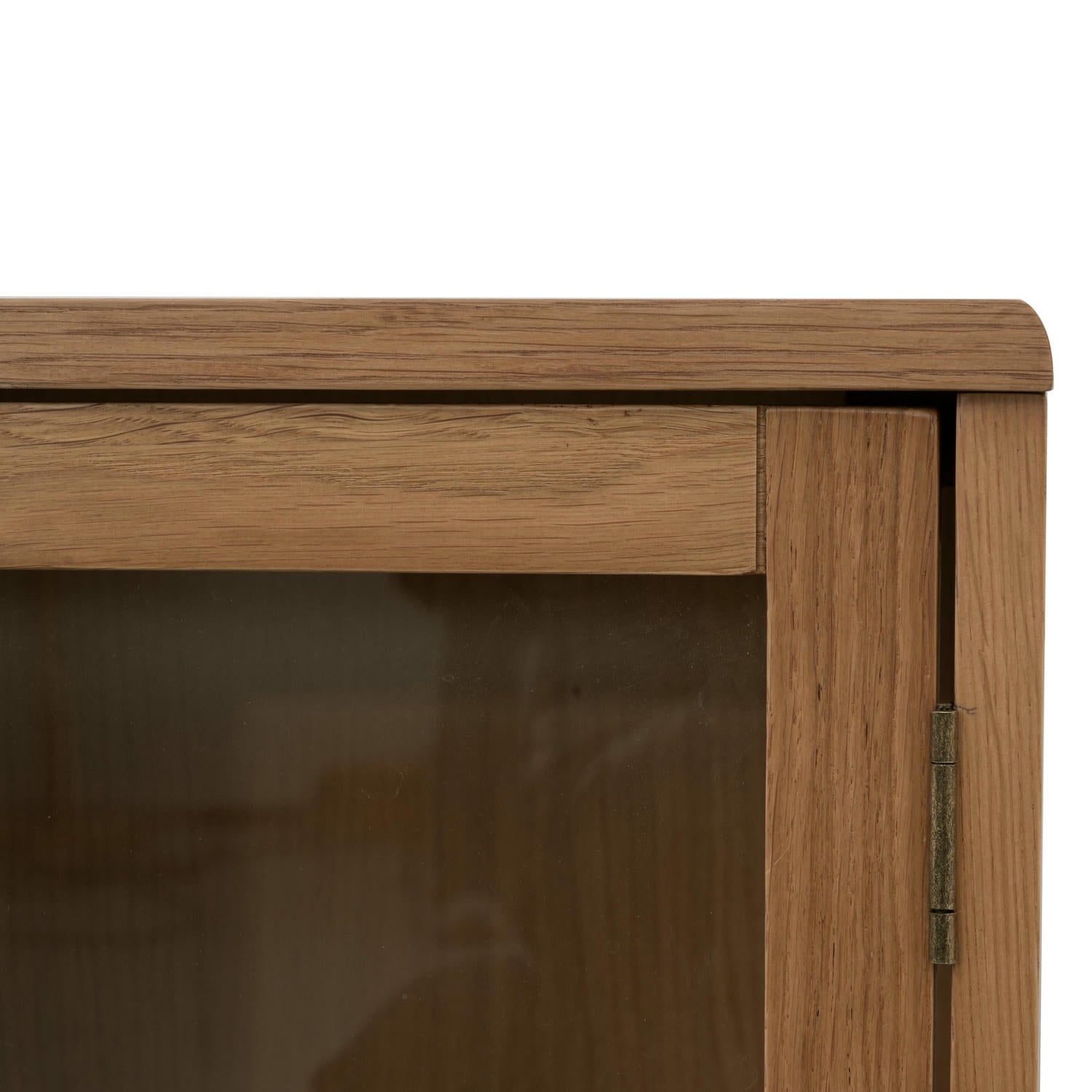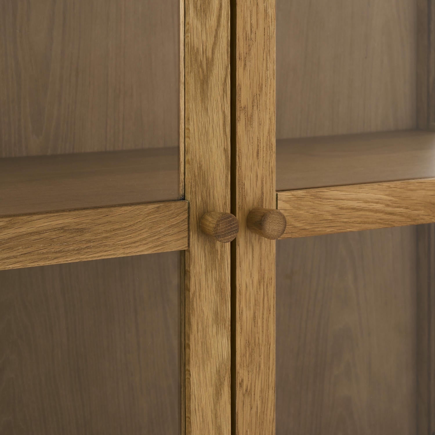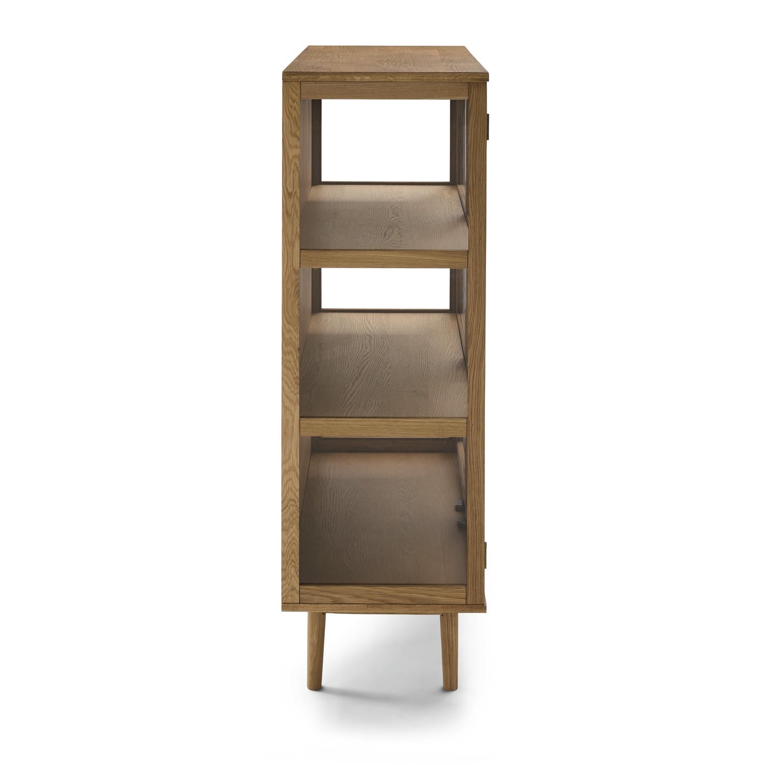 Highboard med stel og ben af massivt egetræ, hylder og bagpanel i MDF egefiner samt døre og sider af hærdet glas. To faste hylder, hver 18 mm tyk. Udført i naturlig lak for at fremhæve egetræet. Højde: 125 cm. Ben: 20 cm. FSC® certificeret træ. Ben kræver montering. Kun til indendørs brug.