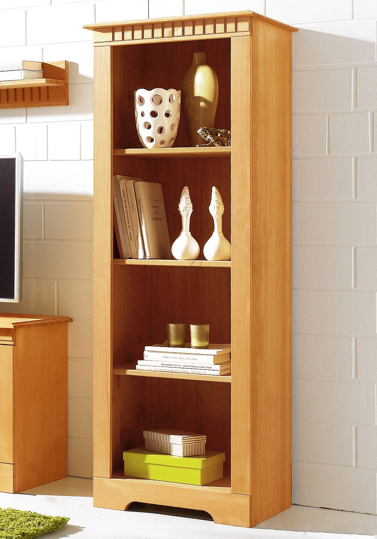 Denne formfulde hylde fra Home affaire præsenterer sig selv i en klassisk landlig stil. Dekorationen på overkanten giver den enkle ståhylde sin særlige charme. De 3 indsatshylder kan justeres individuelt i højden efter behov. Takket være dens subtile form kan den på vidunderlig vis integreres i eksisterende indretningsstile. Materialet er lavet af FSC®-certificeret massivt træ. Hvad enten det drejer sig om bøger eller legetøj, tilbyder Home affaire landstedshylden masser af opbevaringsplads og forbedrer visuelt hvert værelse.