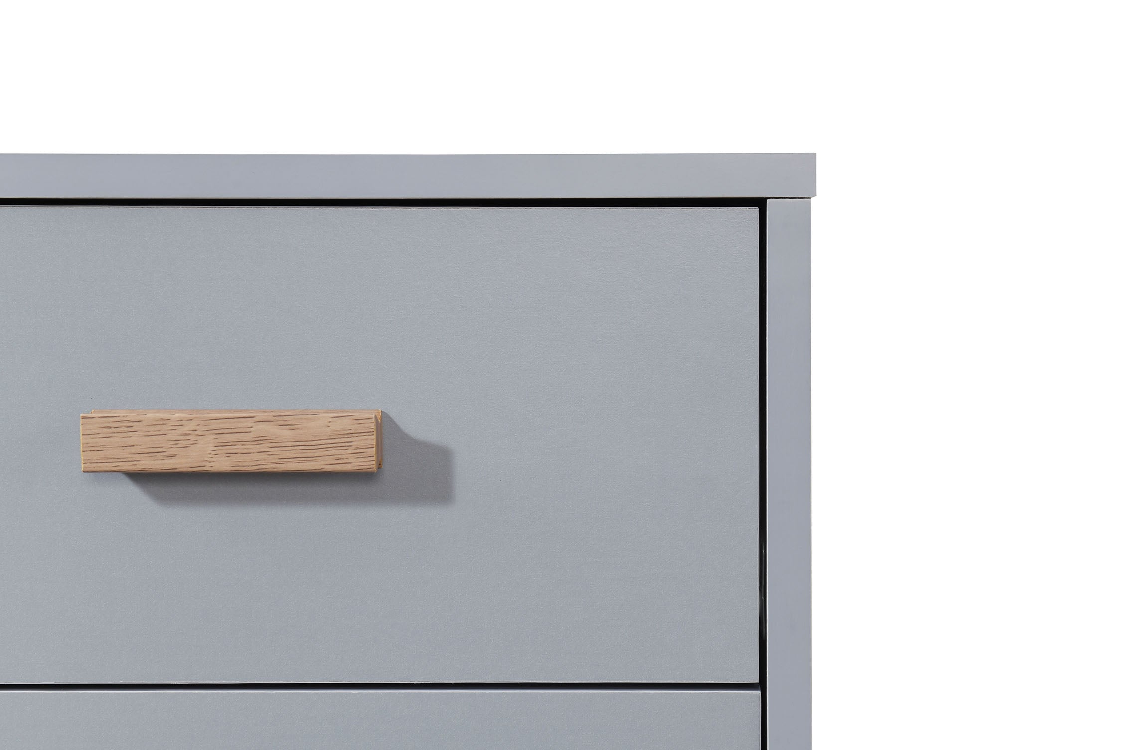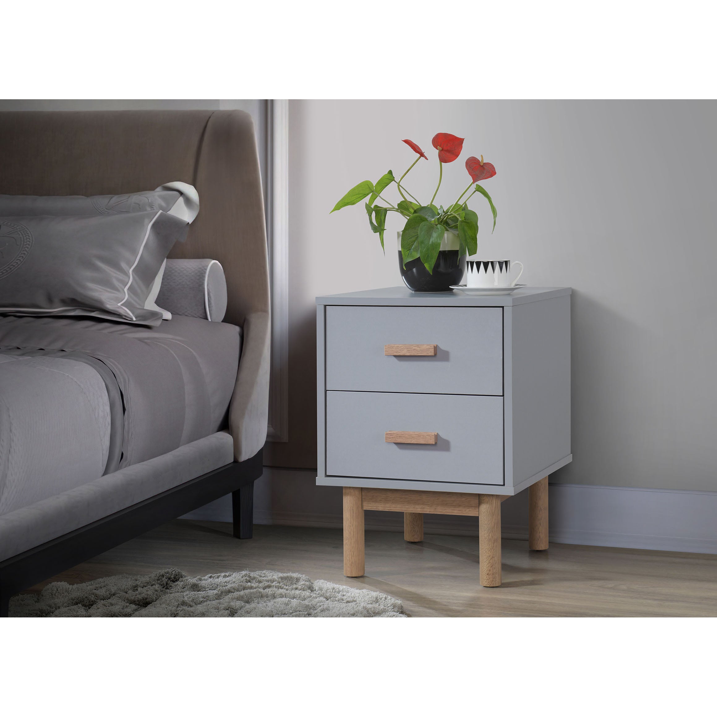 Natbordet er et dejligt og praktisk møbel, der vil fuldende dit soveværelse. Den har et korpus i grå farve, der giver det et rent og friskt look. Natbordet har to skuffer, der kan opbevare dine væsentlige ting. Skufferne har greb og ben i egetræslook, der tilfører et strejf af varme og kontrast. Natbordet har et klassisk og minimalistisk design, der passer til enhver stil.