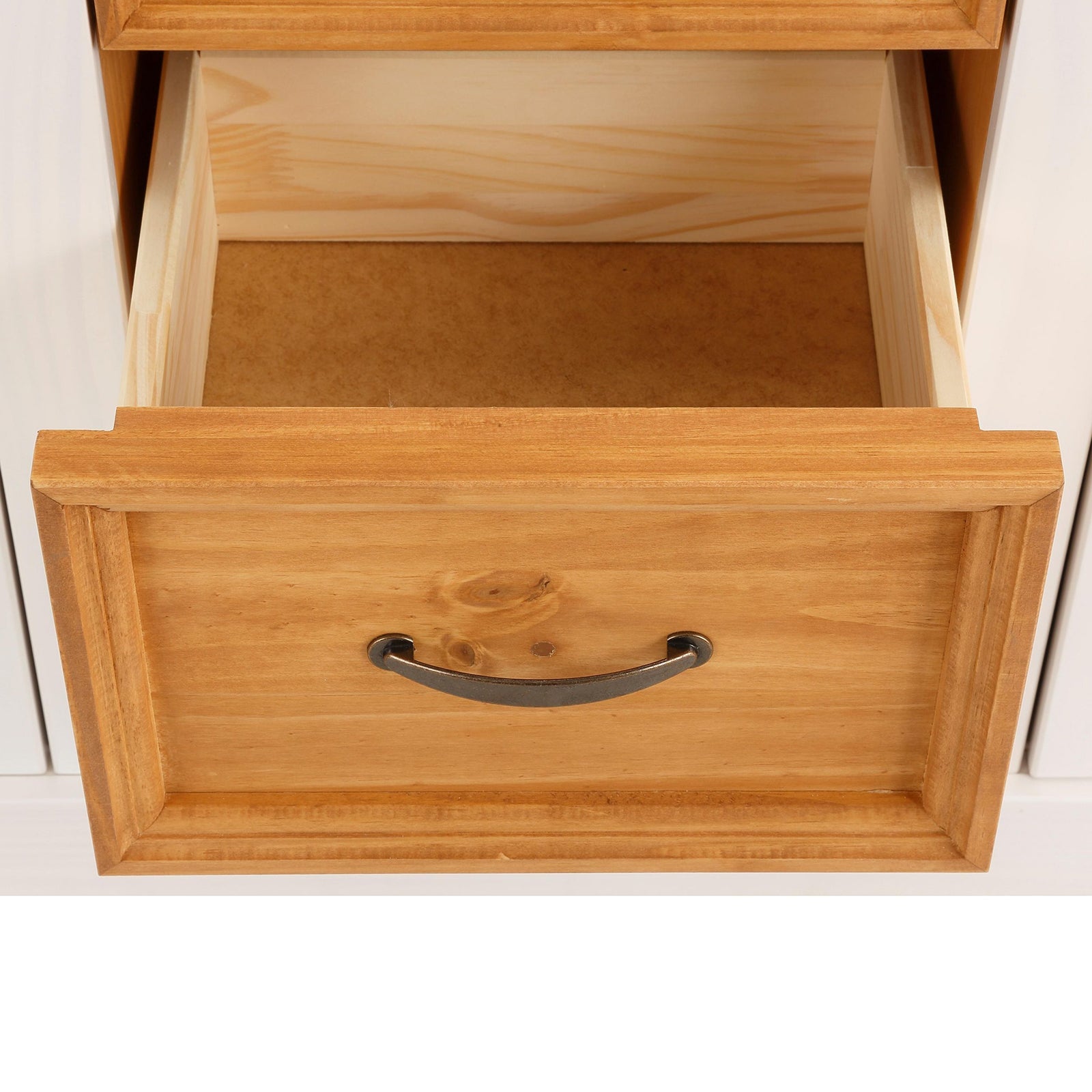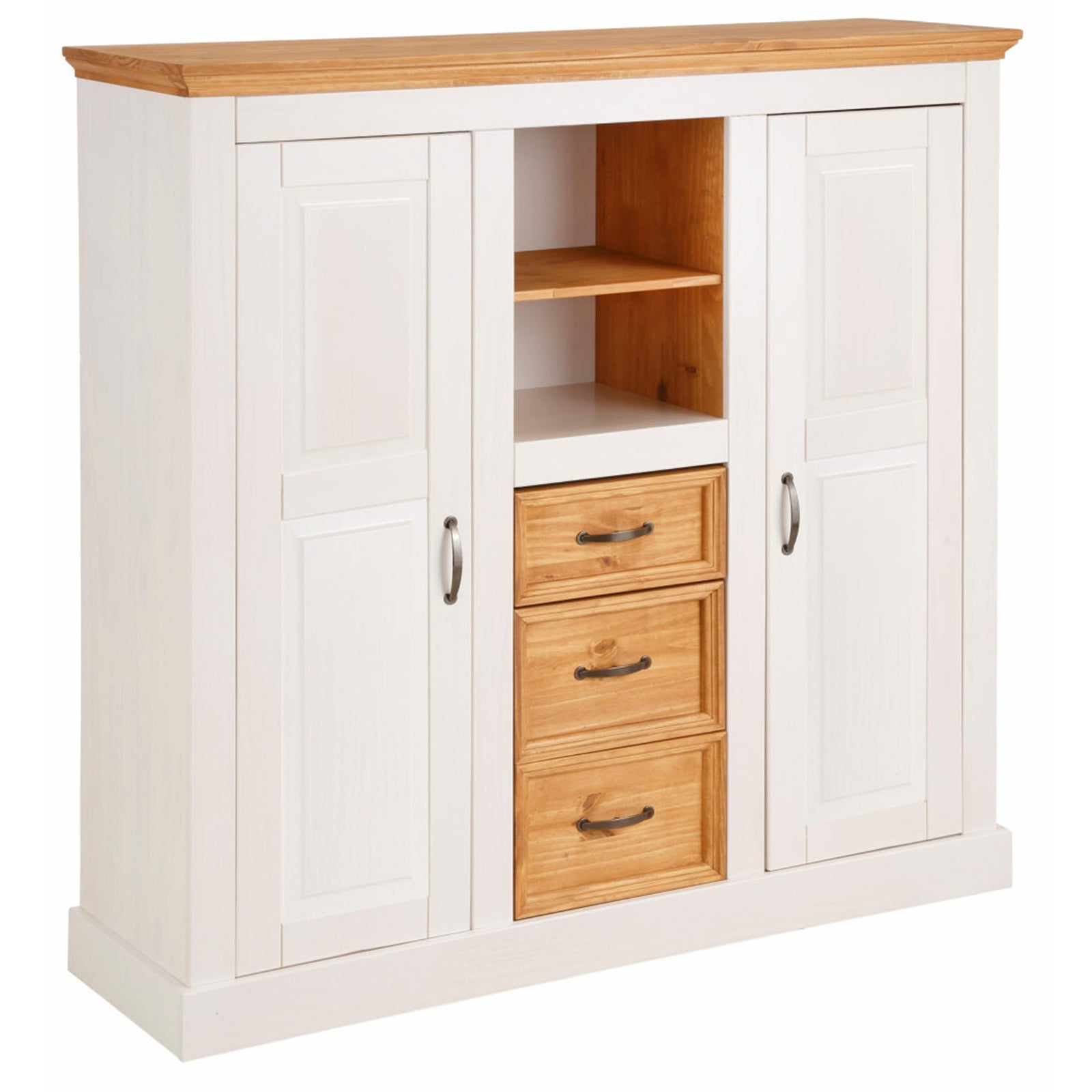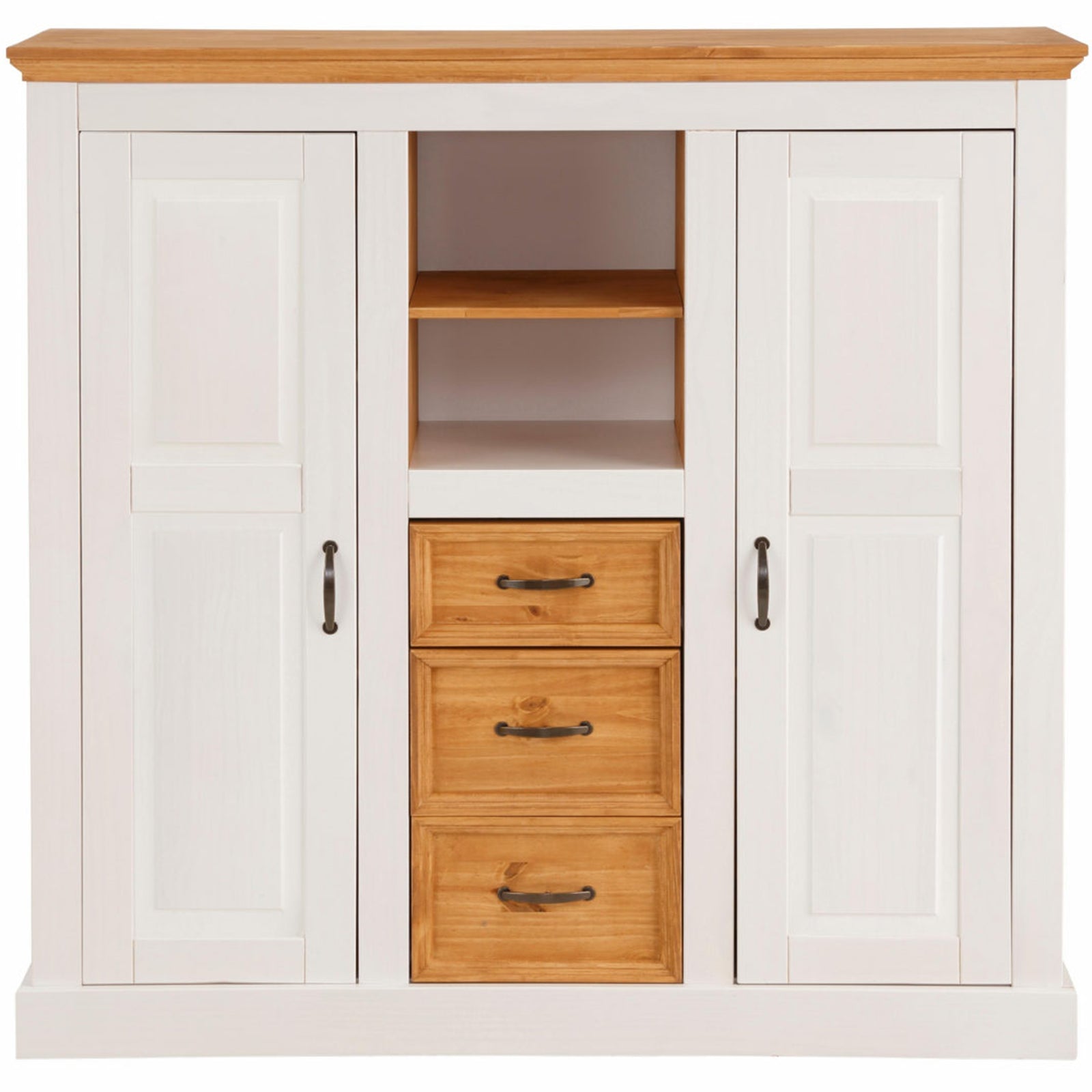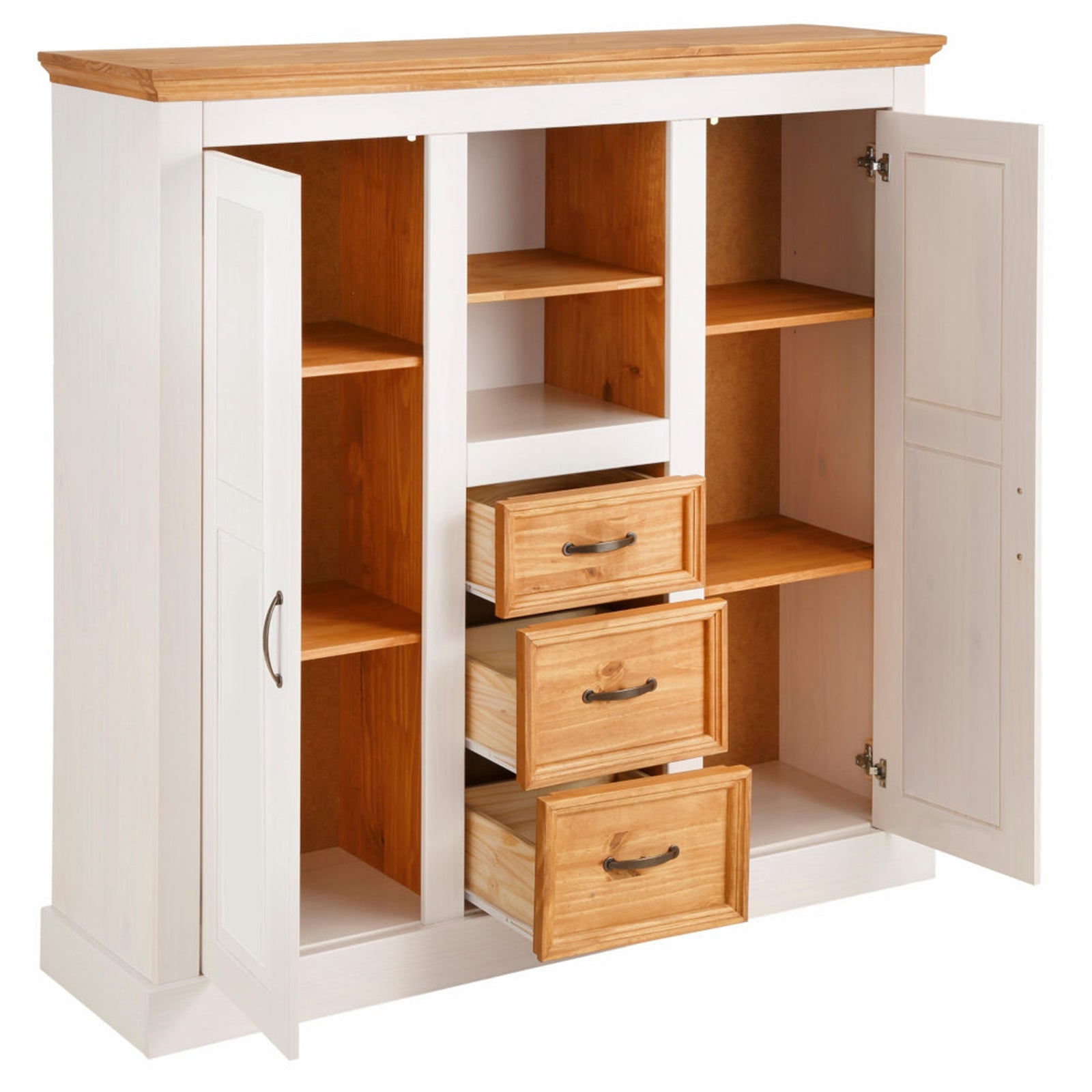 Forhøj dit rum med det stilfulde highboard i moderne skandinavisk design. Highboardet er lavet af FSC-certificeret massivt fyrretræ for en let pleje overflade og en robust bygning. 2 låger 2 skuffer og rum giver god plads til opbevaring af væsentlige ting. Dens design er kendetegnet ved en smuk farvekombination og antikke metalhåndtag. Highboardet kan nemt samles med den medfølgende hardwaretaske. Med tidløst design er dette highboard let at passe ind i alle indretningskoncepter og boligstile.