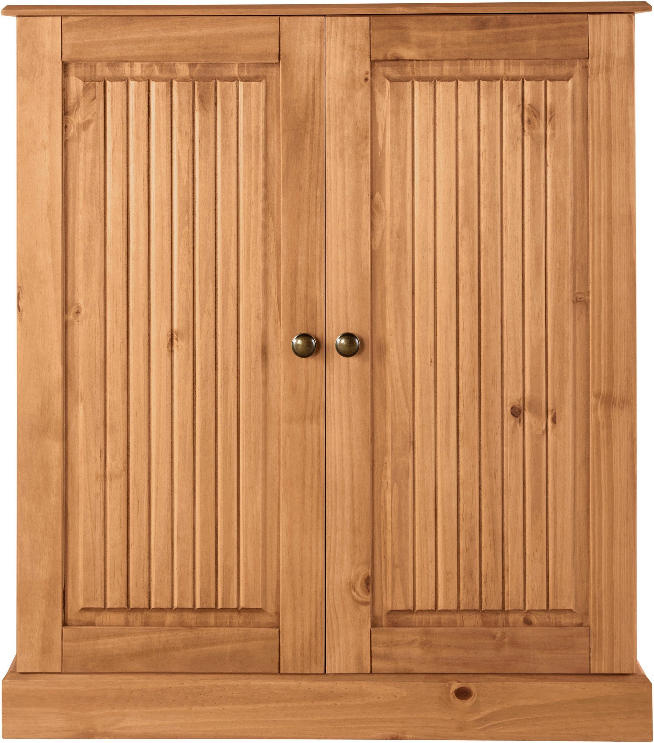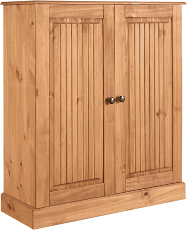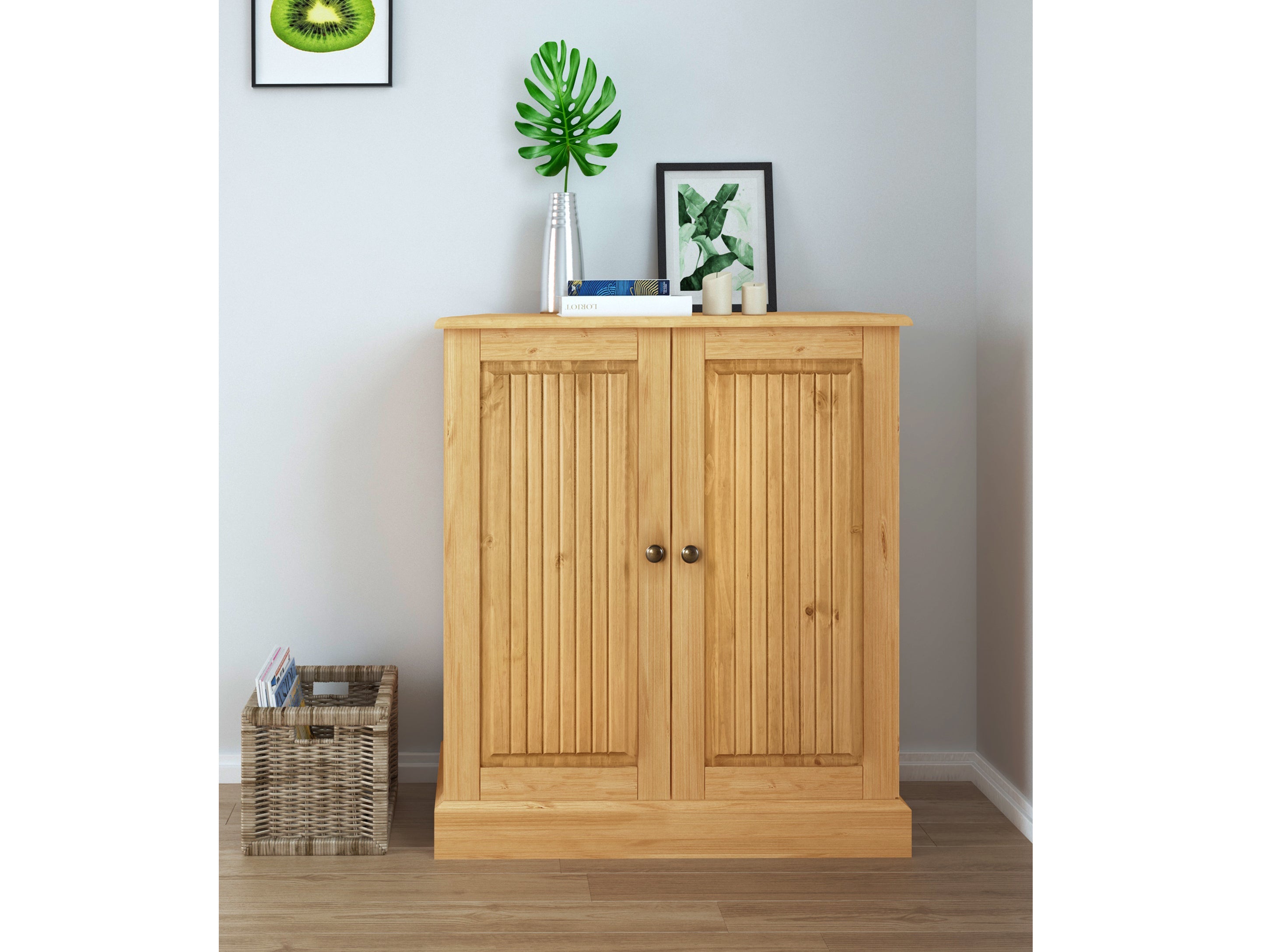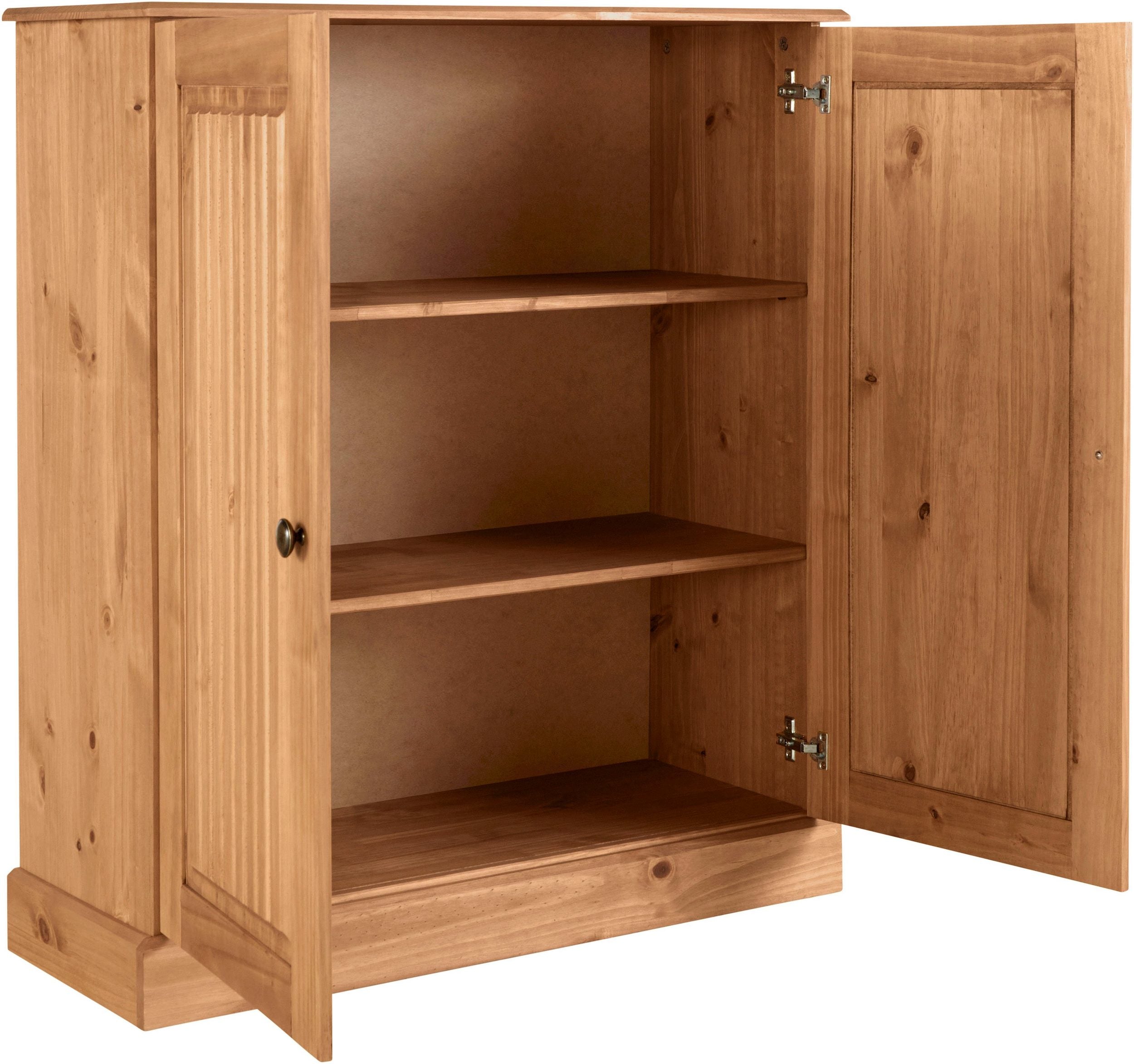 Klæderskabet lavet af massivt træ sikrer en naturlig boligstemning og vil holde i lang tid takket være design af høj kvalitet. Som en stabil og langtidsholdbar ledsager kan hylderne bruges variabelt med forskellig højde på de enkelte rum. Lakken på overfladen er beregnet til at beskytte træet mod fugt og snavs. Metalhåndtagene er holdbare og fremhæver stilen. Skabet står på piedestaler. Vægten er jævnt fordelt og gulvet nedenunder aflastes. Den maksimale lastekapacitet er omkring 50 kg.