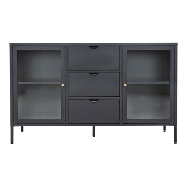 Skænk, 2 glaslåger, 3 skuffer, stål, sort, 140x40x85 cm
