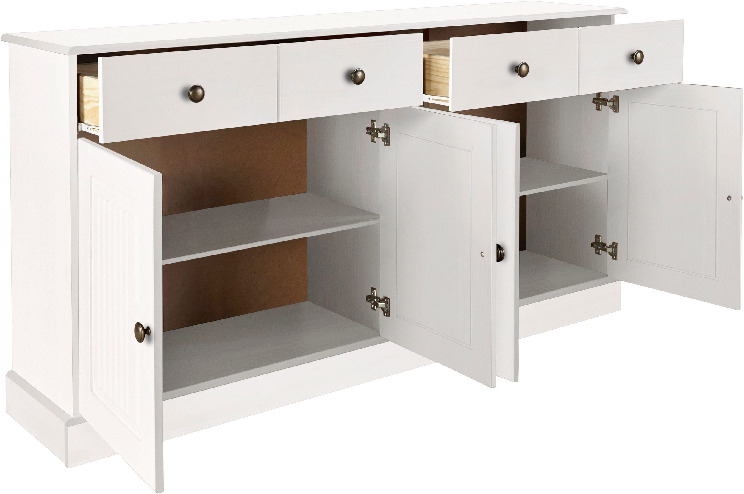Forbedr din plads med vores praktiske skænk med to visuelt tiltalende skuffer, der ligner fire og to justerbare hylder til alsidig opbevaring. Dette kompakte skab er fremstillet af FSC®-certificeret massivt fyrretræ og passer perfekt til dit soveværelse eller spiseplads i stuen. De fuldt udtrækkelige skuffer og tilpasselige hyldehøjder giver fleksibilitet, mens de holdbare metalhåndtag tilføjer et stilfuldt touch. Med en bæreevne på op til 50 kg står dette stabile stykke på piedestaler for ekstra støtte.