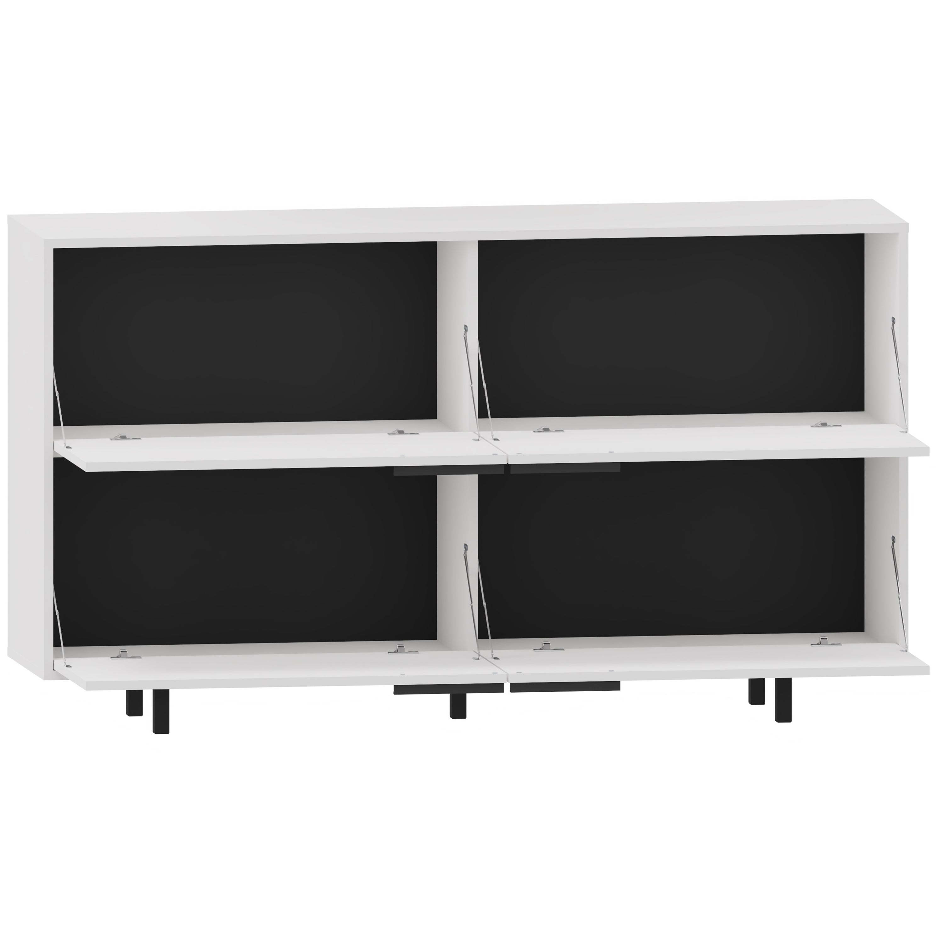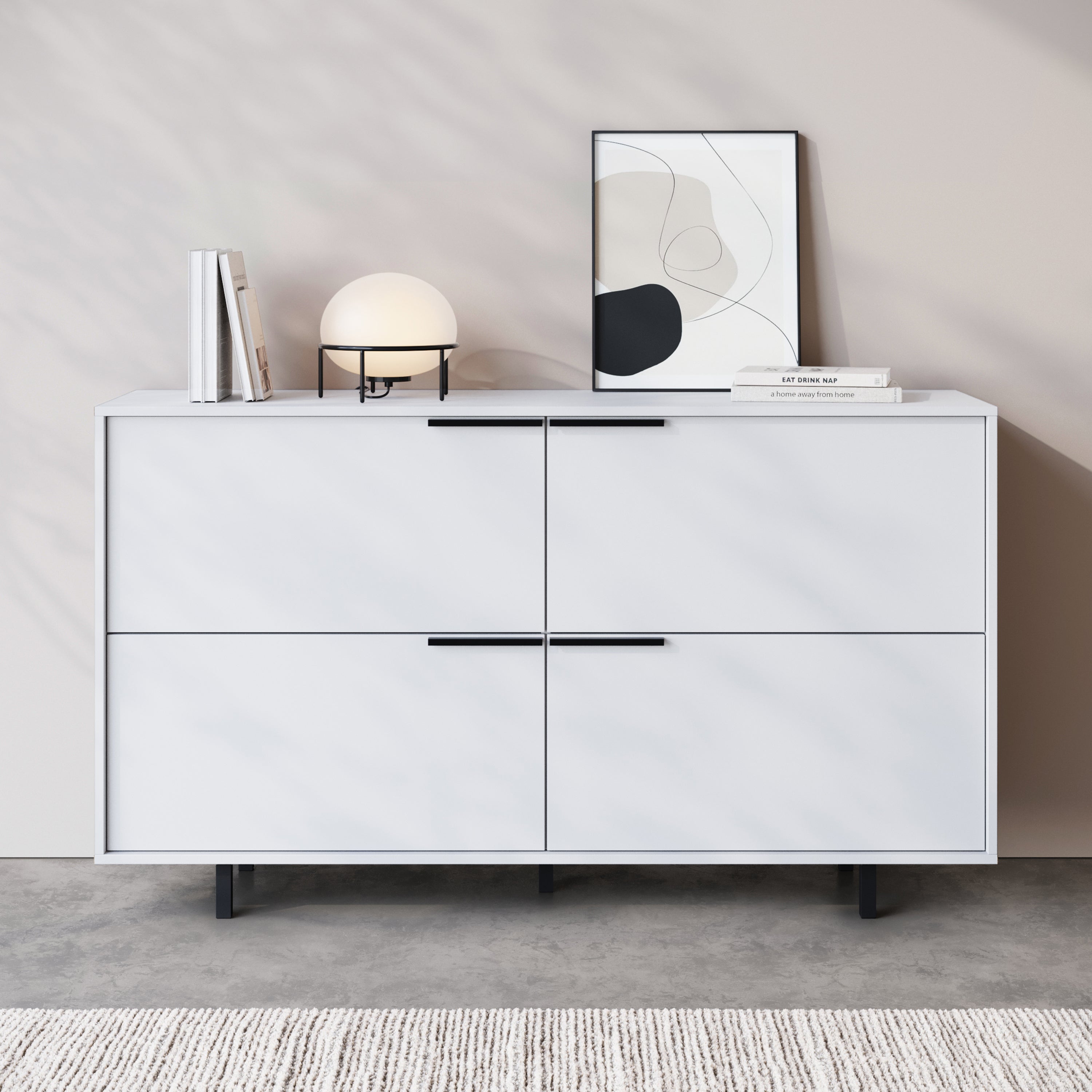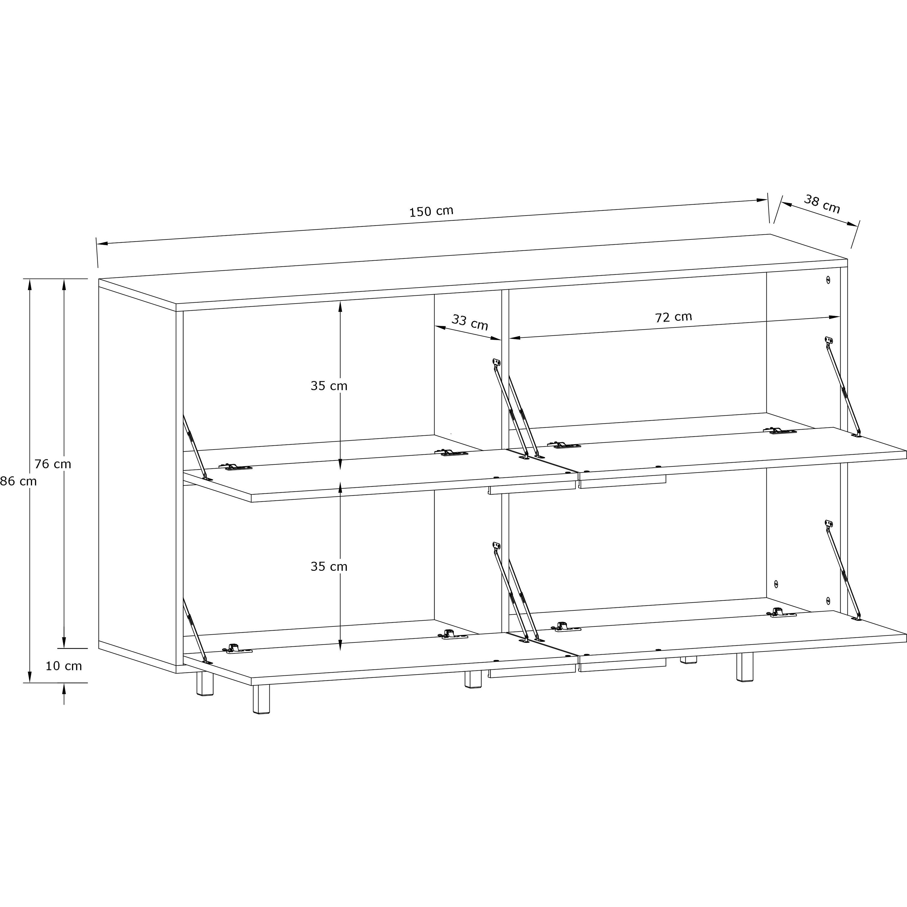 Denne skænk lavet af FSC-certificeret træ kombinerer kvalitet med stil. Dens hvide finish komplementerer ethvert rum. Med fire klapper giver den rigelig opbevaringsplads, mens de sorte plastikhåndtag giver en moderne accent. De sorte metalben sikrer ikke kun stabilitet, men tilføjer også et slankt, moderne look. Denne skænk måler cirka 150 cm i bredden, 38 cm i dybden og 86 cm i højden, og passer perfekt ind i forskellige rum fra stuer til spisepladser. De fem ben øger dens stabilitet, hvilket gør det til et pålideligt møbel. Denne skænk er både praktisk og stilfuld, der problemfrit smelter ind i forskellige interiørstile og forbedrer dit hjems overordnede æstetik.