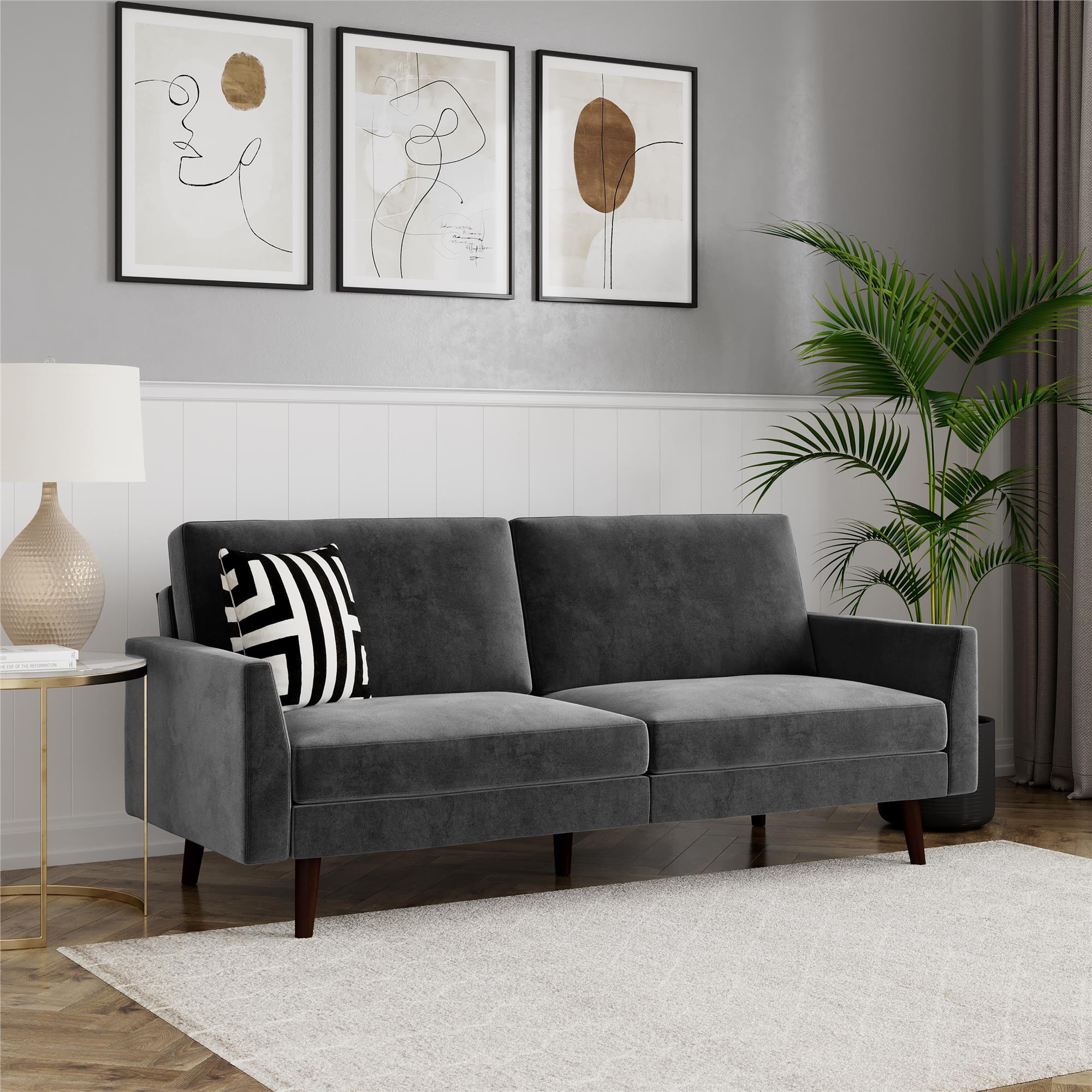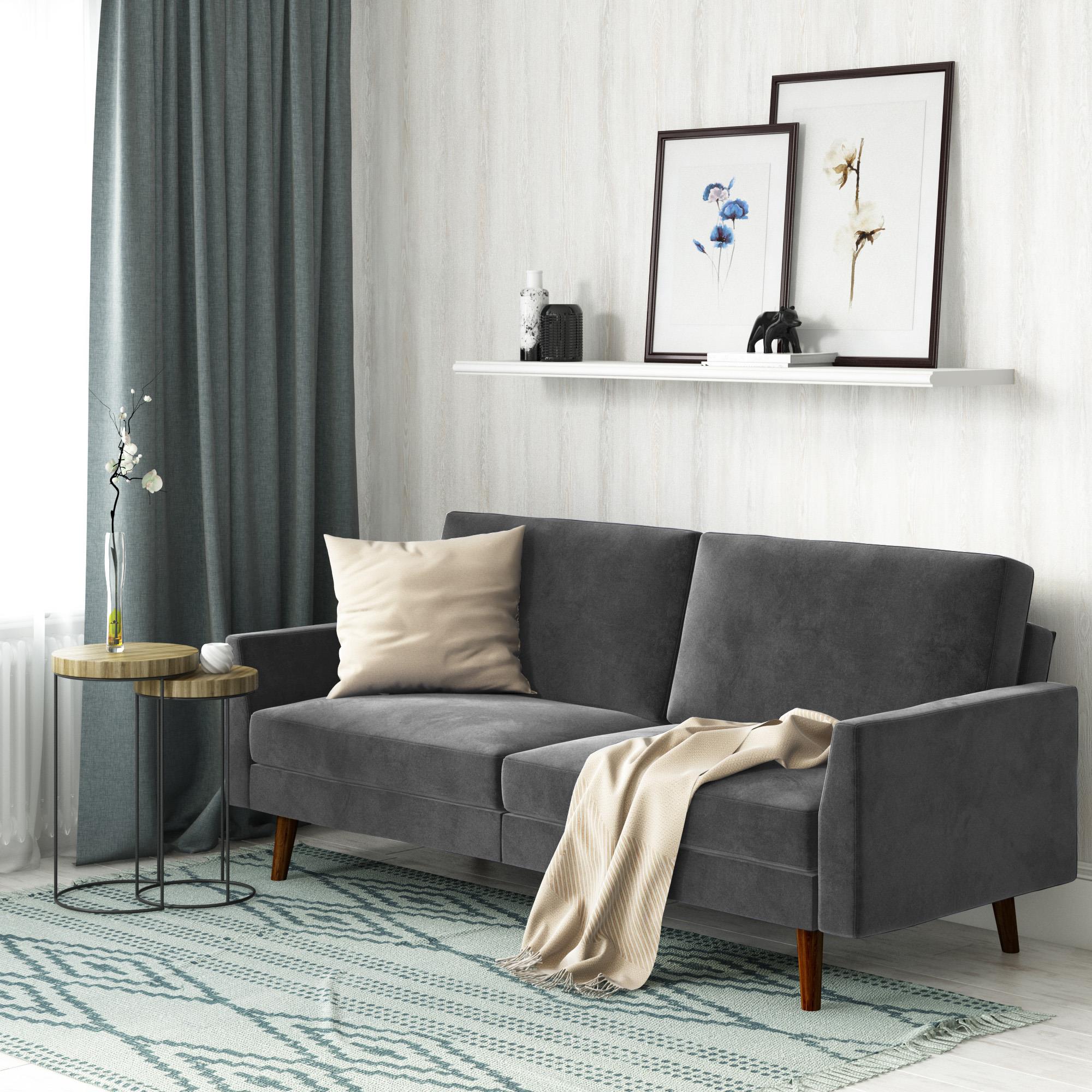 Sovesofa i et moderne og elegant design med sarte sporarme og skrå massive træben. Nem at folde sammen til en seng.