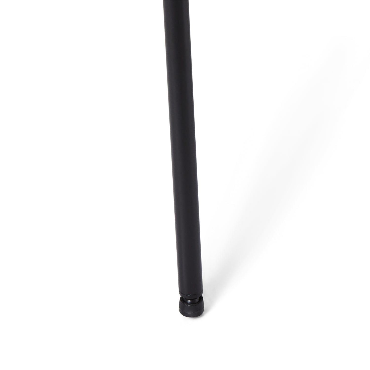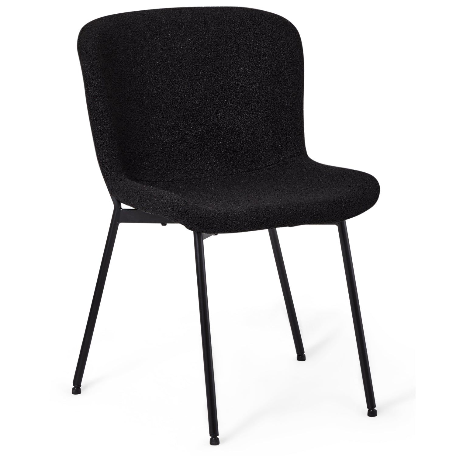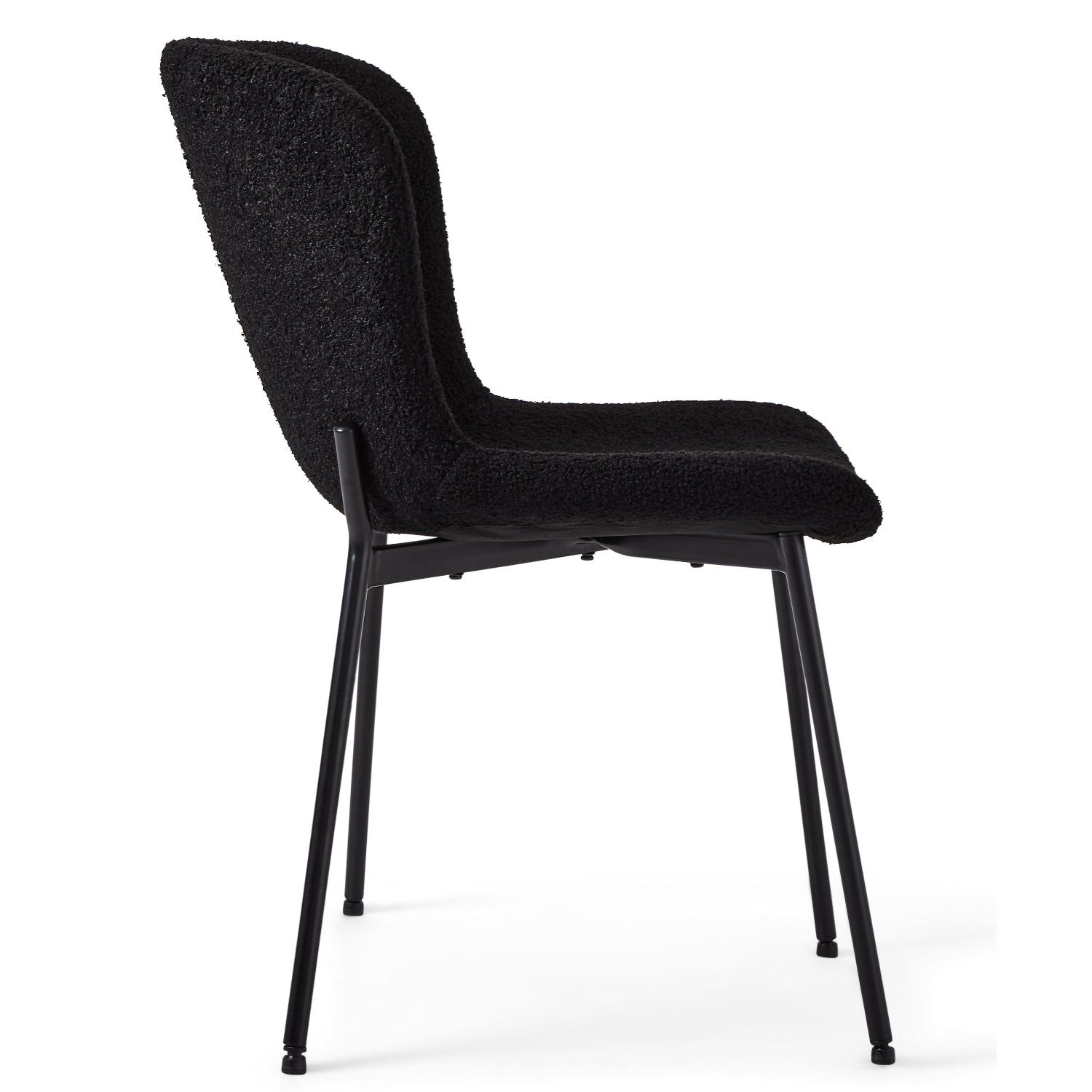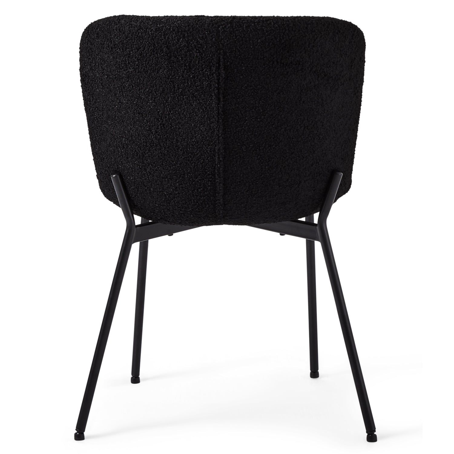 Teddy-stolen er betrukket med sort OEKO-TEX®-certificeret bouclé-stof (100 % polyester) og kombinerer komfort og stil. Det skumpolstrede sæde og ryglæn har en densitet på 24 kg/m³. En sort metalbenramme giver stabilitet. Mål er 61×52×80 cm. Sædet måler 49 cm i højden, 39 cm i dybden og 48 cm i bredden. Ryglænet tilføjer 39 cm over sædet. Med en vægt på 11 kg bærer stolen op til 100 kg. Kun indendørs brug. Leveres fladpakket. Montering påkrævet.