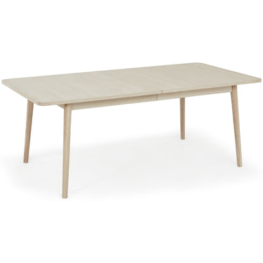 MDF bordplade i egefiner, hvid-olie finish, understøttet af massive træben. Forlængerfunktionen inkluderer to 50 cm brædder gemt indeni, der strækker sig fra 200 til 300 cm. Tilbyder plads til 6 til 10 personer. Bordhøjde 75 cm. Indendørs brug. Leveres i én pakke.