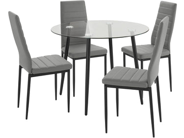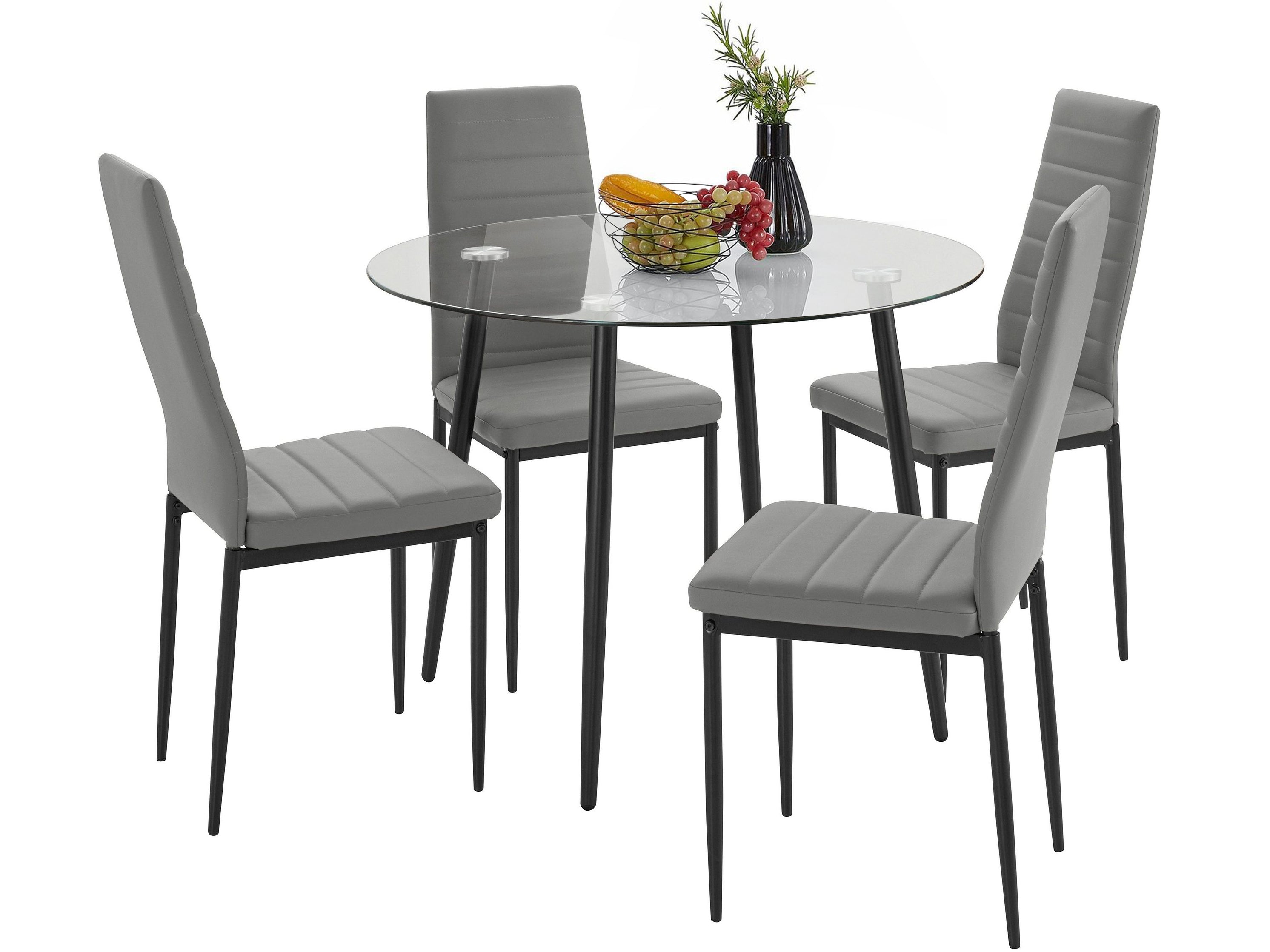Tilbyder komfortable siddepladser til dig og dine kære, spisegruppen med spisebord og polstrede stole. 5-delt bordgruppe i et tidløst design består af et spisebord med en klar glasplade og metalanvendelser. Fire 4 fods polstrede stole med sortmalet metalstel fuldender ensemblet. Stolene imponerer med et betræk lavet af easycare imiteret læder i en subtil farve. For høj siddekomfort kan stolene belastes op til maks. 120 kg. Med deres komfortable siddedybde og -højde inviterer spisestuestolene dig til at blive hængende og snakke. Den passer ubesværet ind i adskillige boligstile.