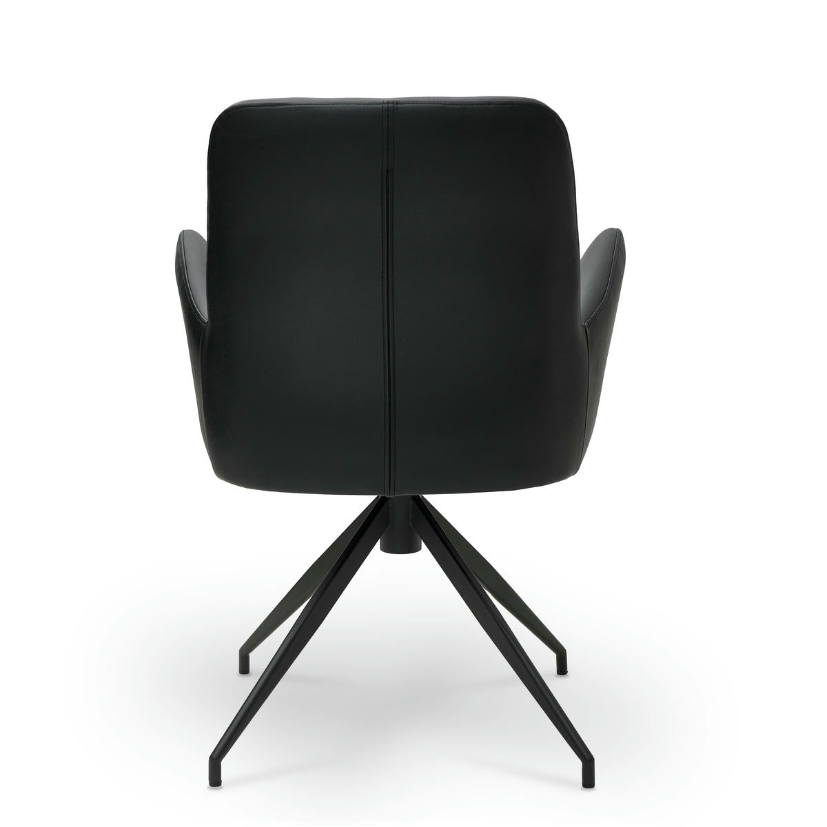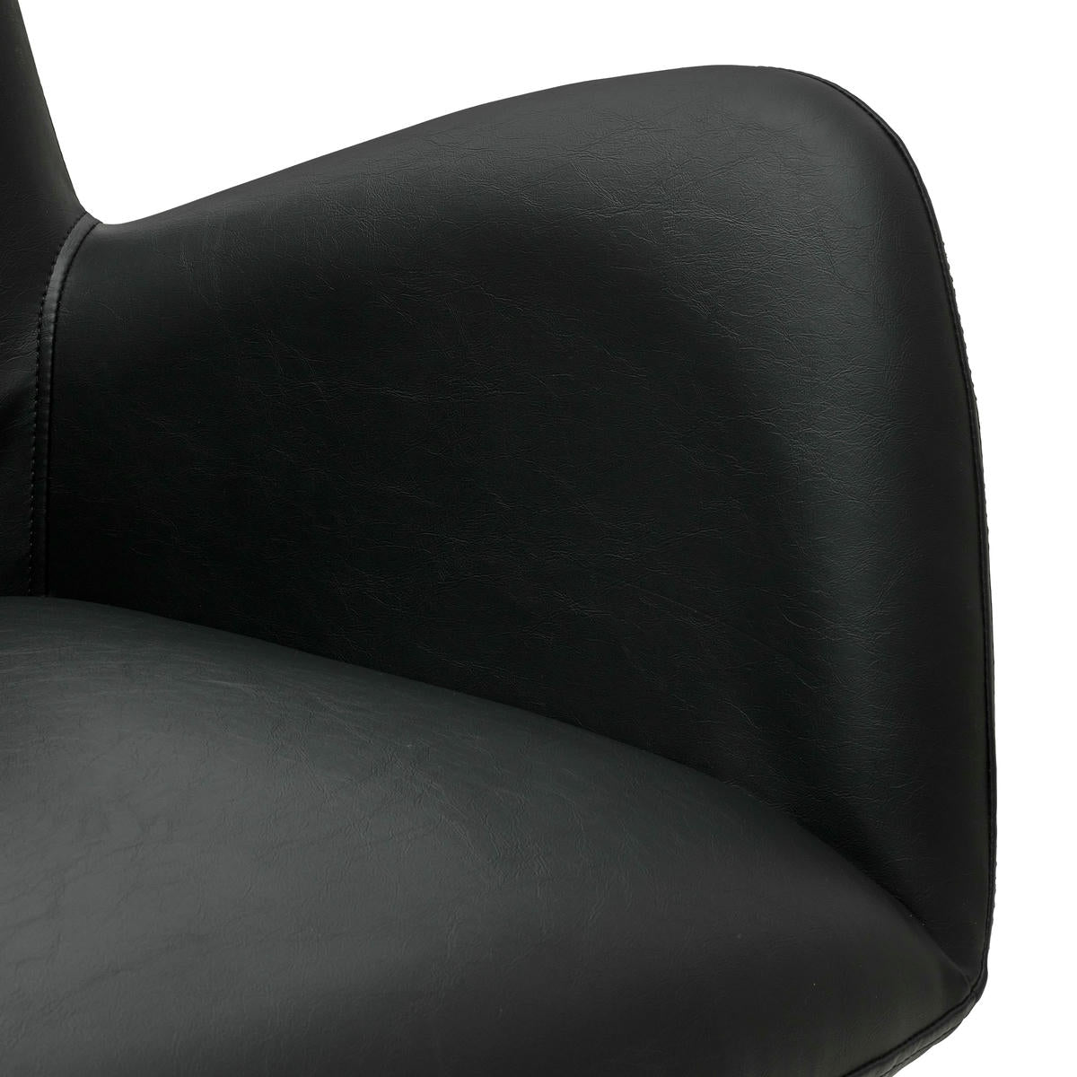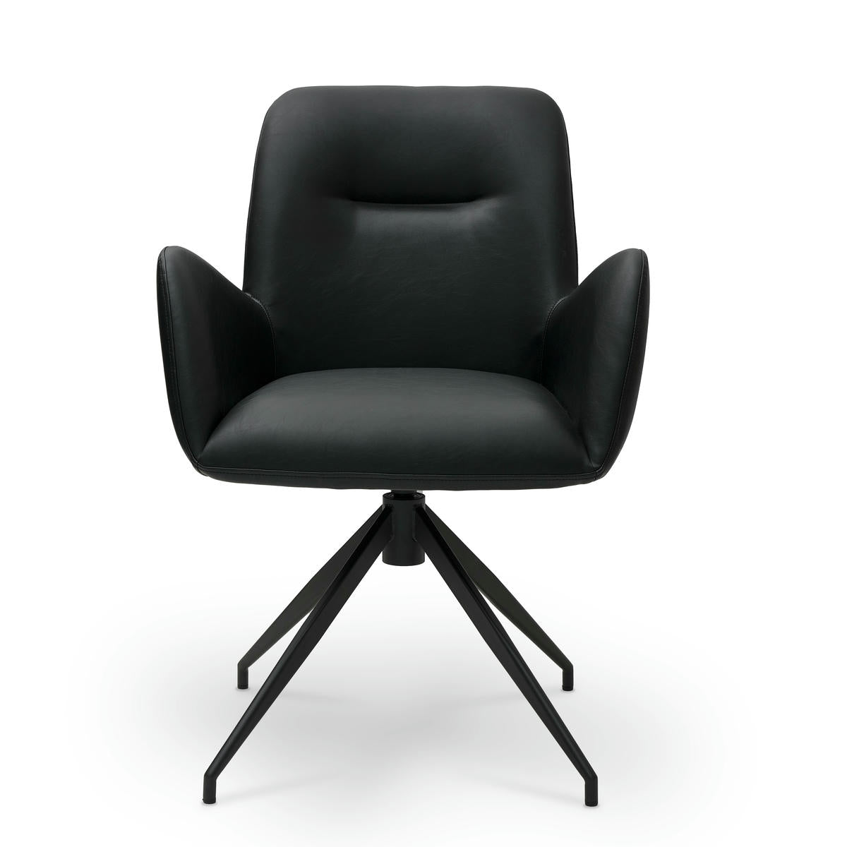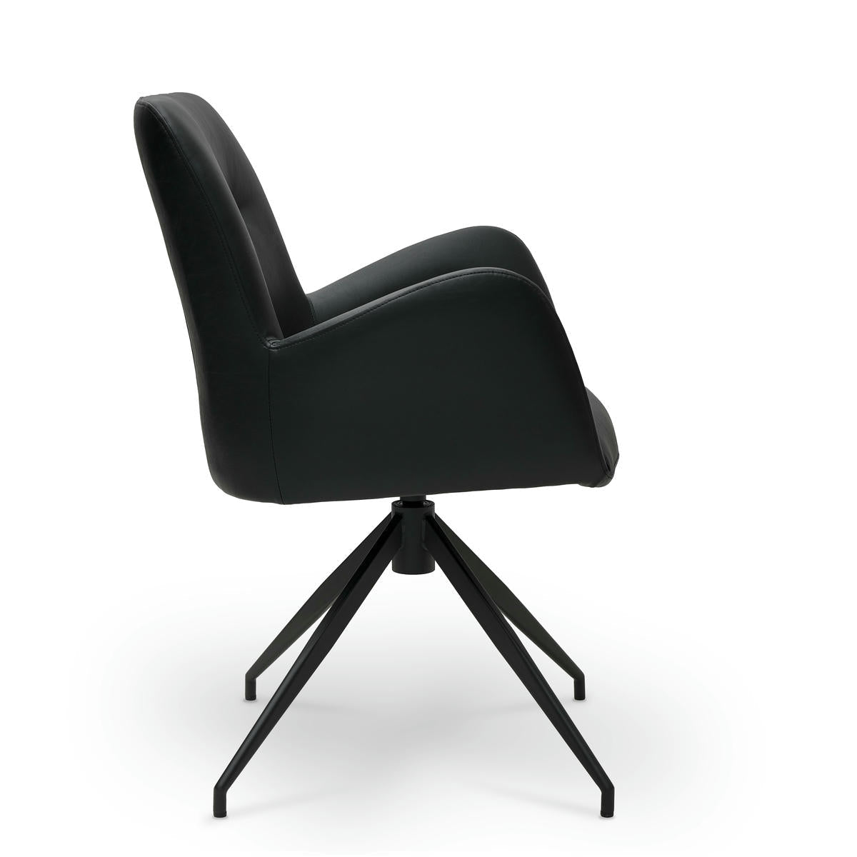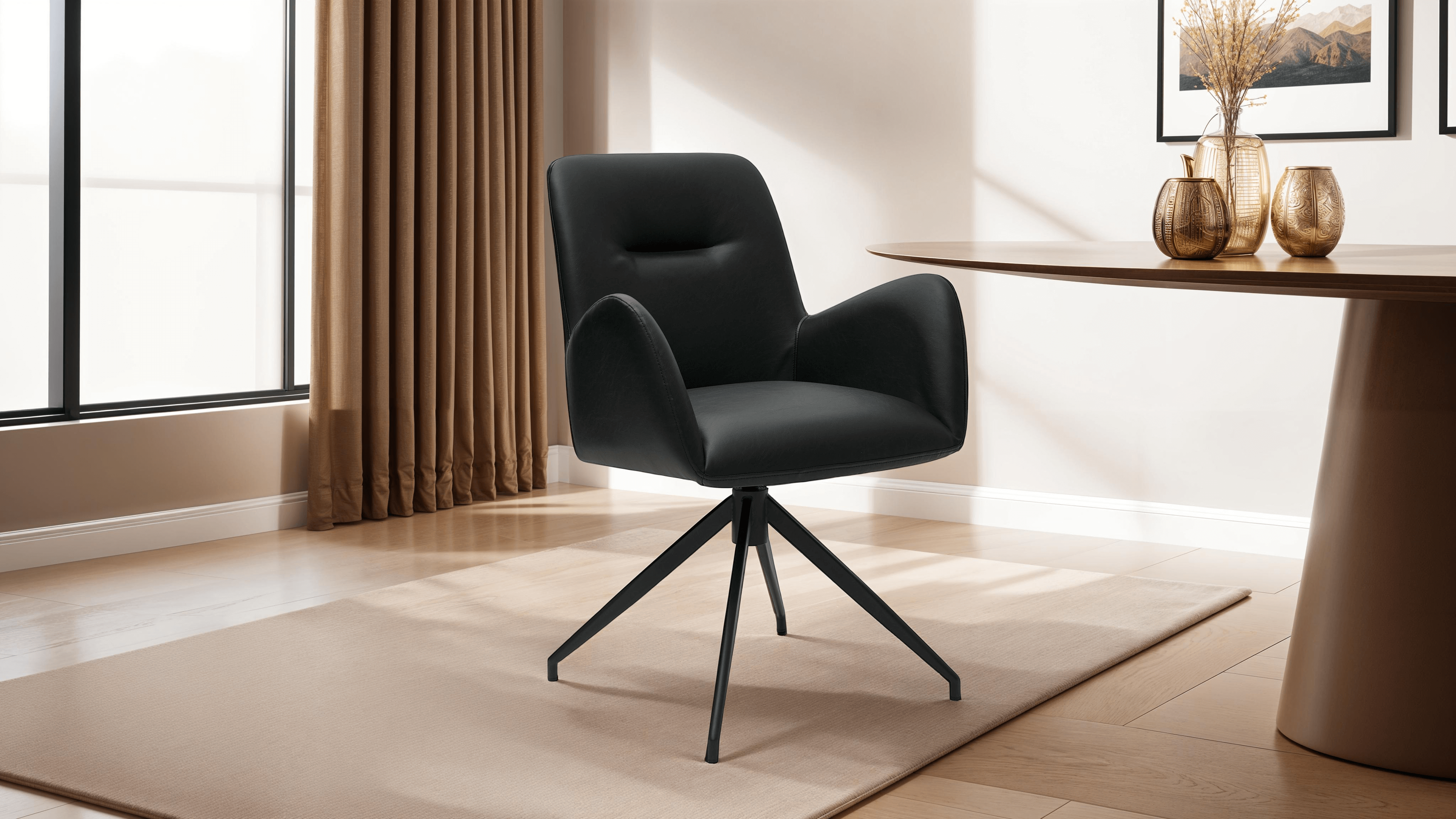 Jennifer spisestuestolen er Pris pr. stk skal bestilles parvis. med sort kunstlæder lavet af 100% polyurethan. Den har et skumfyldt sæde og ryglæn med en densitet på 35 kg/m³ for fast siddekomfort. Stolen har et 360° drejeligt sæde og en tilbagevendende funktion, der giver fuld fleksibilitet. Den står på et centralt sort metalben og har dimensioner på 64 cm i længden, 61 cm i bredden og 86 cm i højden. Sædet er 50 cm højt, 41 cm dybt og 45 cm bredt. Armlænene er 68 cm høje og 6 cm brede, mens ryglænet går 42 cm ud fra sædet. Stolen vejer 10 kg, støtter op til 100 kg og kommer i to pakker. Designet til indendørs brug. Montering påkrævet. Rengør med en let fugtig klud.