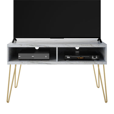 Moderne glam og industrielle stilarter samles i denne tv-stand. Denne enkle, men stilfulde tv-stander lavet af PVC-lamineret spånplade har et slankt design, der er ideelt til mindre rum. Har en imiteret hvid marmorfinish for en øjeblikkelig opgradering af dit rum.