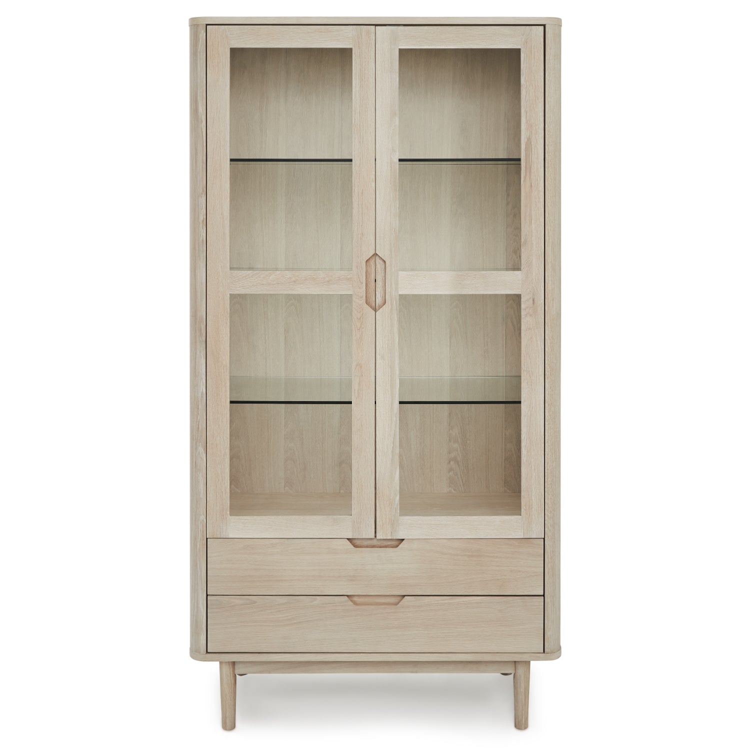Vitrineskab i massivt træ, egefiner og MDF med hvid-olie finish. To glas- og finerlåger, to skuffer og seks justerbare hylder. Dæmpbar LED-belysning og soft-close system. Højde: 190 cm. Ben: 20 cm. Montering påkrævet til ben. Kun indendørs brug.