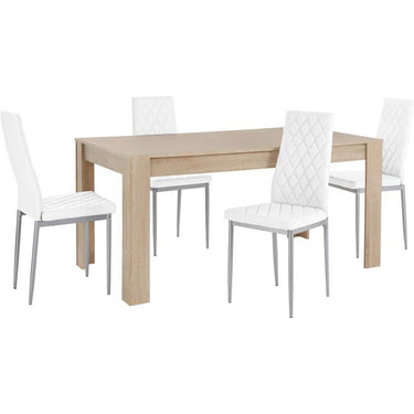 Det nye center i din spisestue, hvor du kan samle dine kære. Med dette 5-delte spisebordssæt med en firkantet bordplade og fire komfortable spisestuestole fås i forskellige farver og bordstørrelser. Det rektangulære spisebord imponerer med sit naturlige trædesign og de robuste fire bordben. Stolenes designmæssige højdepunkter inkluderer den diamantformede quiltning, der pryder ryglænene. Et FSC®-certificeret træbaseret materiale blev brugt til at fremstille bordplader, der fås i en blanding af stilarter.