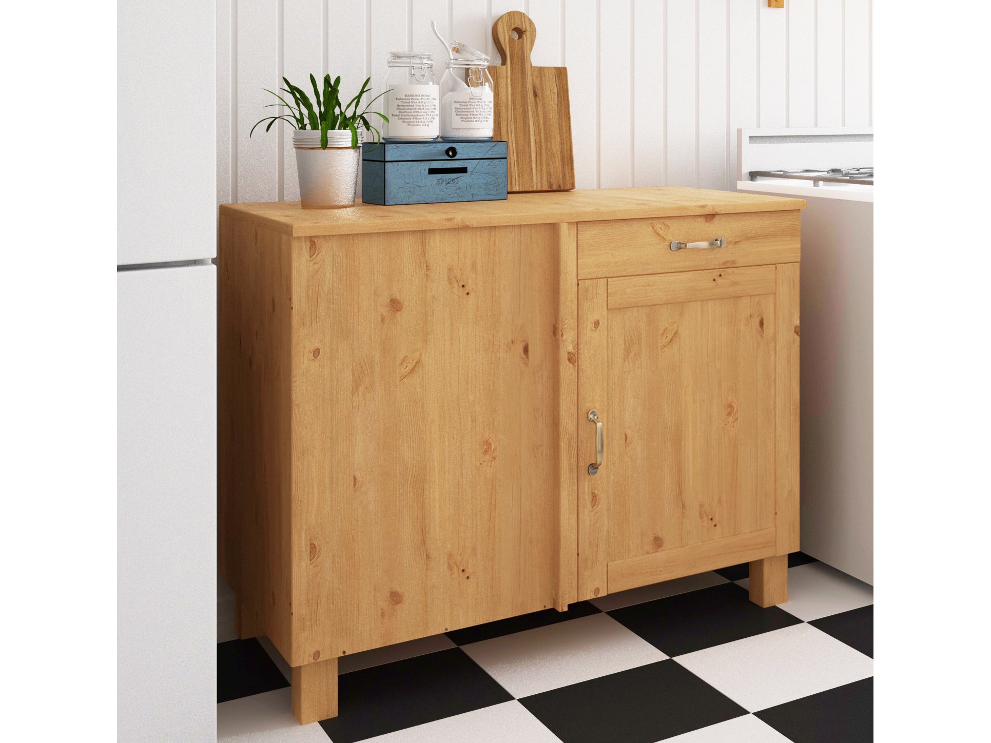Med hjørnebasen kommer moderne country chic ind i køkkenet. Frontkroppen og bordpladen på køkkenskabet af høj kvalitet er lavet af massivt fyrretræ. FSC®-certificeringen garanterer en absolut miljøvenlig produktion. Køkkenunderskabet kan også rigtig godt kombineres med andre stilarter på grund af de forskellige farvekombinationer. Der er også mulighed for at kombinere skabet med andre elementer fra serien. Den komplette køkkenblok kan også bestilles som sparesæt. Den robuste bordplade er nem at rengøre skuffen på metalskinner og skabslågen har flotte metalgreb. Det gør hjørneunderskabet til en skøn og samtidig praktisk hjørneløsning med et landligt udtryk.