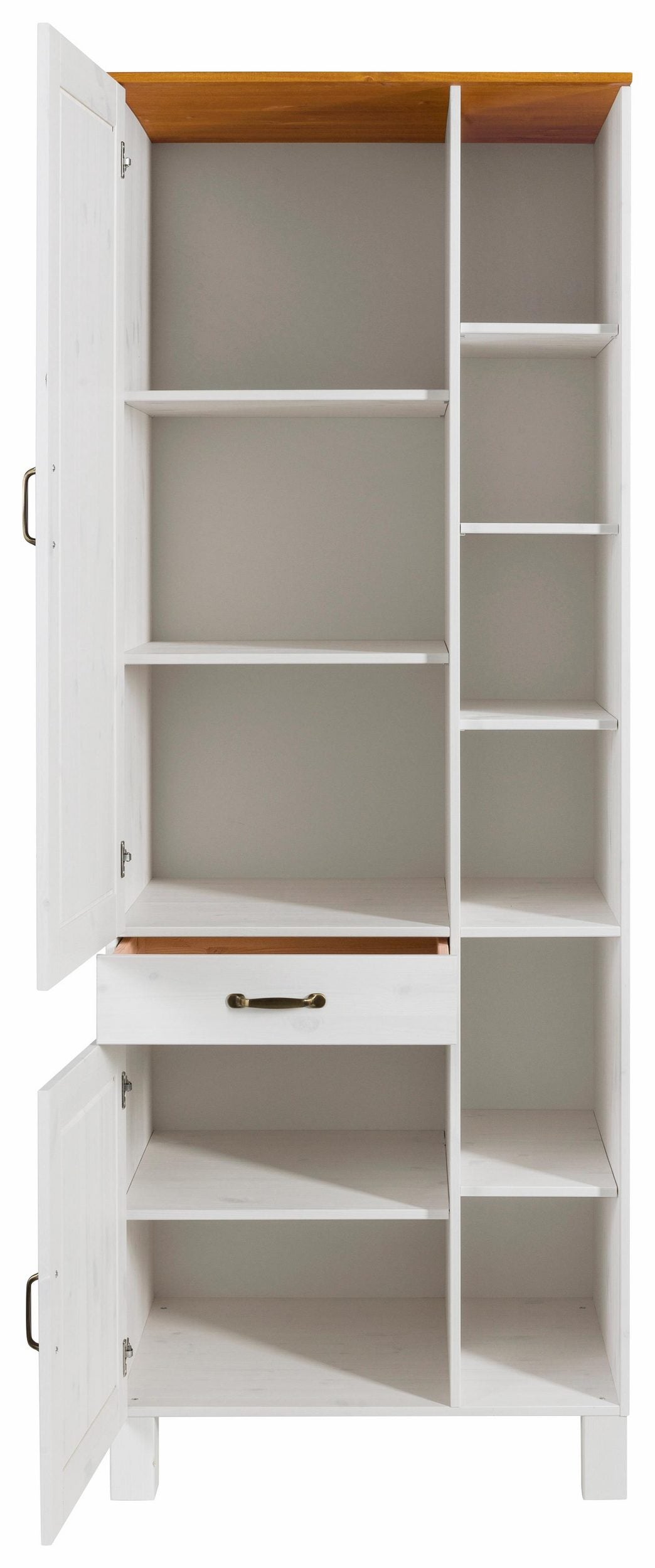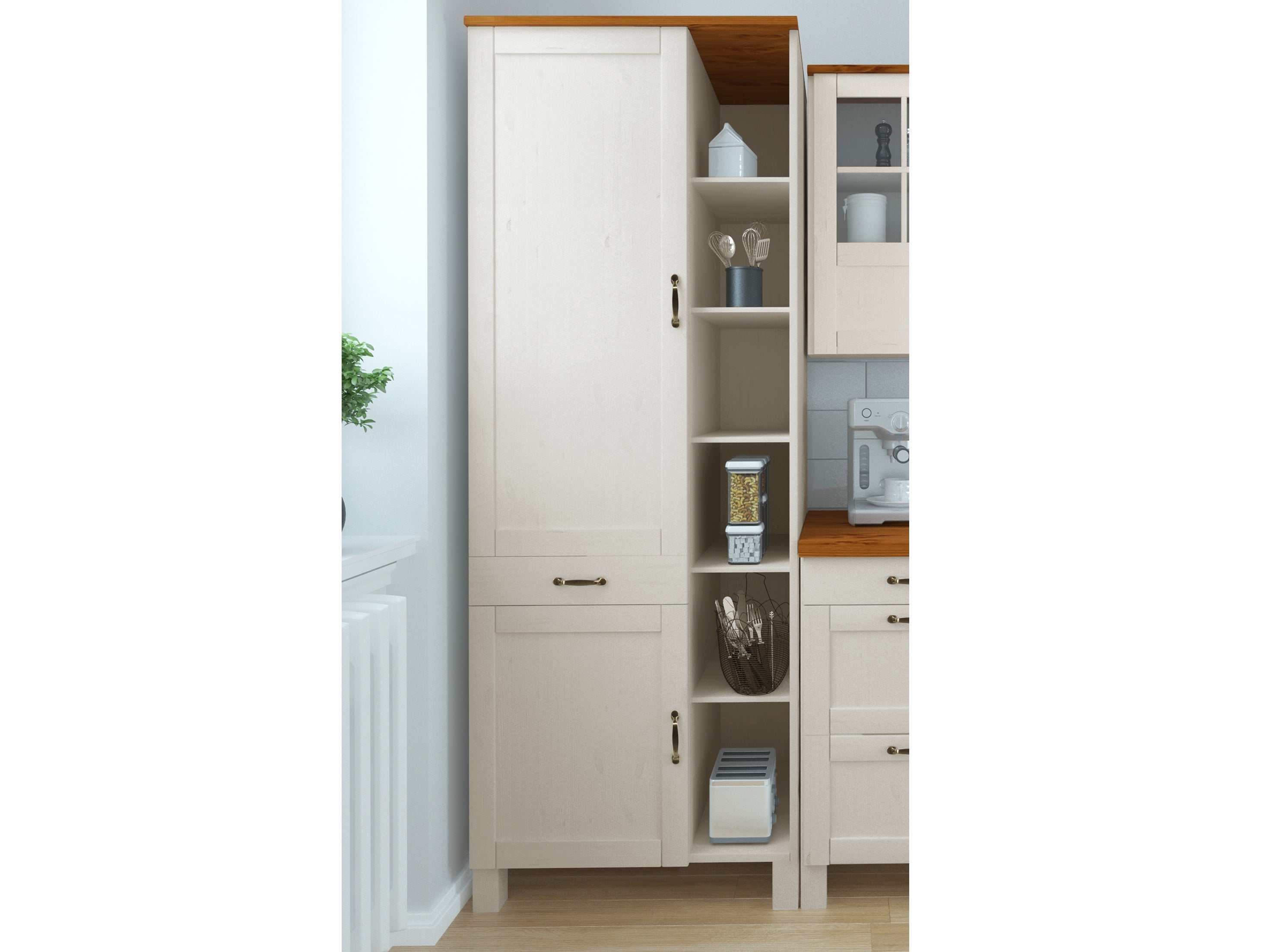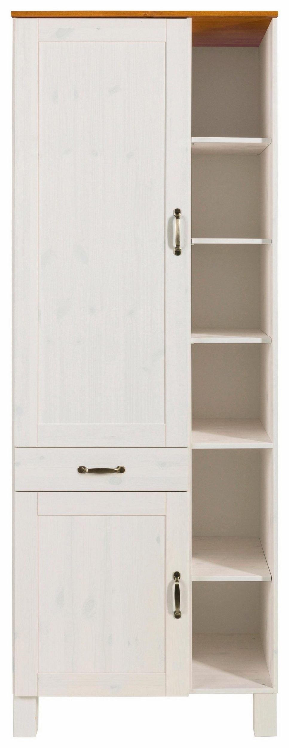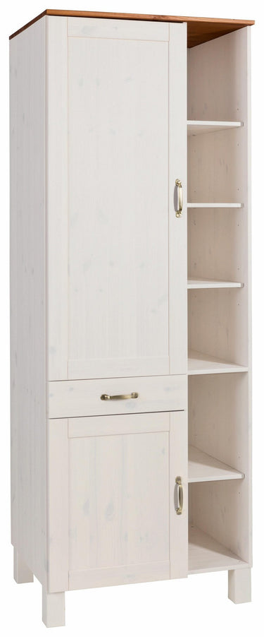 Det moderne højskab præsenterer sig i den klassiske landlige stil og fås i forskellige farver. Det dekorative køkkenskab byder på masser af opbevaringsplads til diverse køkkenredskaber og er lavet af massivt FSC®-certificeret fyrretræ. Den har døre moderne metalhåndtag og en skuffe i venstre side, mens højre side holdes åben med flere hylder. Smukke dekorative ting såsom vaser eller glas kan præsenteres åbent og opbevares overskueligt. Der er også hylder bag lågerne. En praktisk tilføjelse til stilfuld køkkenindretning højskabet i klassisk landlig stil.