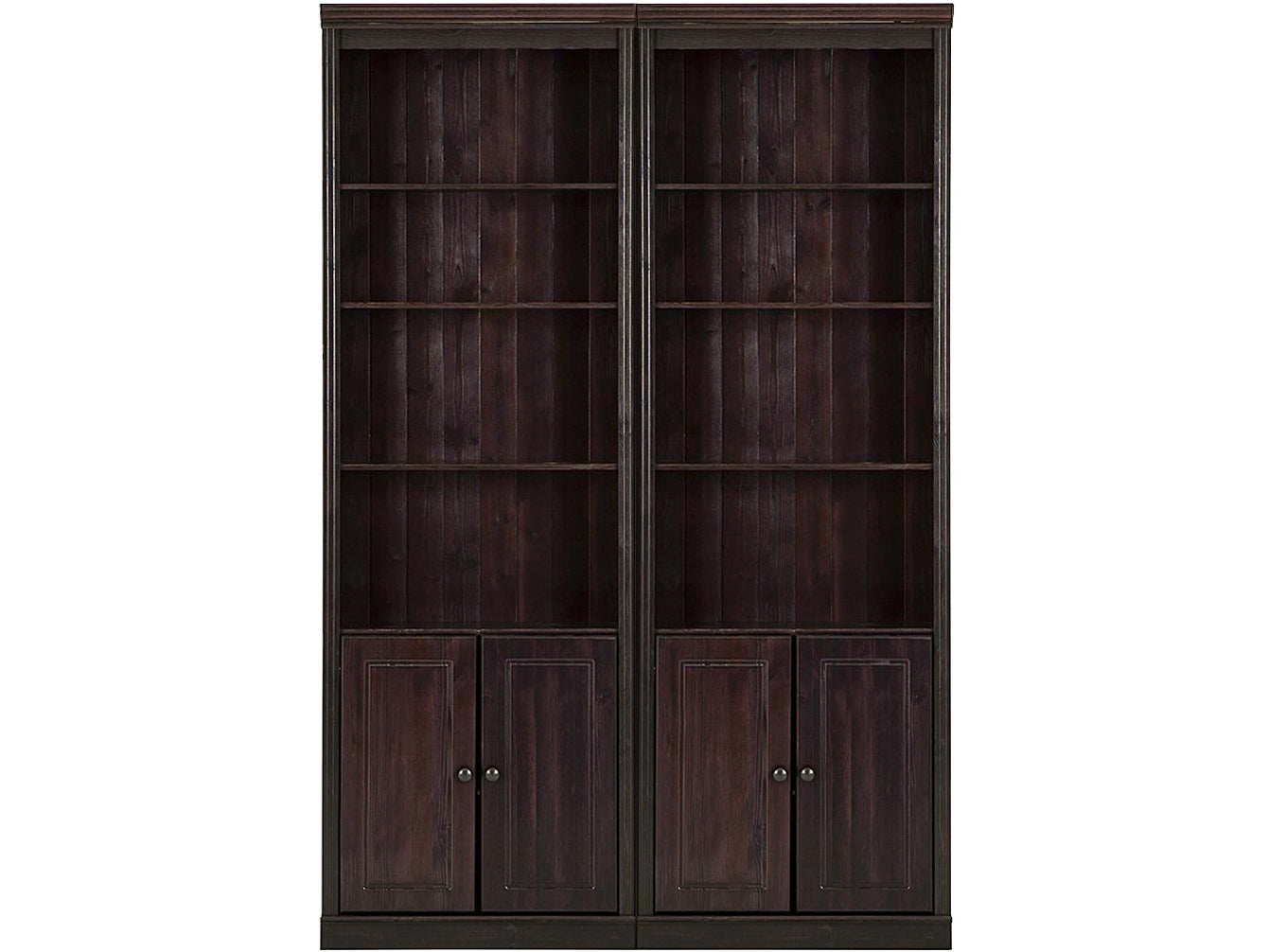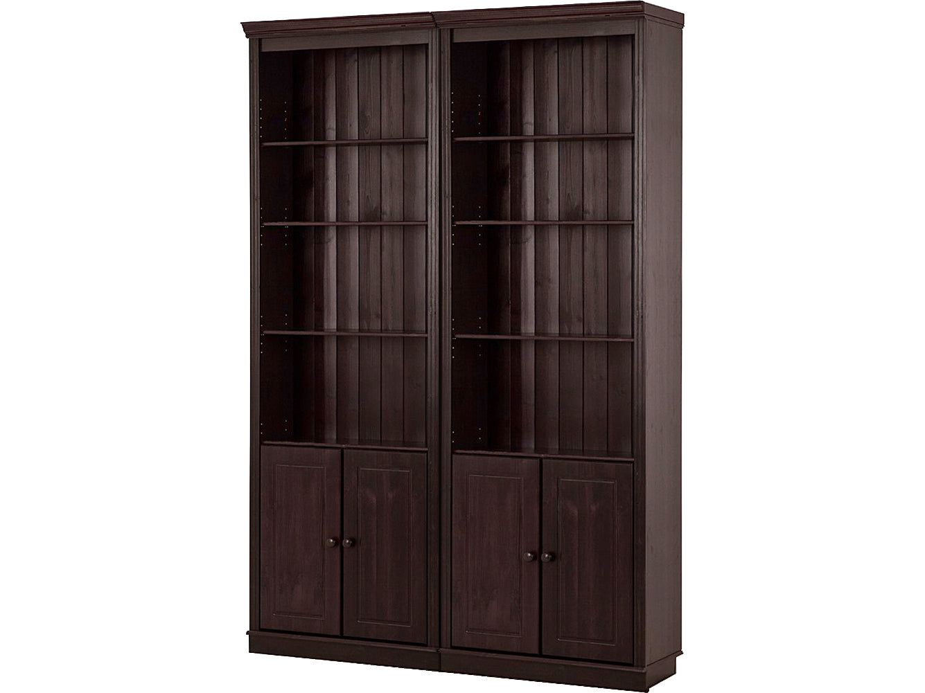 Reol med opbevaring i mørk brun fyrretræ