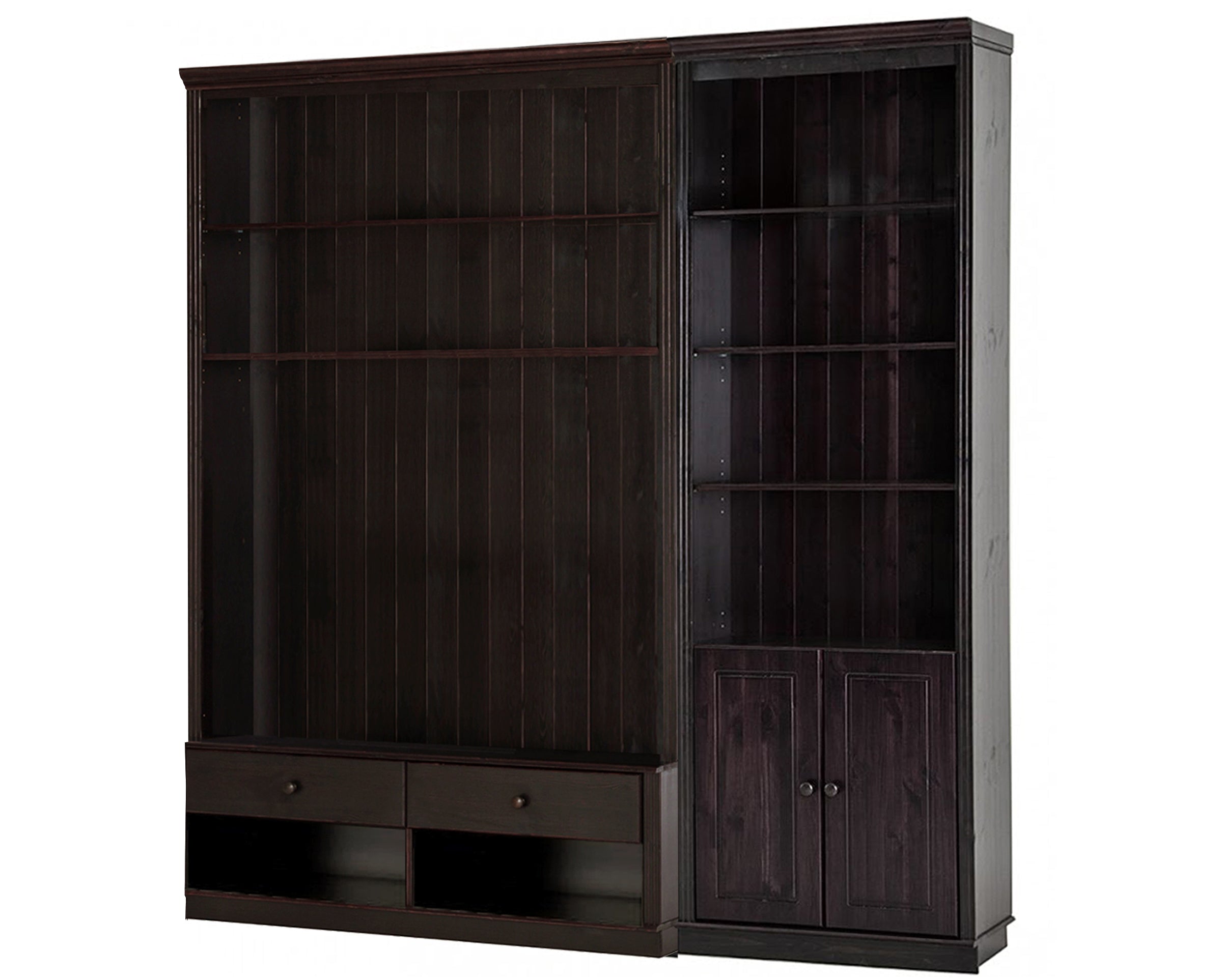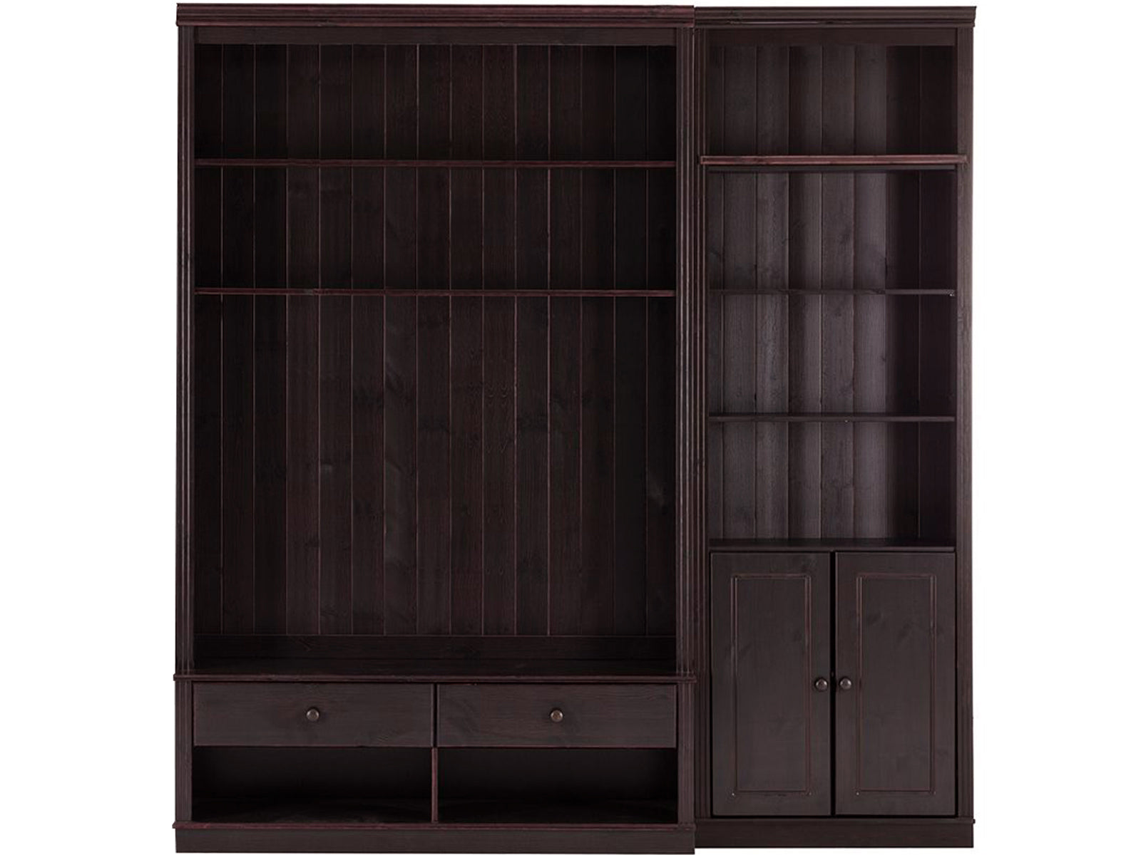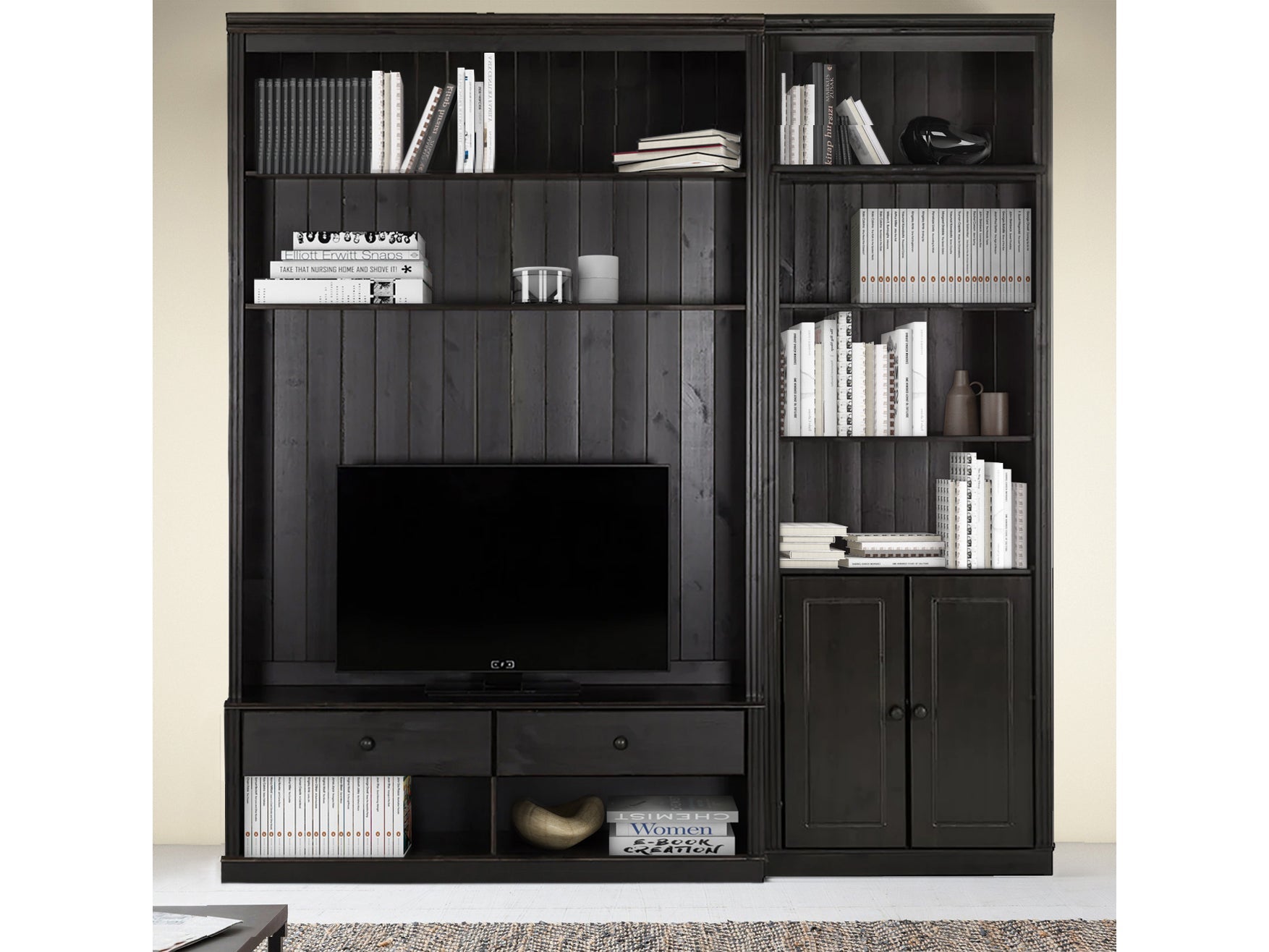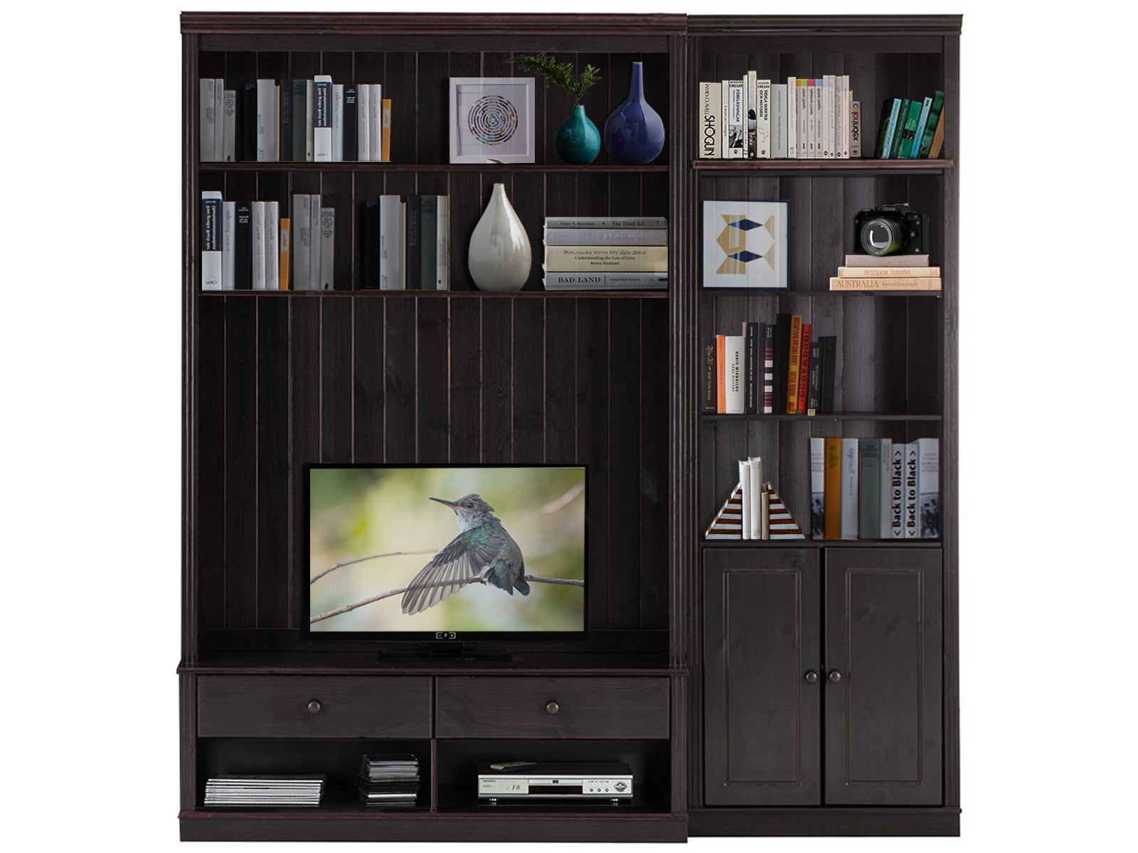 Vægsættet med et tv-lowboard med shelfattachtment og en reol med trædøre er den perfekte løsning til din stue.