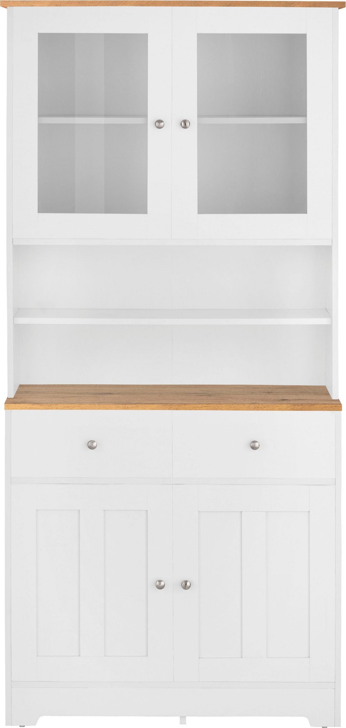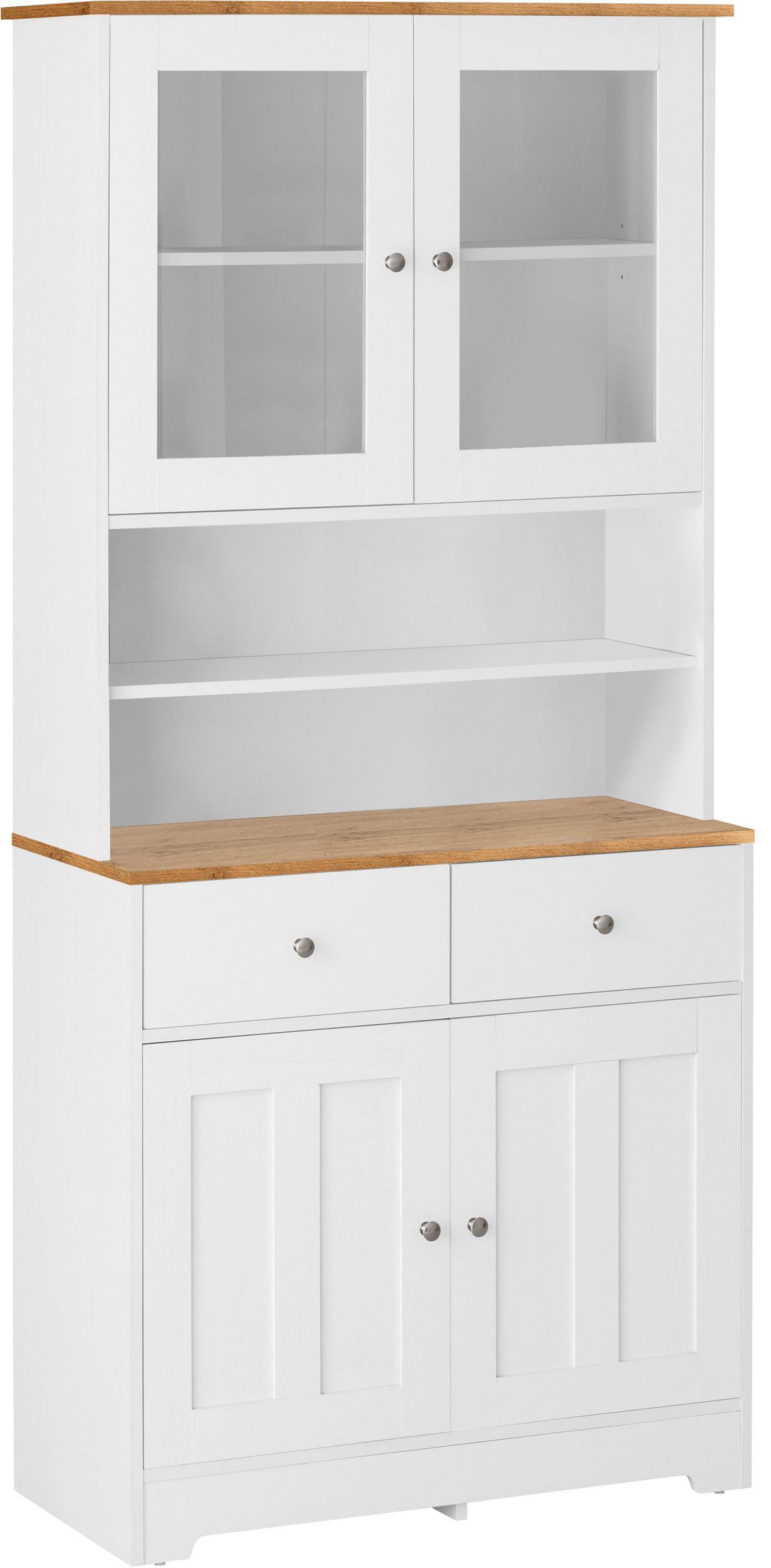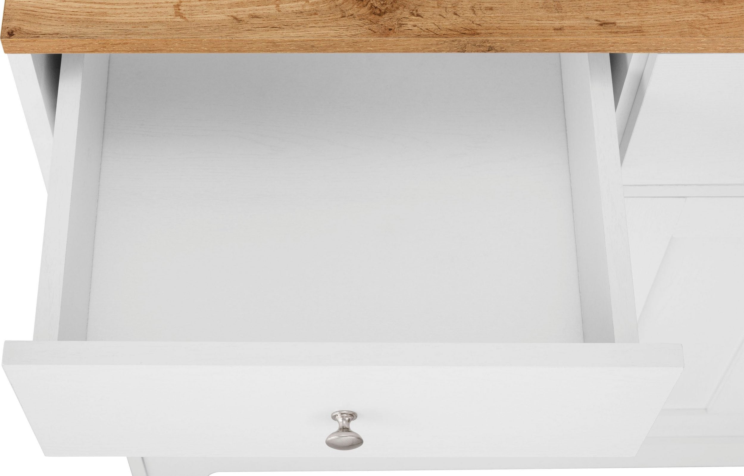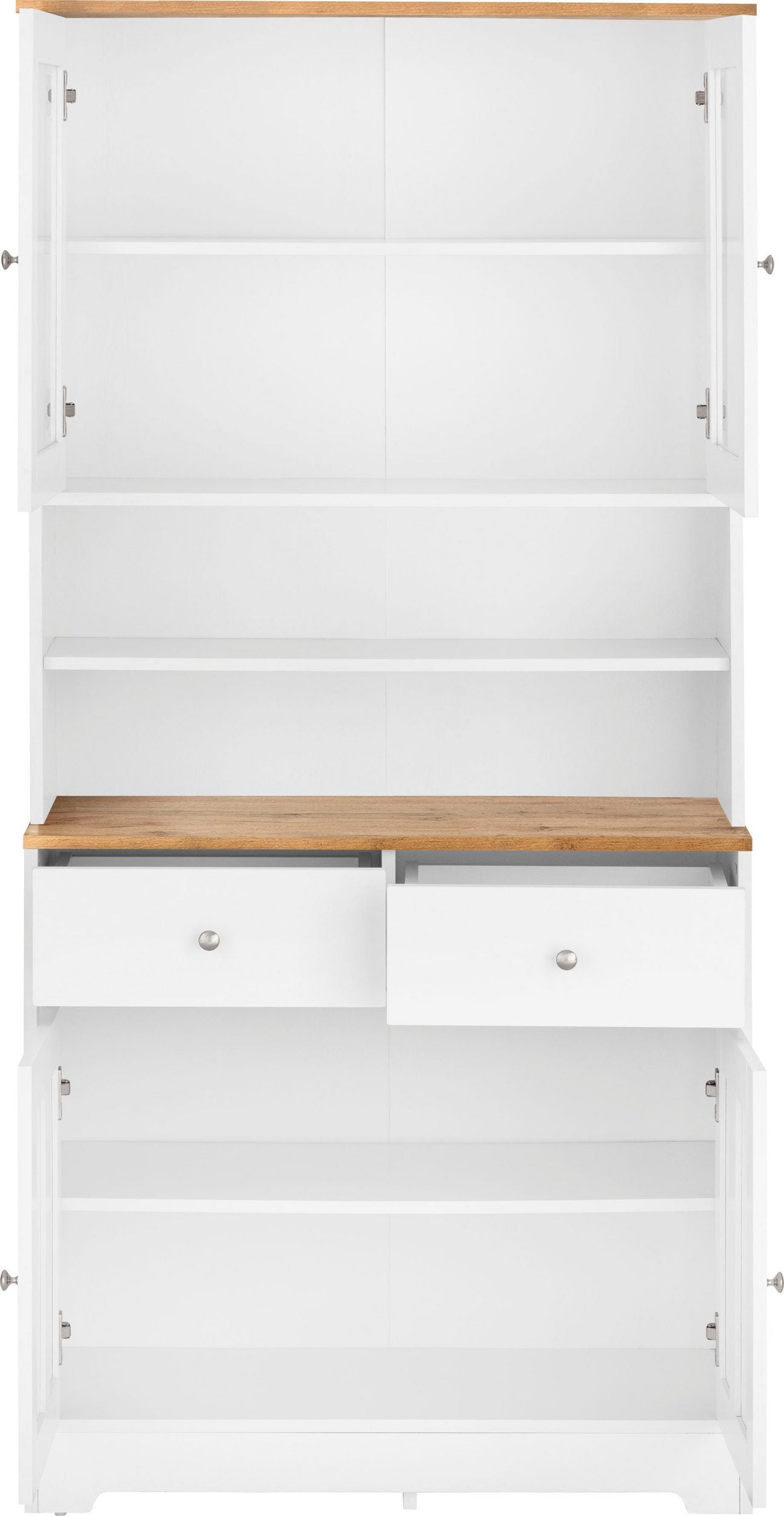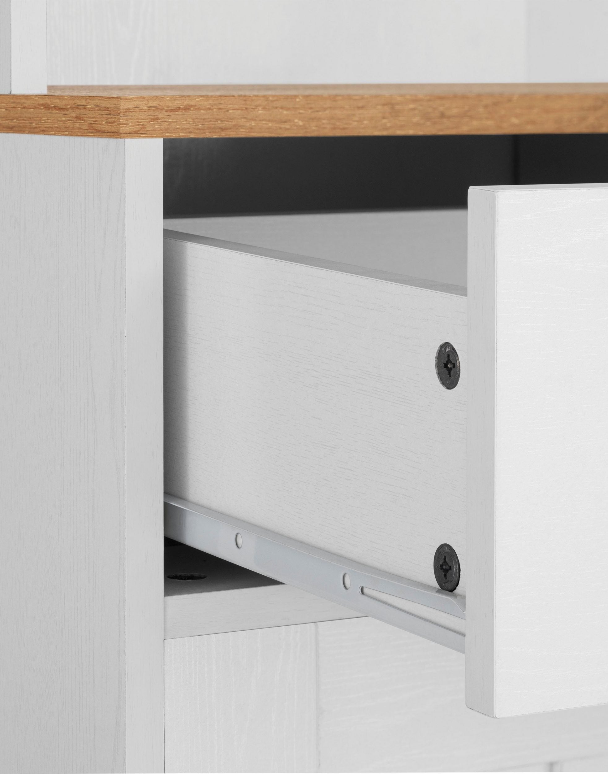 Det easycare-buffetskab i moderne landstedsstil vil være et blikfang i dit hjem. Den imponerer med sit tidløse design af høj kvalitet og smarte knaphåndtag. Takket være det subtile farveskema kan du kombinere den højkvalitets bearbejdede montre på mange måder, uanset om det er med urbane rustikke eller klassiske møbler og tilbehør. Bag de fire døre giver buffeten dig plads til glaskopper eller pyntegenstande. Bestik og duge kan opbevares i de to skuffer. Takket være den nemme pleje overflade er vitrineskabet nemt at rengøre.
