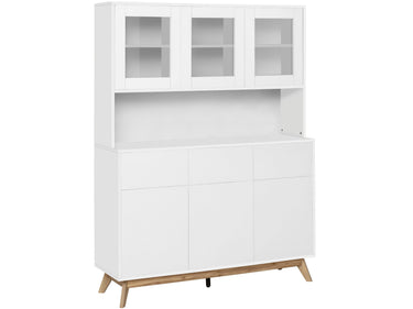 Det stilfulde udseende møder et gennemtænkt opbevaringskoncept. Sådan kan buffetskabet med pushtoopen-funktion beskrives med få ord. Udseendet er præget af klare former og sofistikerede designhøjdepunkter. Disse inkluderer rammelooket, de let udstrakte møbelfødder og det håndtagsfrie design. Lagerpladskonceptet omfatter flere skabselementer, skuffer og vitrineelementer. Du kan bruge vitrineskabet i spisekøkkenet eller i spisestuen. Et FSC®-certificeret træbaseret materiale blev brugt til produktionen.