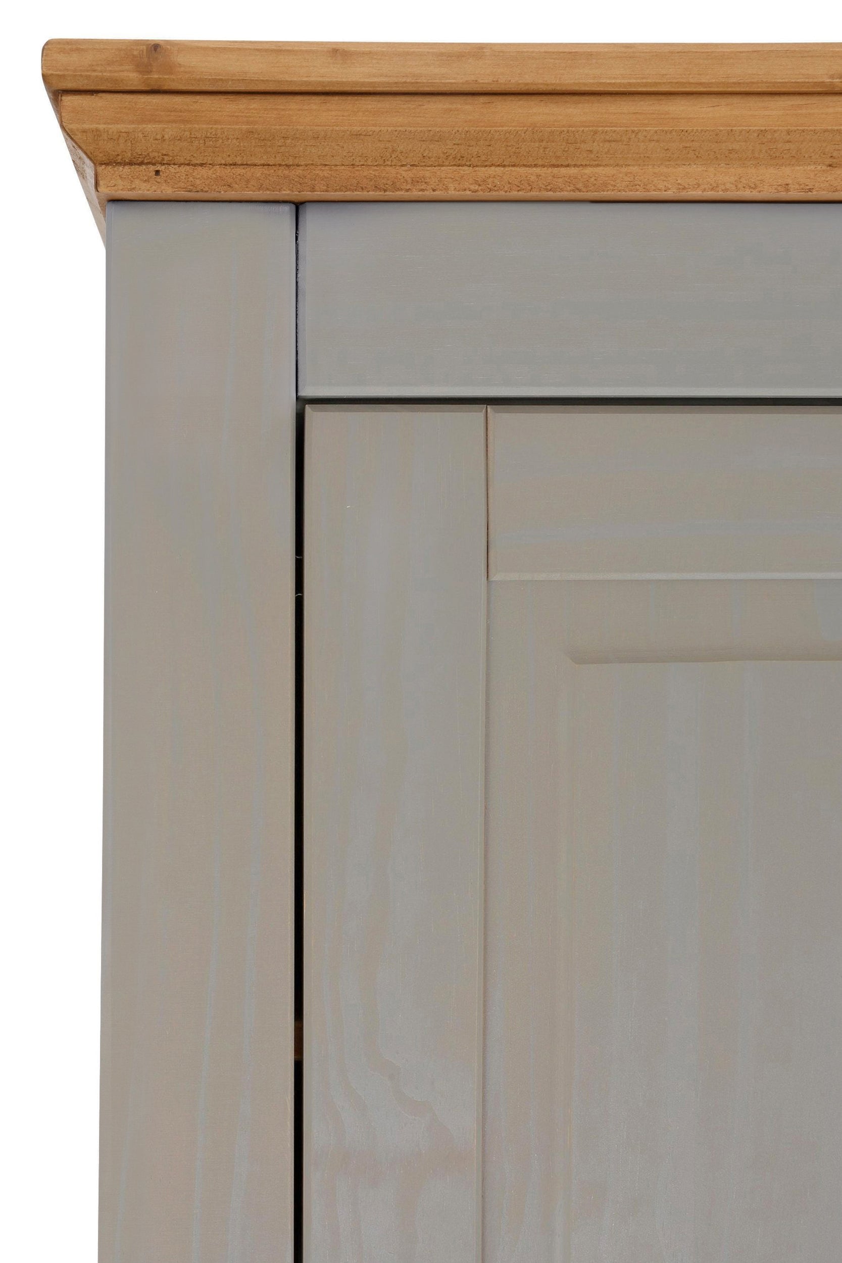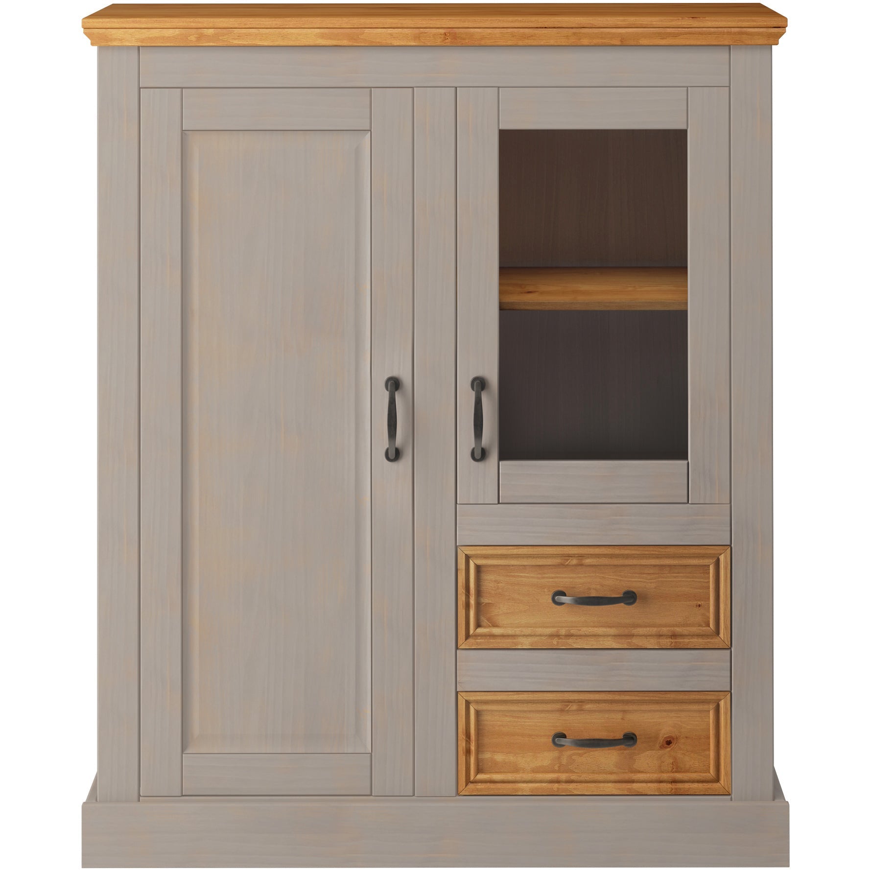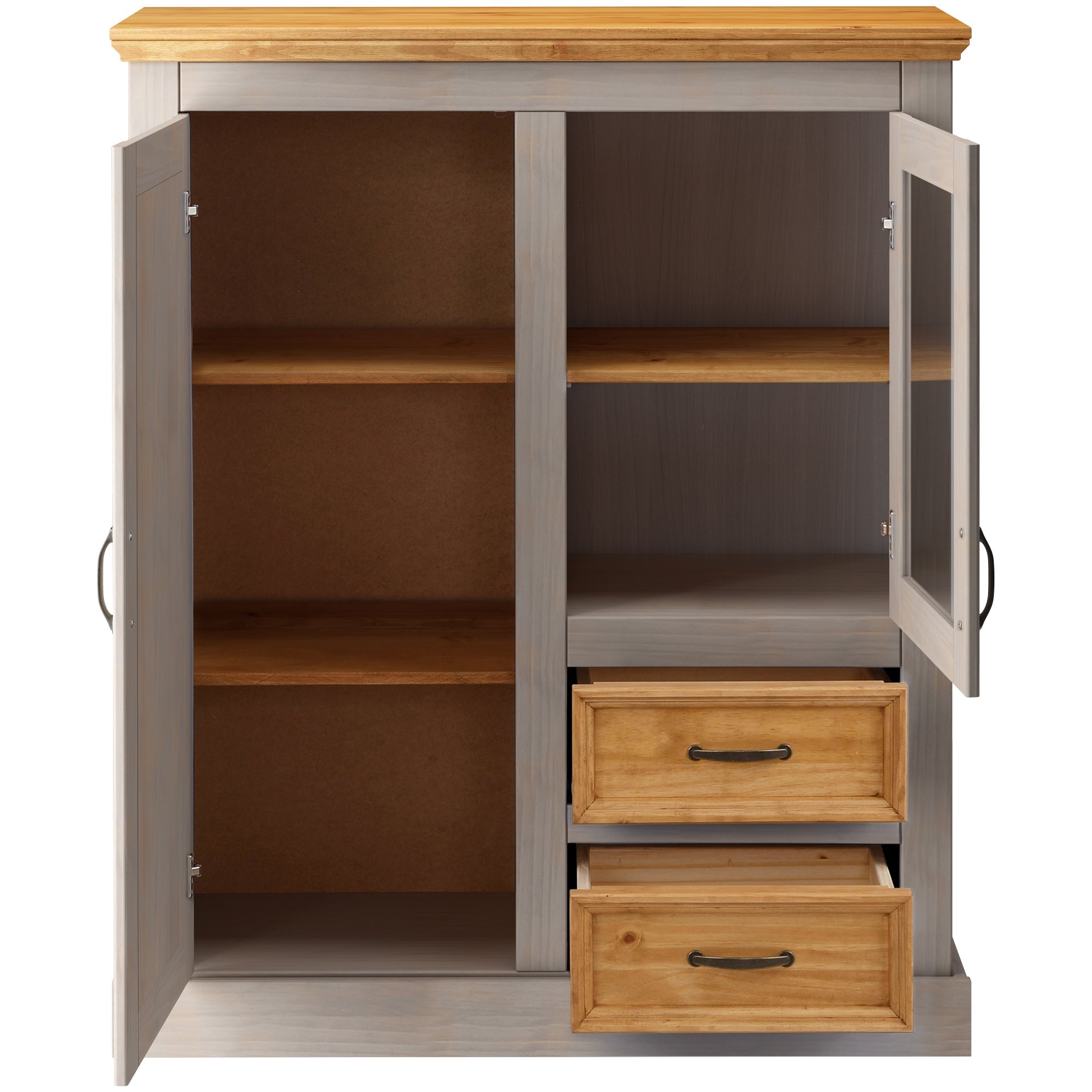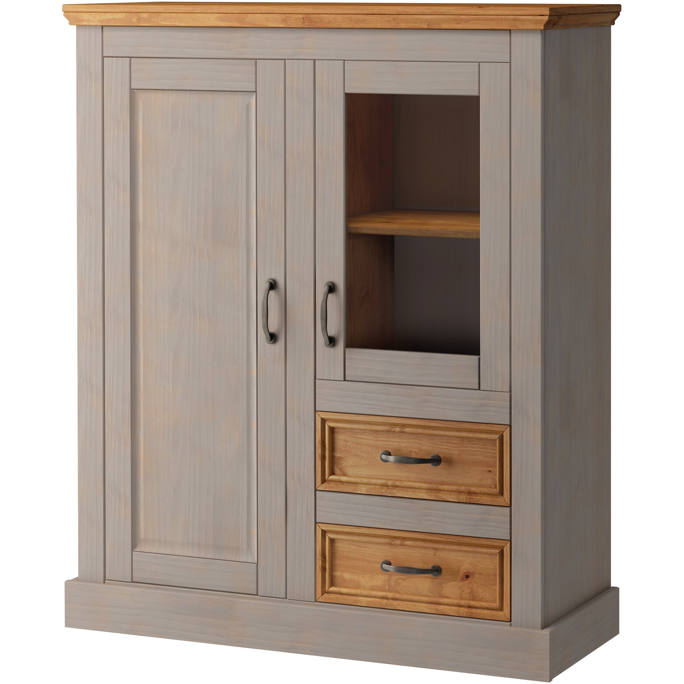Dette highboard med FSC-certifikat er et alsidigt møbel i en klassisk landlig stil. En elegant tilføjelse til opholds- eller spiseområdet med masser af ekstra opbevaringsplads. Bag flere skuffeelementer og låger er der plads til en lang række redskaber og genstande. Det synlige opbevaringsområde åbner store muligheder for dekorative ideer. Skabet skylder sin charme til kombinationen af coatede overflader og naturligt udseende træelementer, som imponerer med deres tydeligt synlige og håndgribelige træstruktur. Håndtagene af antikt metal runder det samlede billede af.