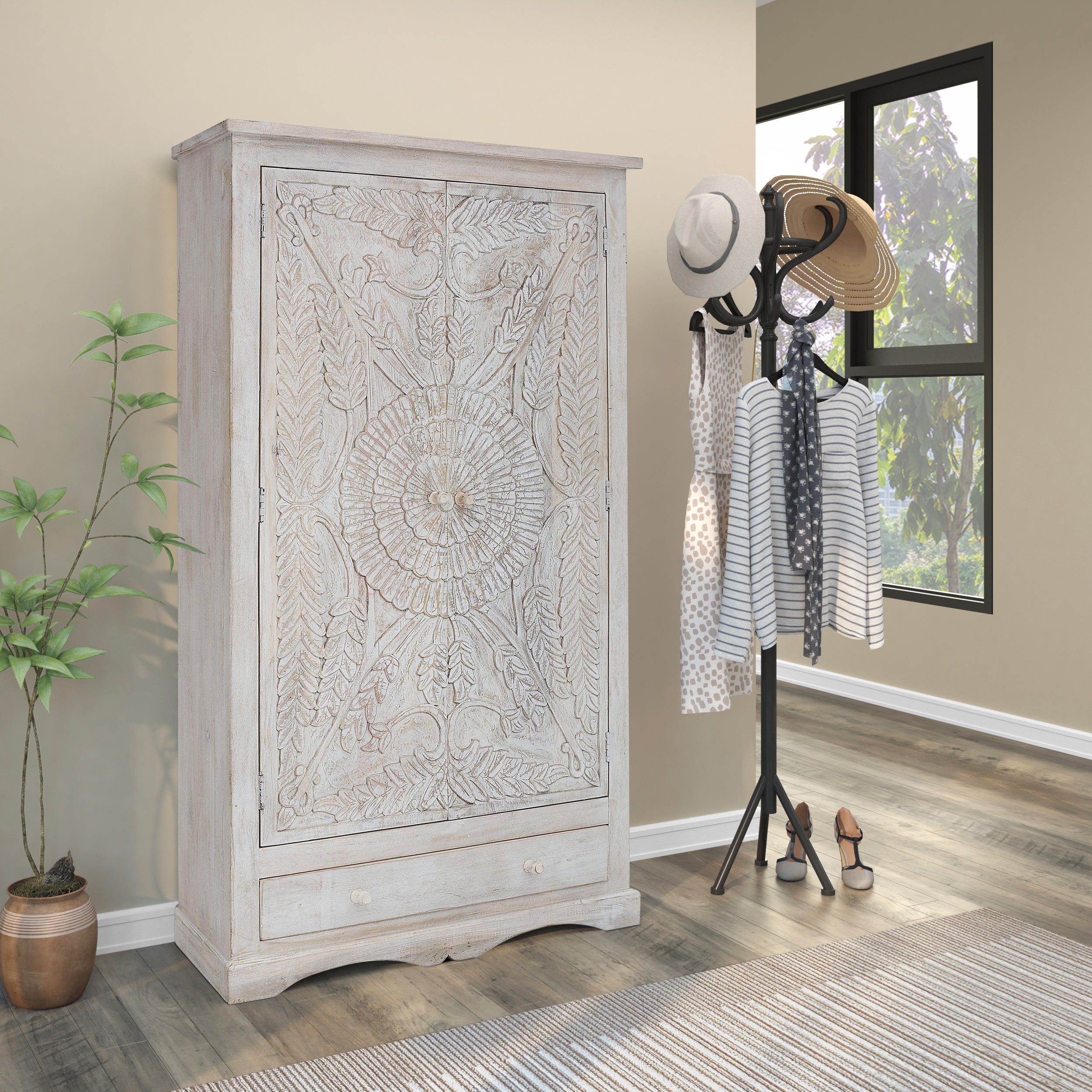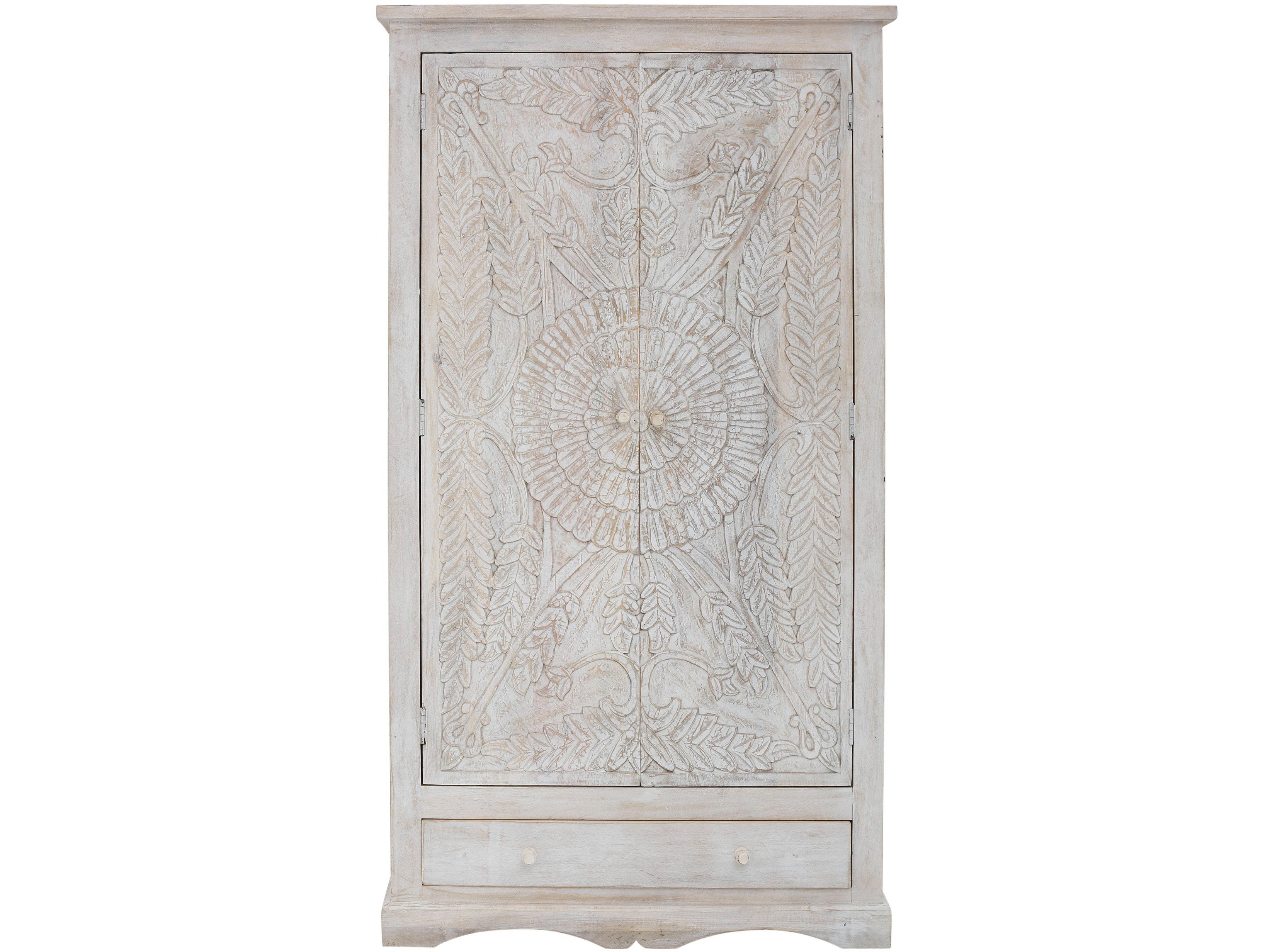 Det stående opbevaringsskab med dekorative udskæringer giver masser af plads til vasketøj og tilbehør. Dens landlige look er understreget af udskæringer med ranker og blomster på forsiden. Faste hylder er gemt bag de to låger. Skabet er desuden udstyret med en rummelig skuffe. Denne model er lavet af FSC®-certificeret massivt mangotræ med en beskyttende overfladebelægning.