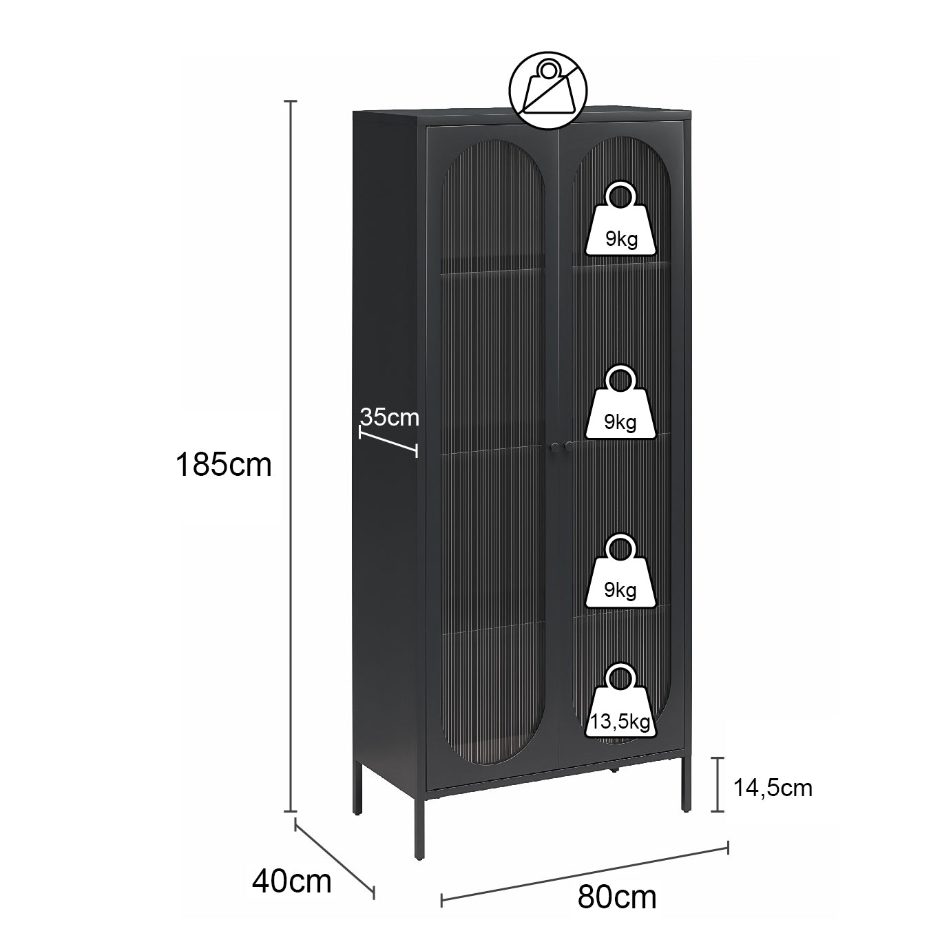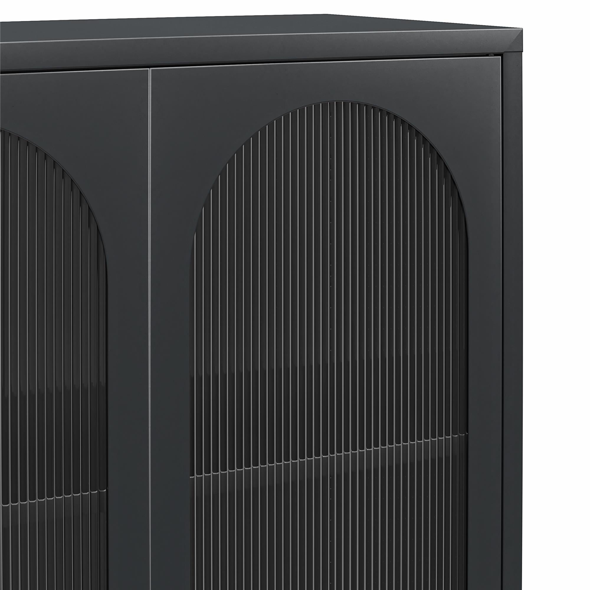 Forbedre din organisation og stil med dette høje 2-dørs vitrineskab i sort metal. De ovale riflede glasdøre tilføjer en markant charme. Metalkonstruktionen tilbyder alsidighed. Dette skab har fire rummelige hylder. Tre af hylderne er justerbare. Den er perfekt til stuen køkken badeværelse eller entre. Dens minimale og vintage stil komplementerer ethvert rum. Skabet sendes fladt i én kasse. Samling er påkrævet med to voksne anbefalet til opgaven.