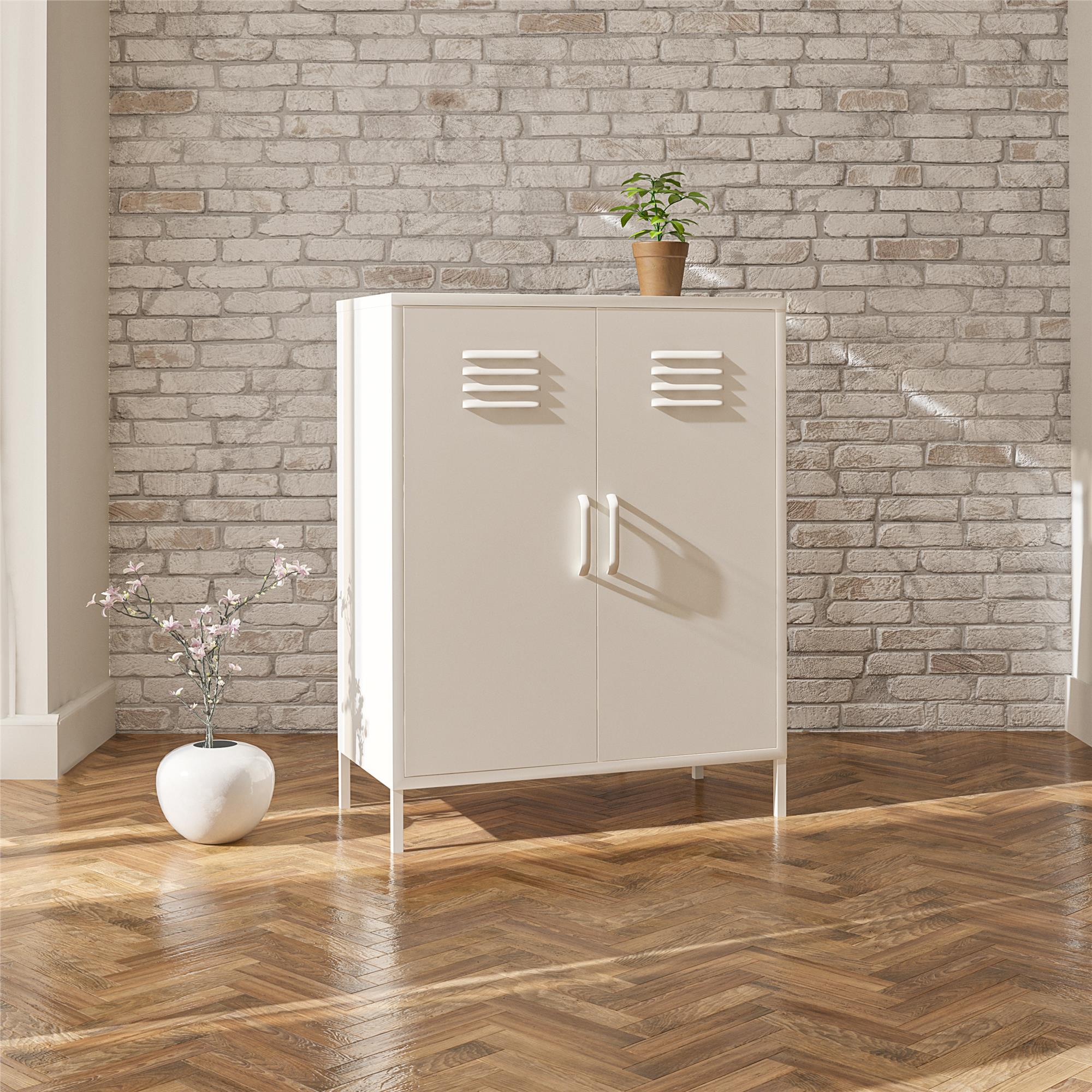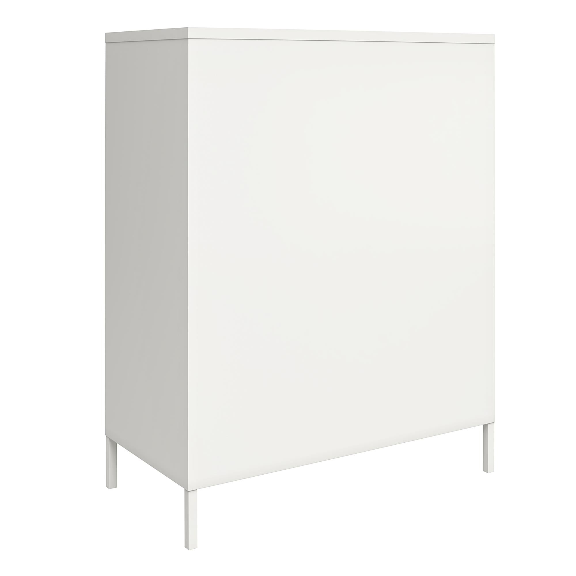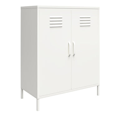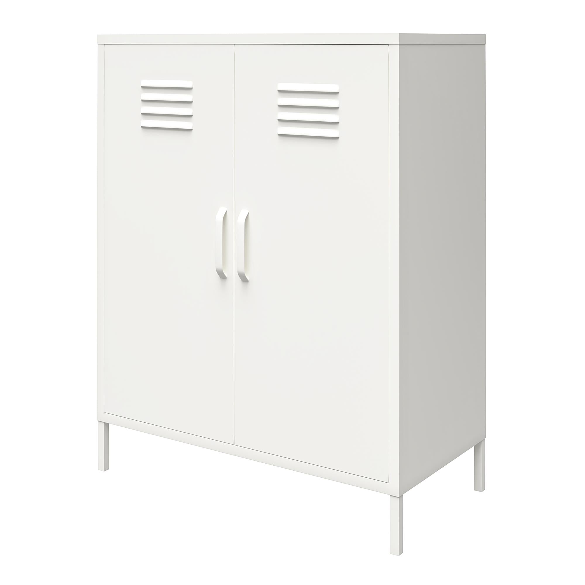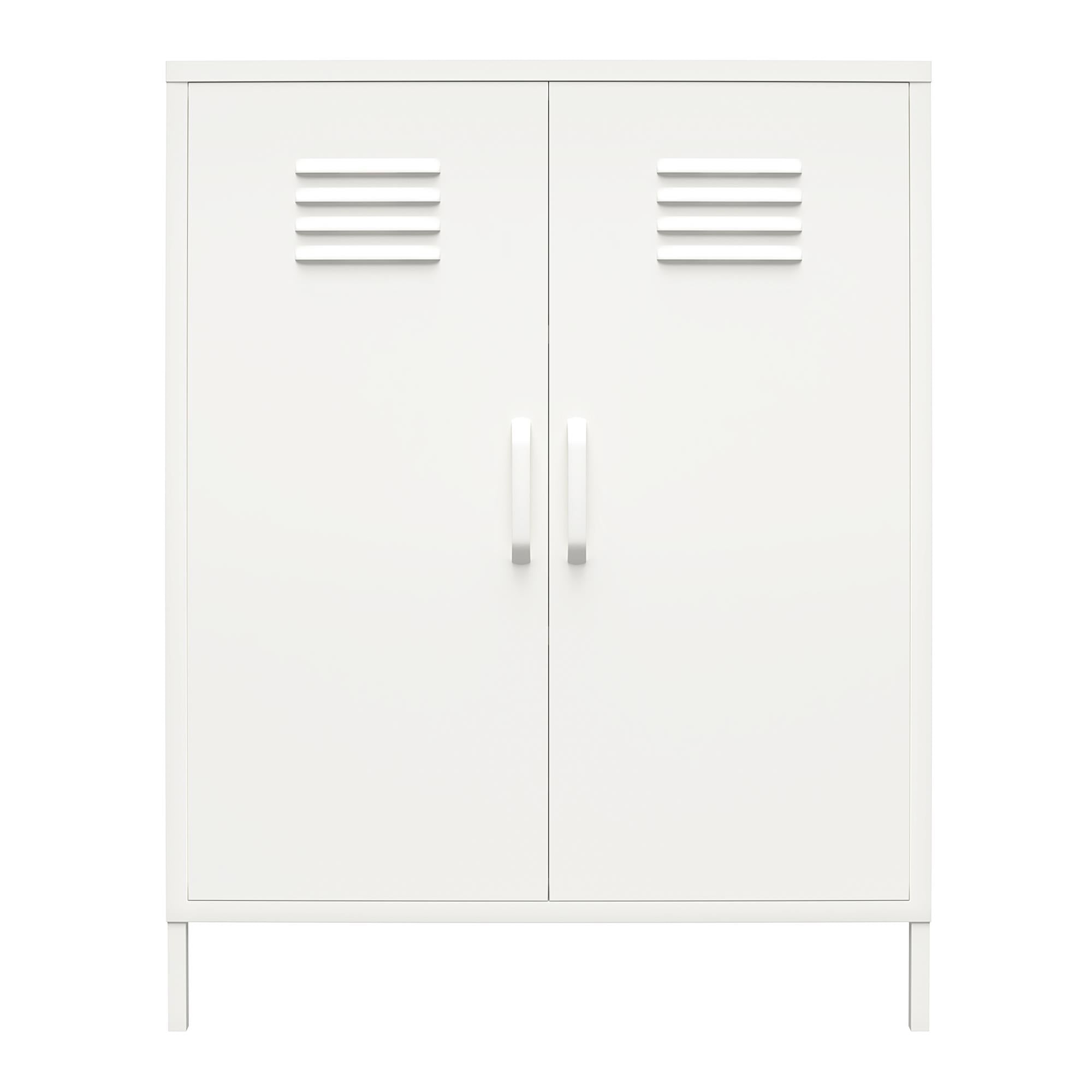 Få den ideelle opbevaringsløsning til ethvert rum med 2-dørs metalskab. Konstrueret af pulverlakeret metal giver dens hvide farve et rent moderne look, og metalmaterialet gør det nemt at rengøre med en fugtig klud. Skabet har tre hylder bag lågerne. Den sendes fladt og kræver montering med to voksne anbefalet til opgaven. Hver hylde kan bære op til cirka 9 kg, mens den øverste overflade kan holde op til cirka 27 kg.