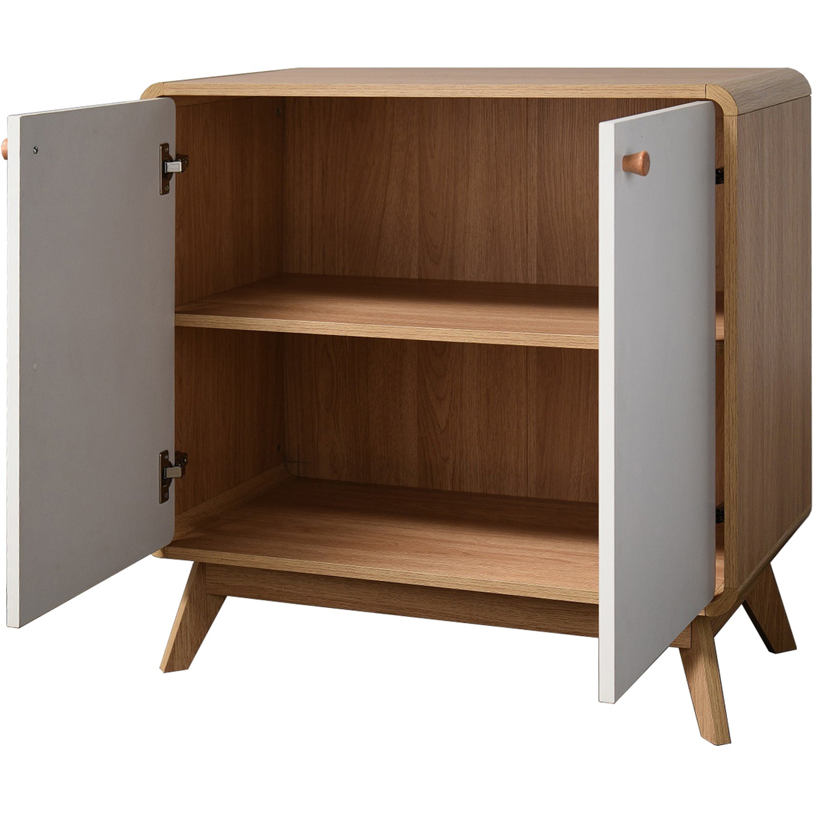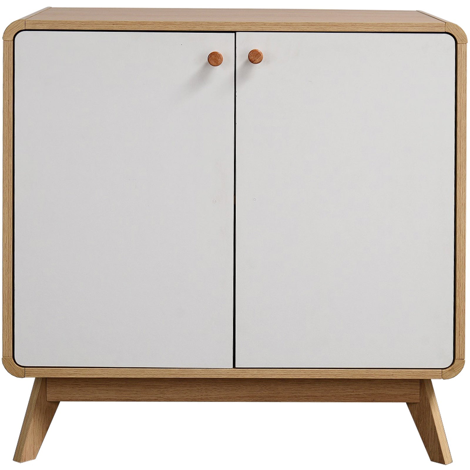 Denne skænk løser dine opbevaringsproblemer med stil. Fremstillet af lamineret spånplade. Den tofarvede farvepalet strømlinede silhuet afrundede hjørner og tilspidsede ben tilføjer dens skandinaviskinspirerede appel. Inde i skabet giver to hylder masser af opbevaringsplads.
