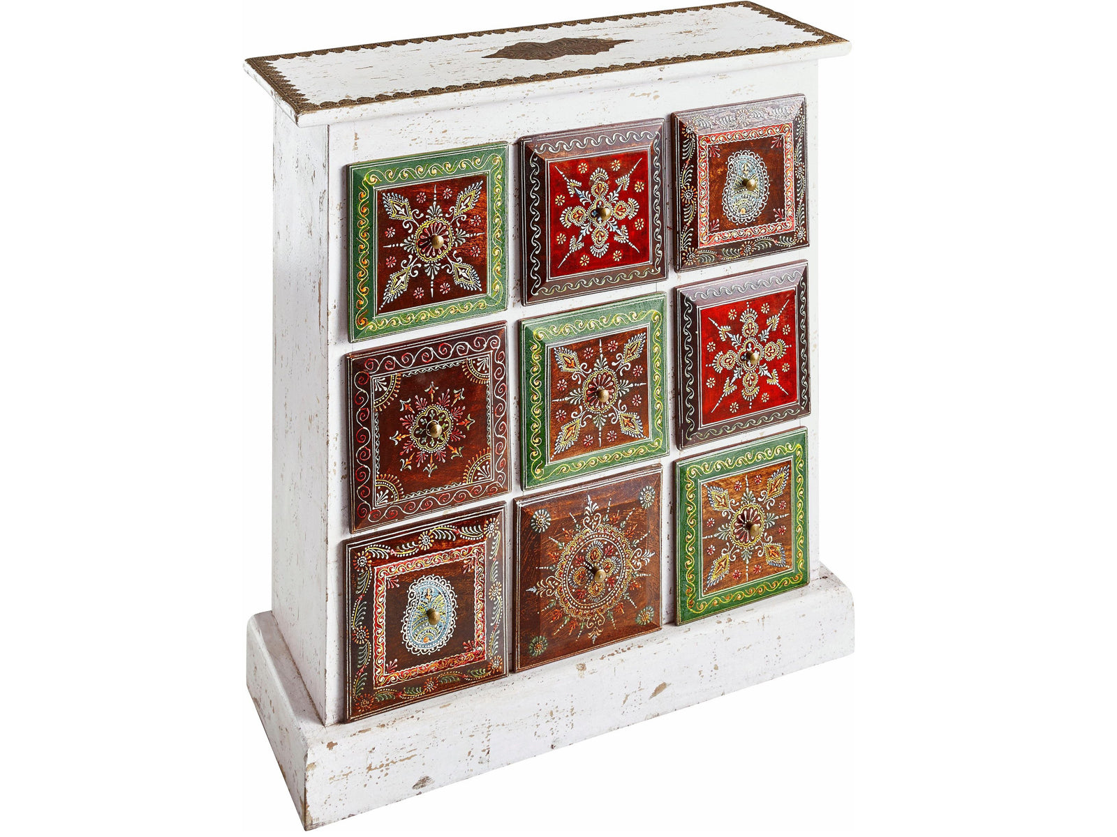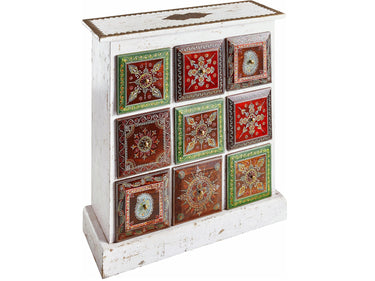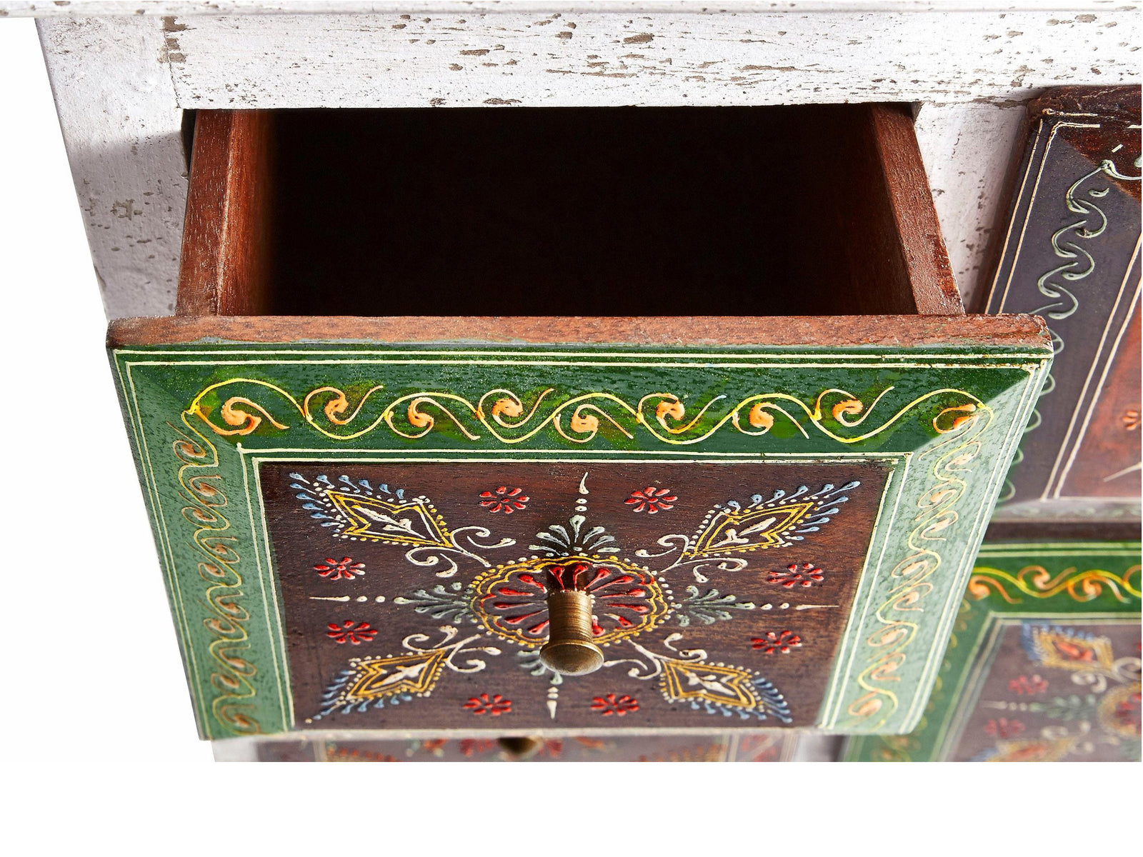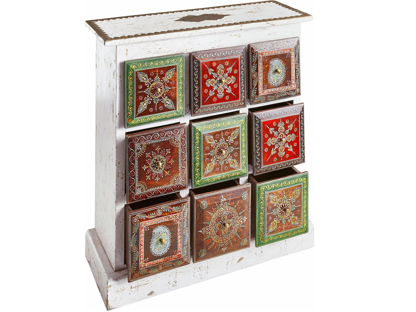 Denne smukke kommode giver kreative hjerner med sans for indretning et stilfuldt blikfang, der skaber en drømmende orientalsk stemning i ethvert rum. Møblet lavet af massivt mangotræ imponerer med sit trendy brugte look med bevidste brugsspor og håndmalede skuffer, der er prydet med fabelagtige ornamenter. Det smarte inventar præsenterer sig særligt smukt i alle rum. Afhængigt af hvor de er placeret, er de små skuffer fyldt med en bred vifte af materialer og redskaber. Med en FSC®-certificering beviser det dekorative boligtilbehør eksemplarisk skovdrift i forhold til økologiske og sociale aspekter.