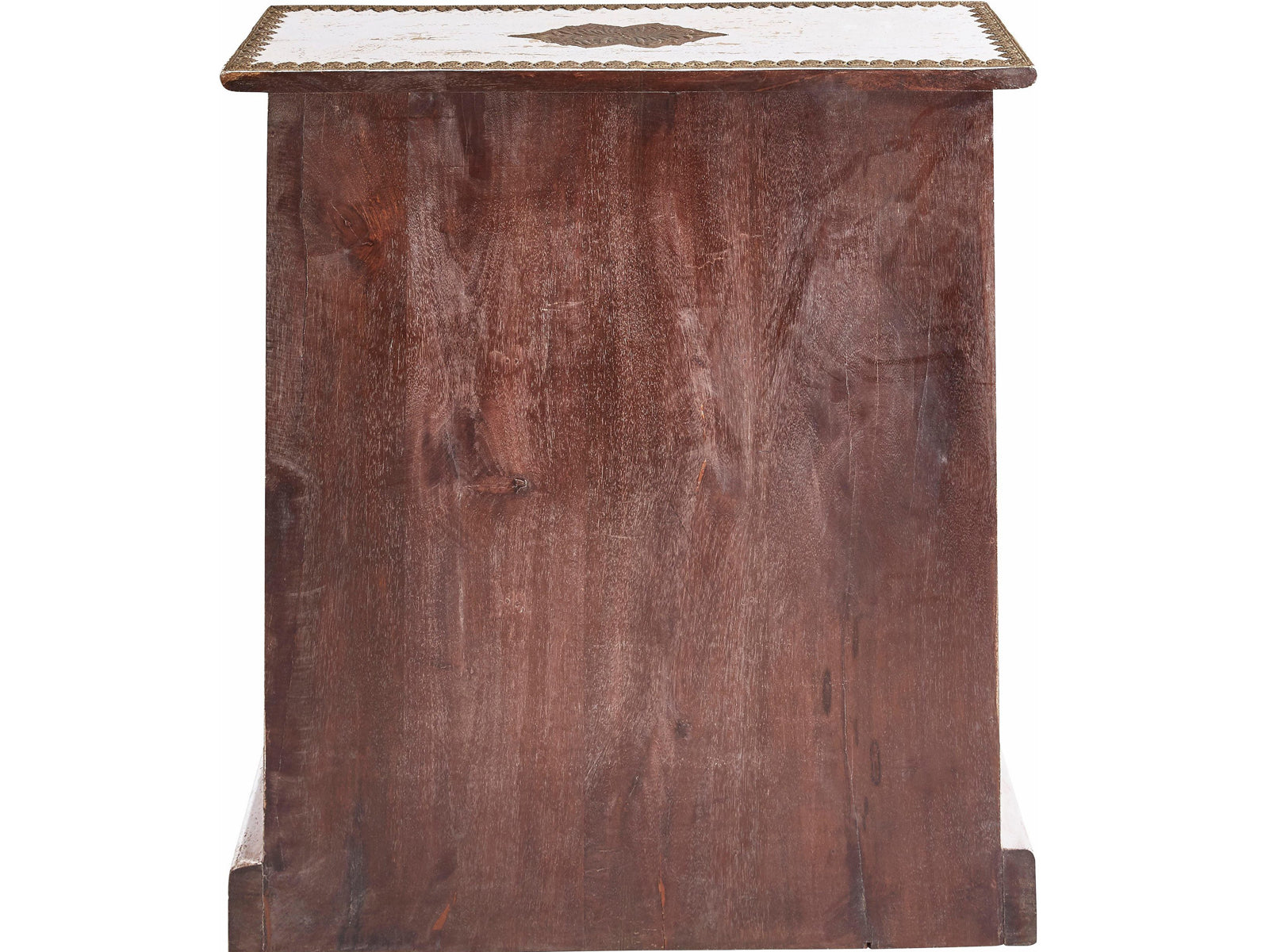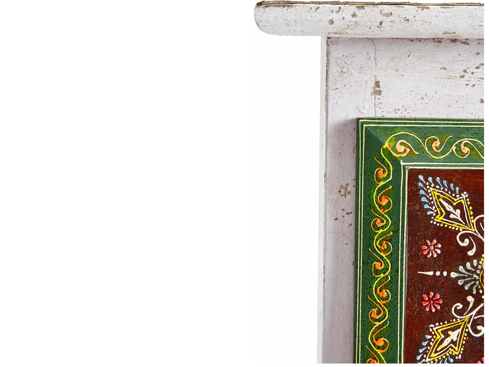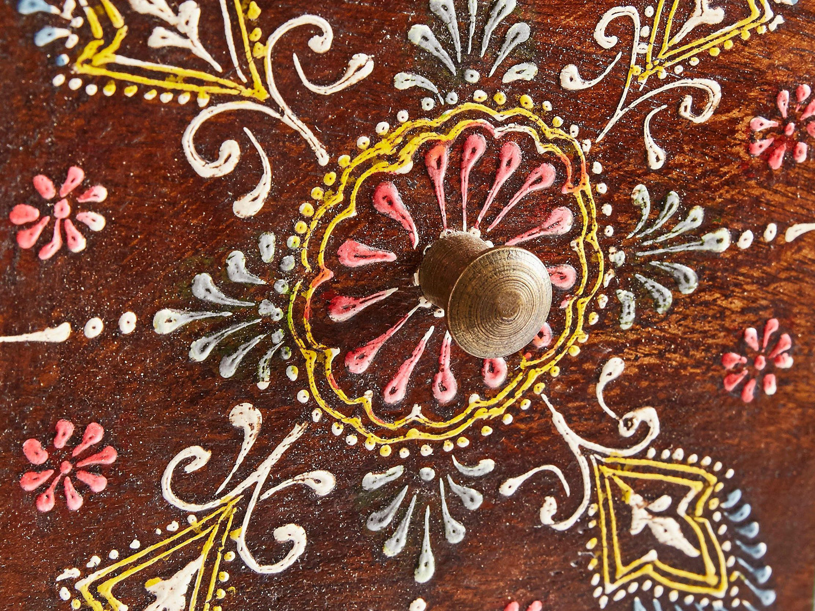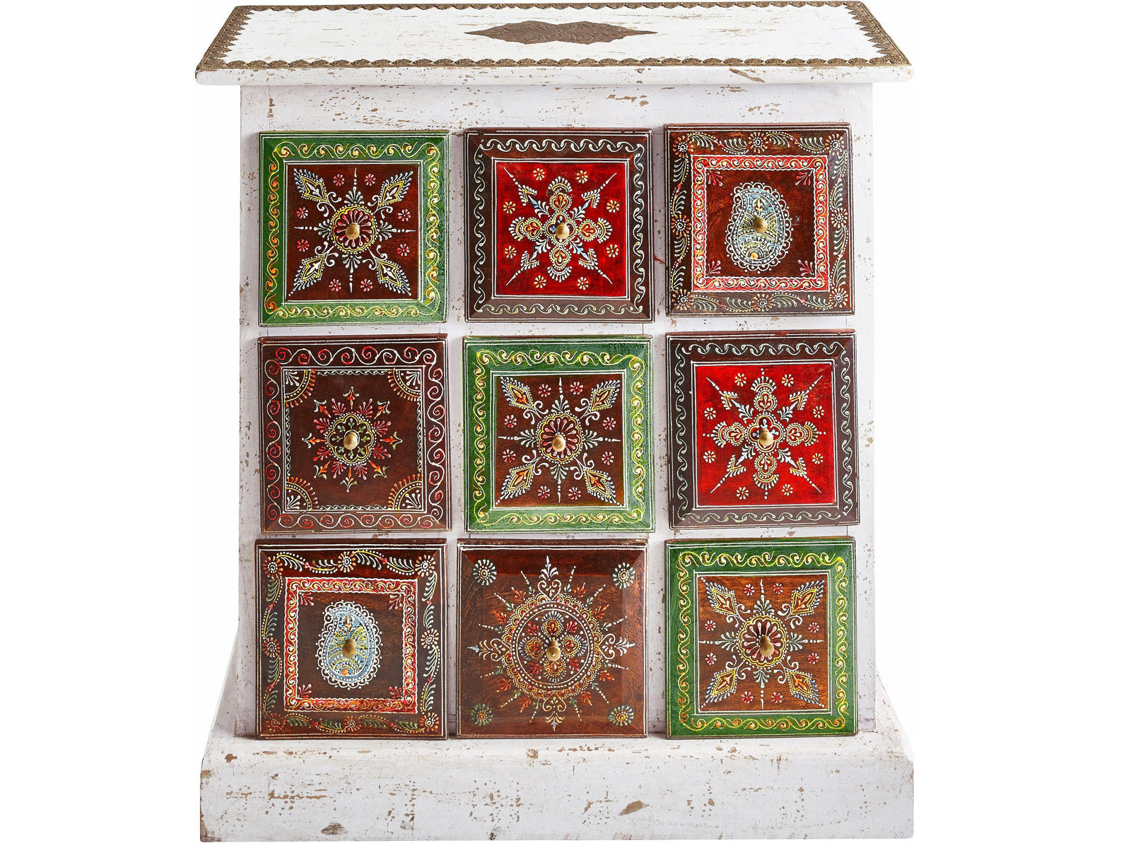 Denne smukke kommode giver kreative hjerner med sans for indretning et stilfuldt blikfang, der skaber en drømmende orientalsk stemning i ethvert rum. Møblet lavet af massivt mangotræ imponerer med sit trendy brugte look med bevidste brugsspor og håndmalede skuffer, der er prydet med fabelagtige ornamenter. Det smarte inventar præsenterer sig særligt smukt i alle rum. Afhængigt af hvor de er placeret, er de små skuffer fyldt med en bred vifte af materialer og redskaber. Med en FSC®-certificering beviser det dekorative boligtilbehør eksemplarisk skovdrift i forhold til økologiske og sociale aspekter.