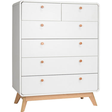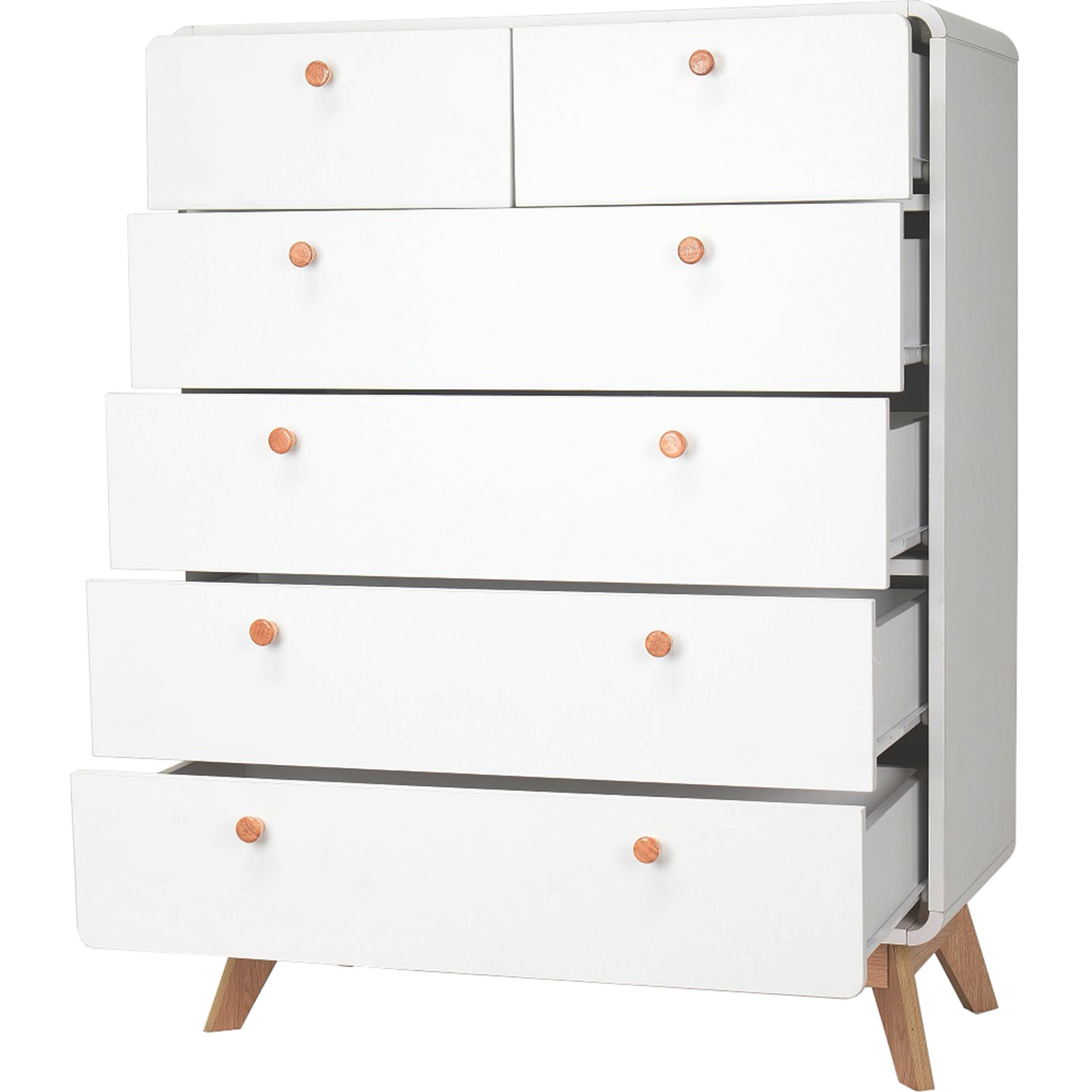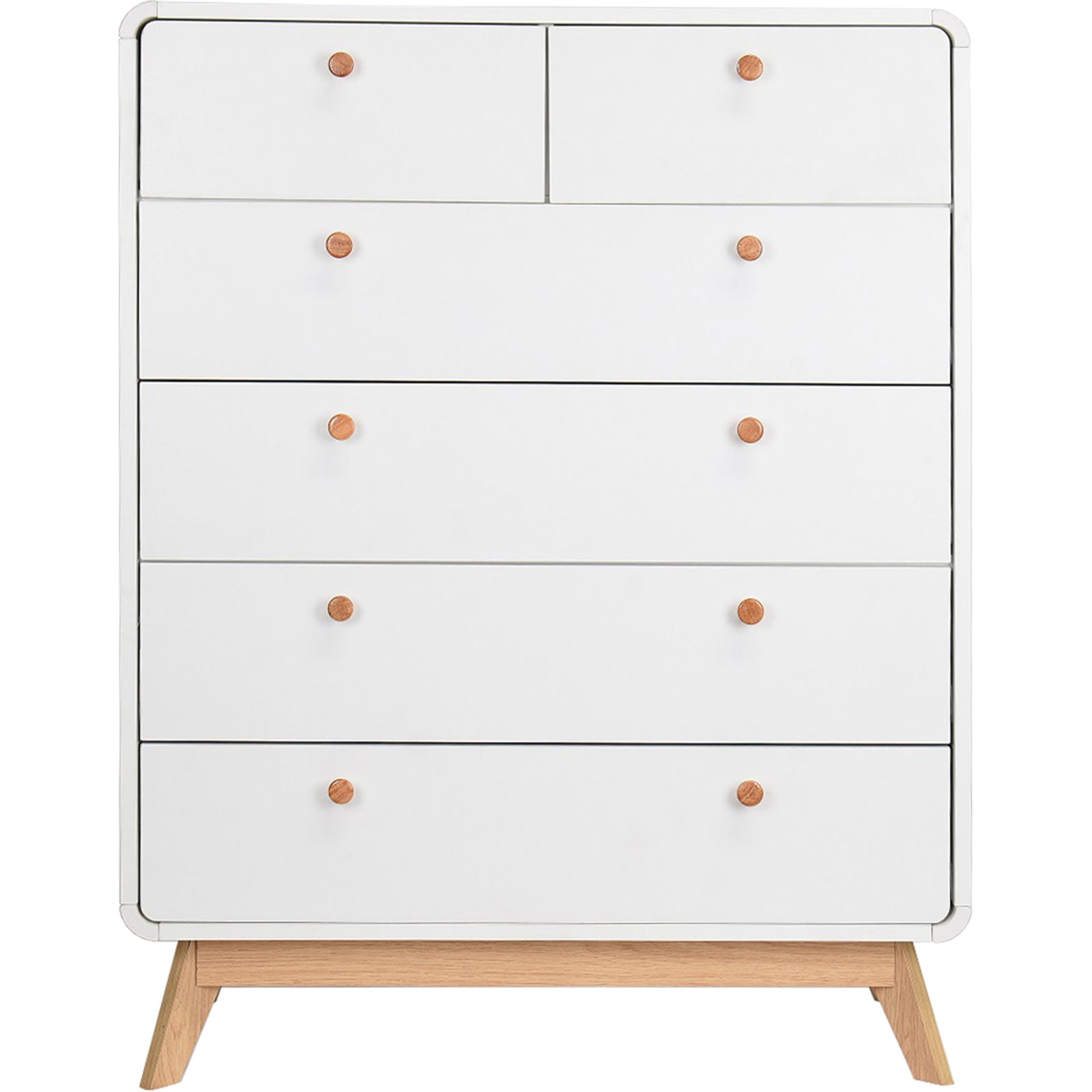 Denne rummelige kommode har et moderne design. Den er lavet af spånplader. Den kan bruges som skænk i stuen, kommode i soveværelset, skænk i gangen eller kommode i børneværelset. Det enkle moderne design gør det muligt at passe til mange forskellige indretningsstile. Overfladebelægningen gør den nem at pleje. Du kan rengøre den med en let fugtig klud. Ingen kemikalier er nødvendige for at rense den vandtætte overflade.