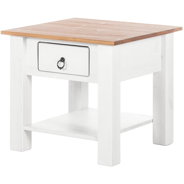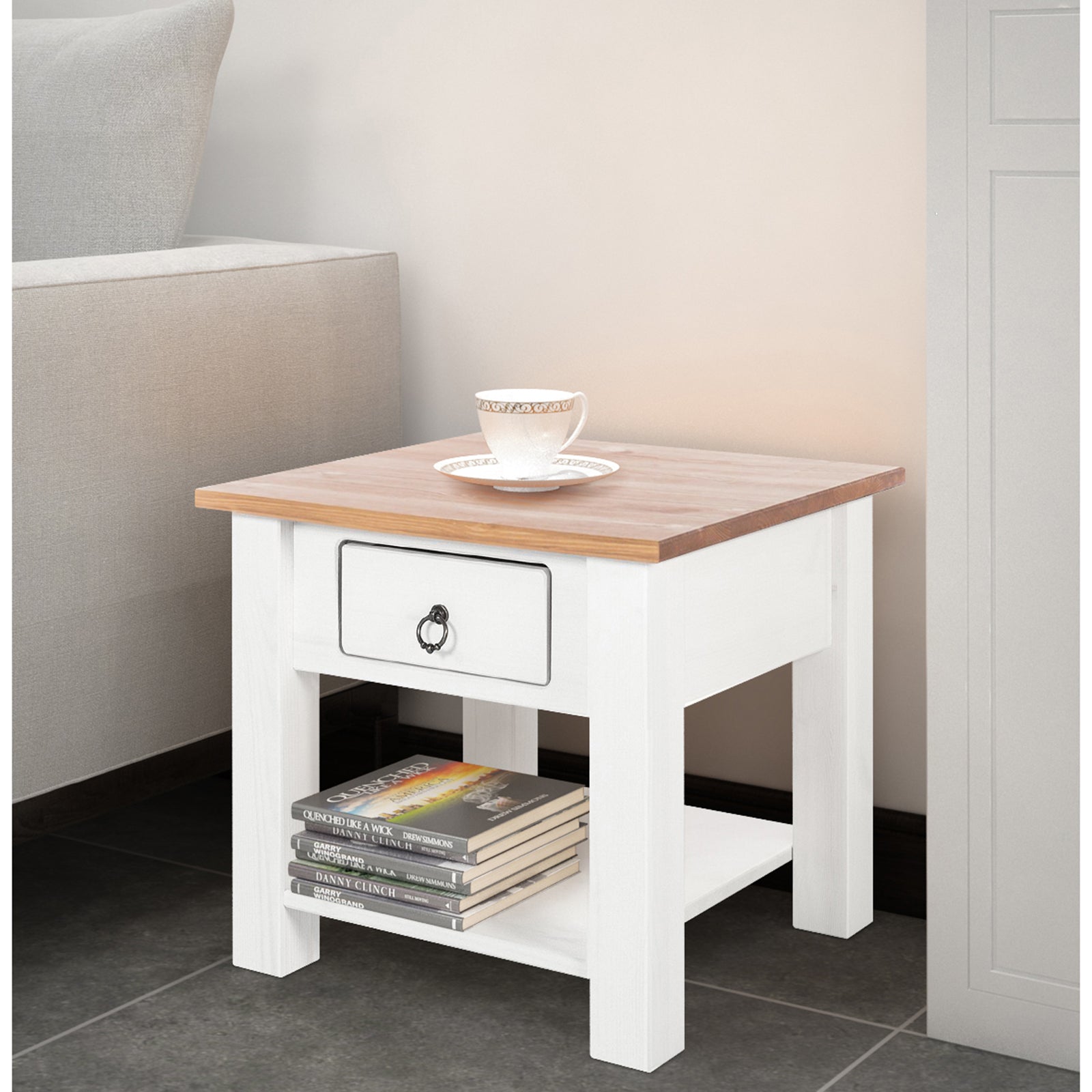 Et stilfuldt sofabord med to skuffer lavet af massivt træ i landlig stil.