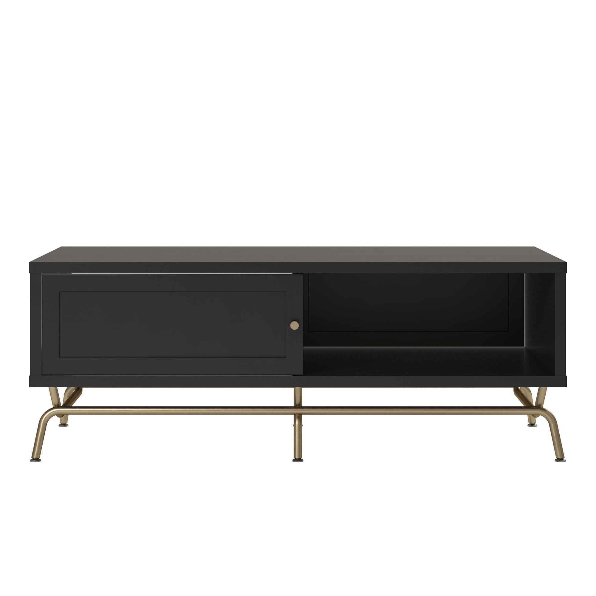 Opgrader dit rum med dette stilfulde sofabord. Den er lavet af malet MDF og metalben for en robust konstruktion med en glat og letpleje overflade. Døren og rummene er perfekte til småting og holder din bordplade fri for rod. Bordet fuldender sit look med en gylden knop, harmoniserede farver og stabil struktur. Bordet kan nemt samles med den medfølgende hardwaretaske. Med tidløst design er dette sofabord nemt at passe ind i alle indretningskoncepter og boligstile.