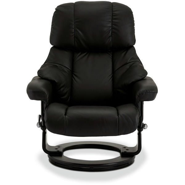 Hvilestol med drejelig fodskammel, betrukket med sort læder/PVC kombination. Sæde og ryglæn er polstret med højdensitetsskum (42 kg/m³) for fast, varig komfort. Ryglænets vinkel kan justeres manuelt fra 85° til 135°, suppleret med en justerbar nakkestøtte og en smidig drejefunktion. Centralt sort træben sikrer stabilitet med en moderne profil. Inkluderer matchende fodskammel med drejefod. Ramme lavet af træ og metal. Sædehøjde: 44 cm. Indendørs brug. Montering påkrævet.