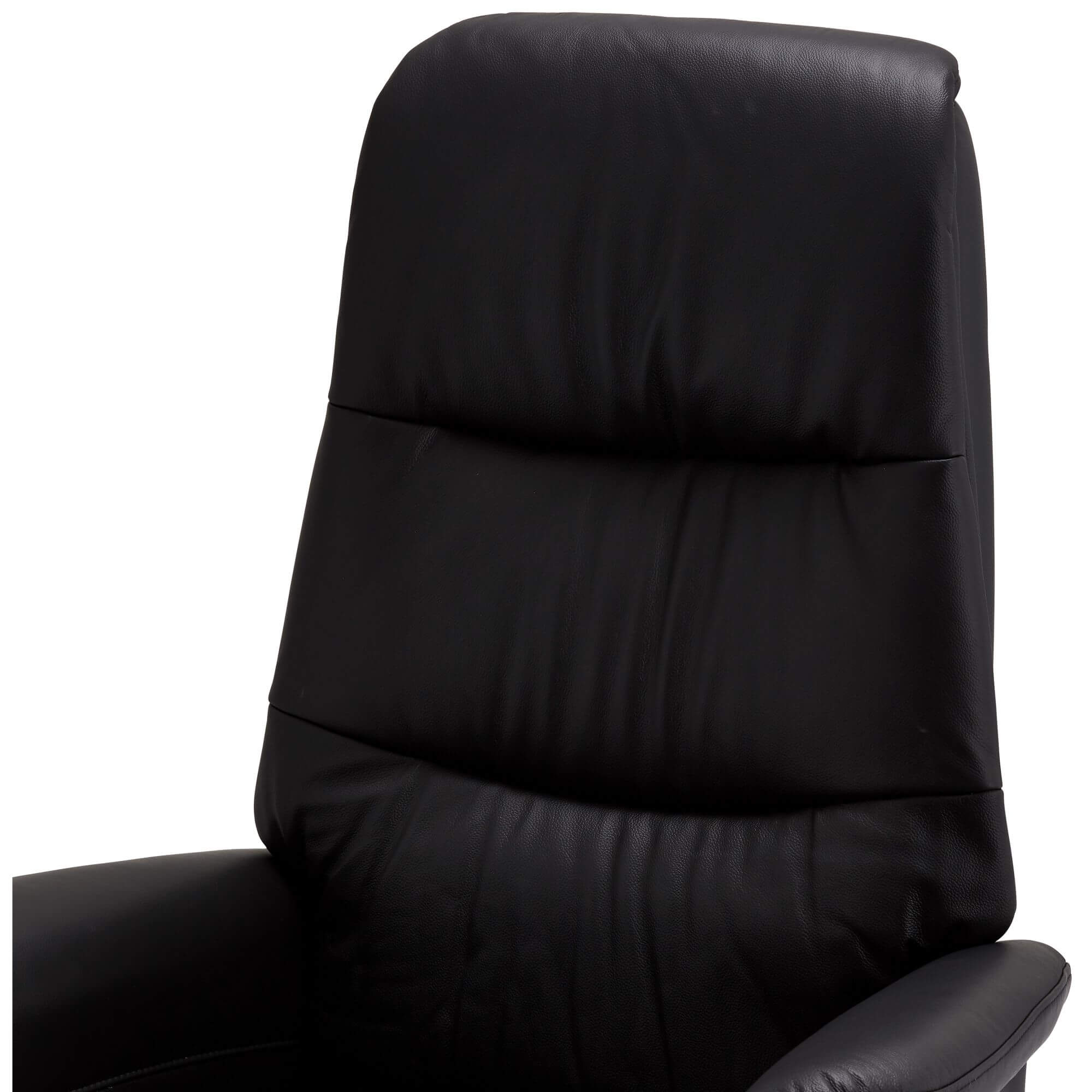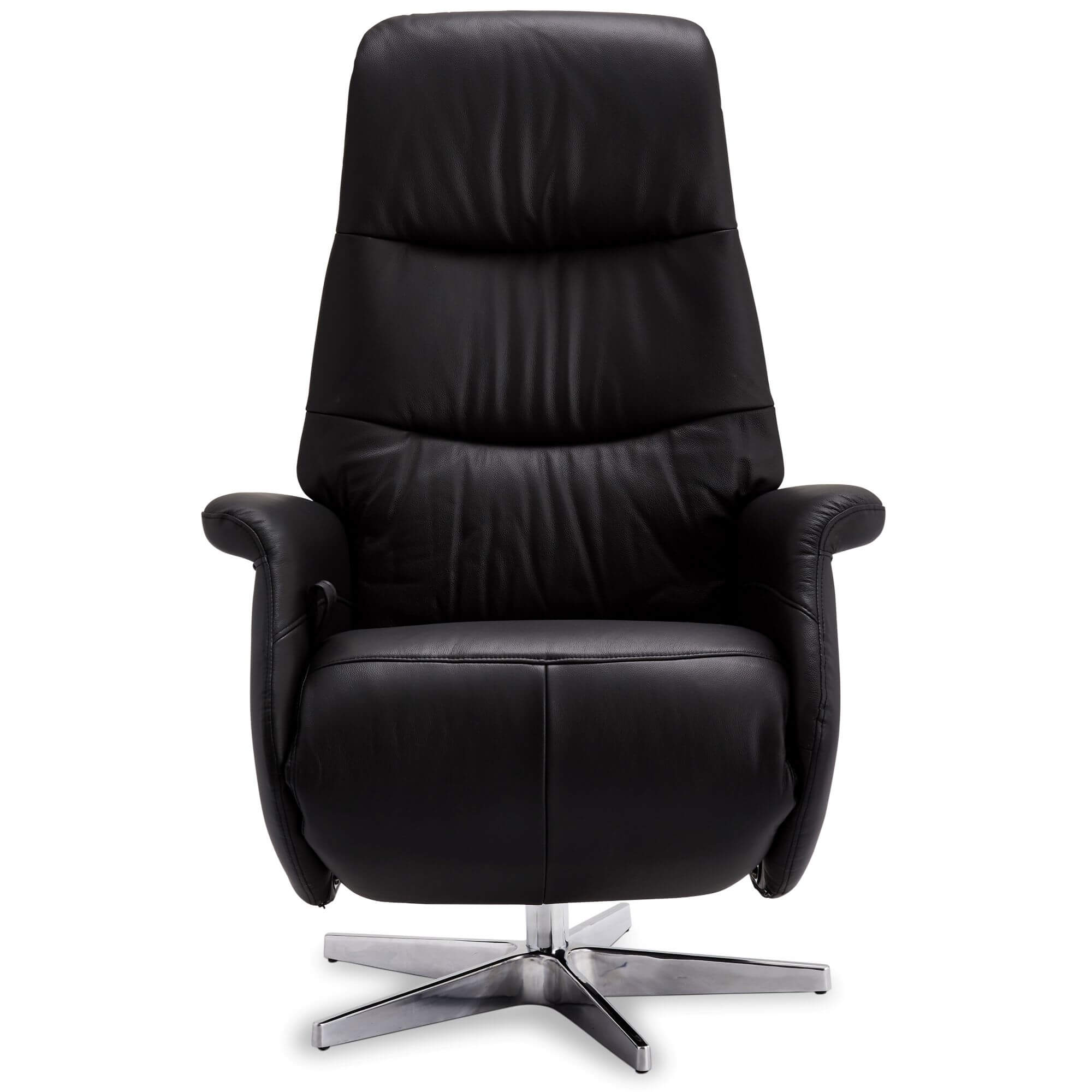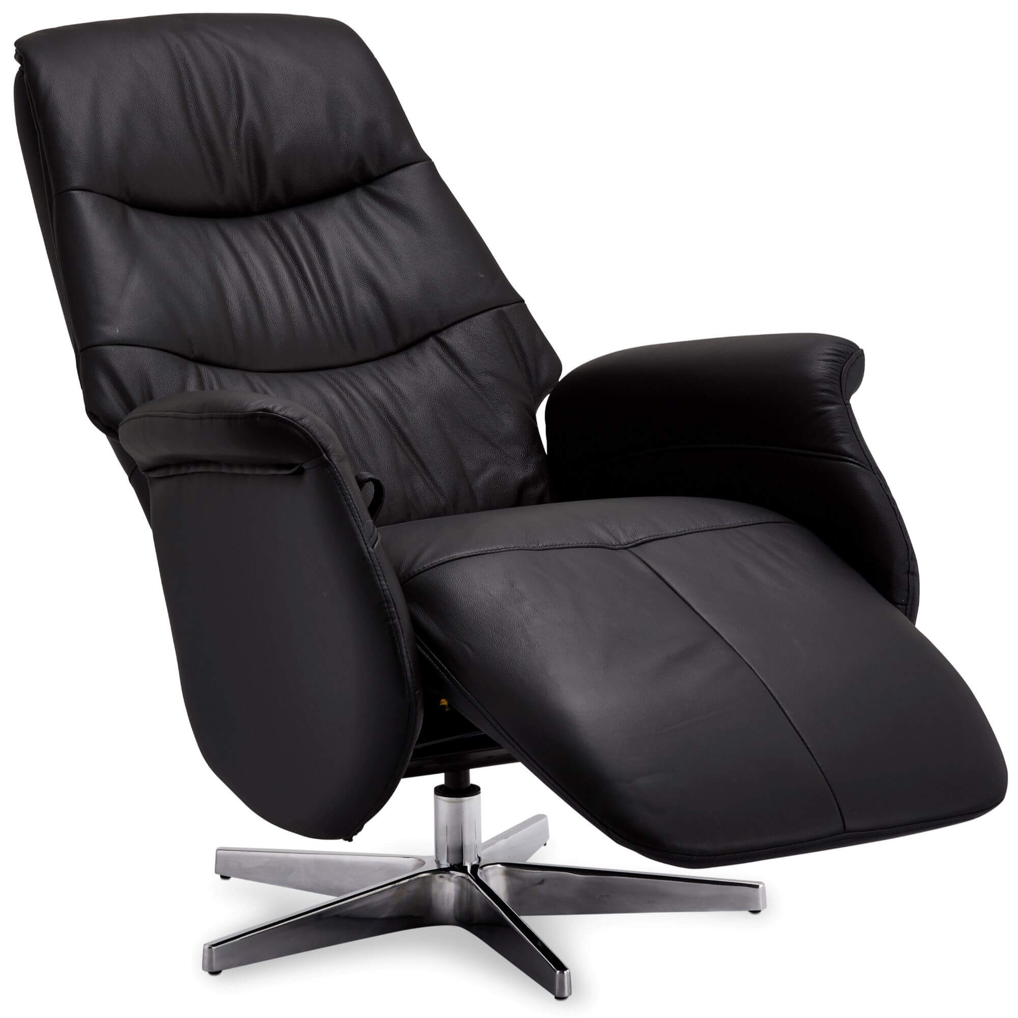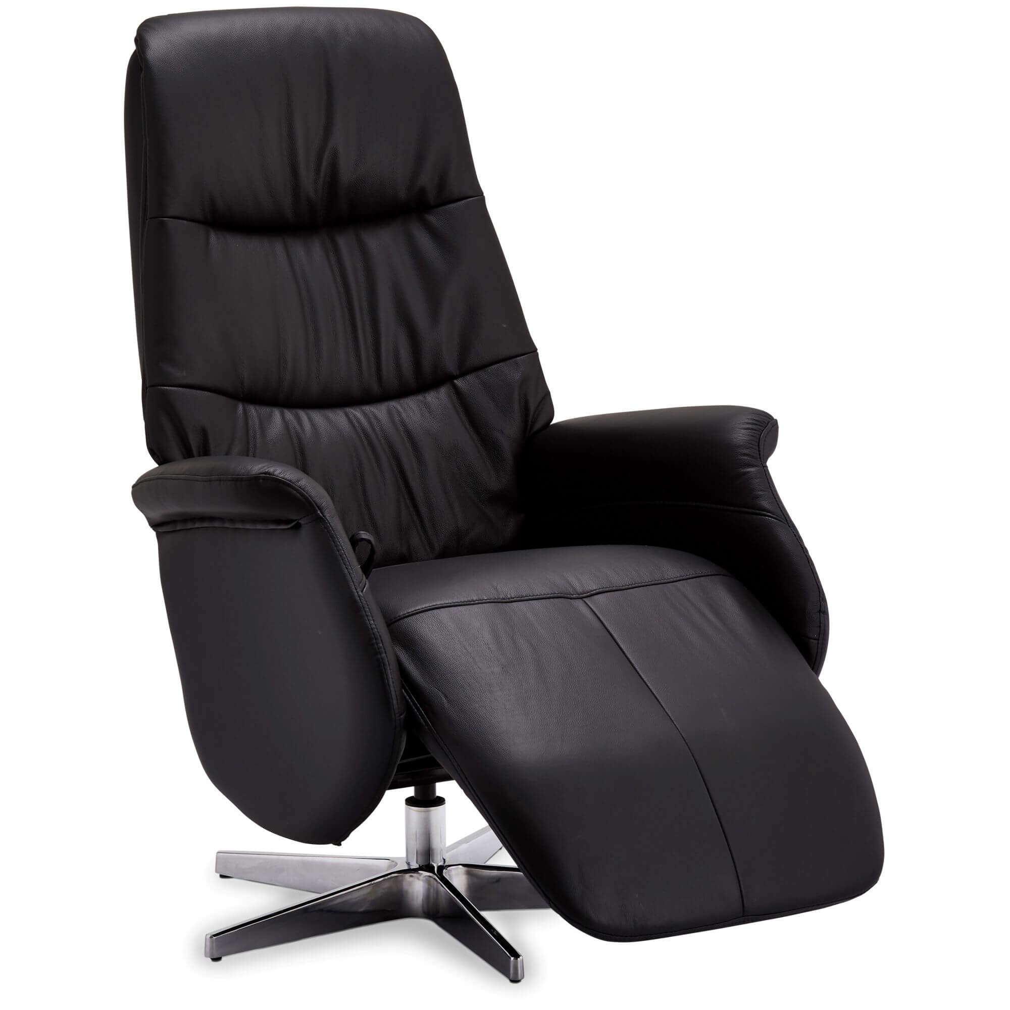 Manuel hvilestol med sort læder og PVC overflade. Sæde og ryglæn polstret med medium-density skum (36 kg/m³). Tilbagelænet fra 82° til 156°, med udtrækkelig fodstøtte og justerbar nakkestøtte. Sæde drejes 360°. Monteret på et centralt ben i sort metal. Ramme lavet af metal og træ. Sædehøjde: 50 cm. Indendørs brug. Montering påkrævet.