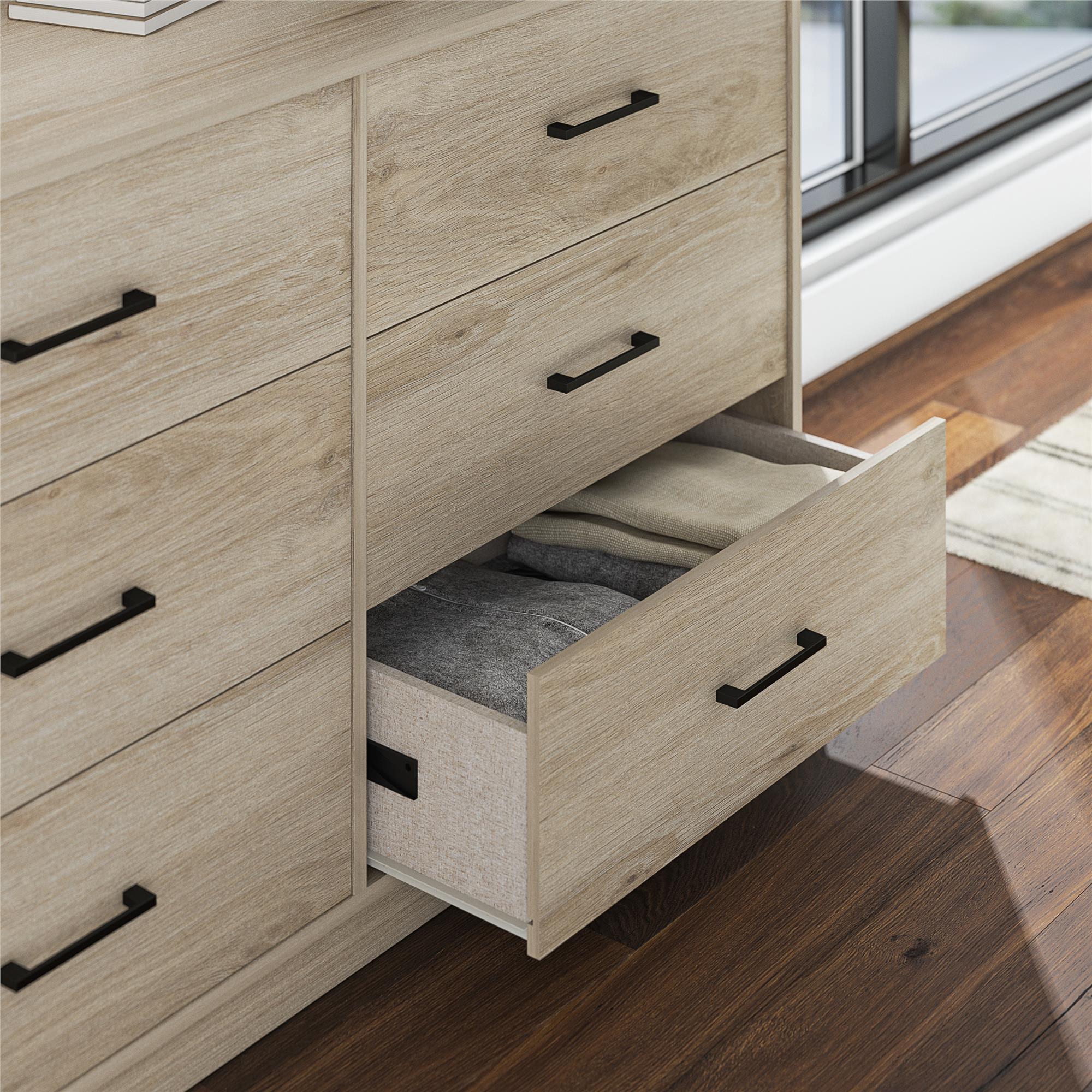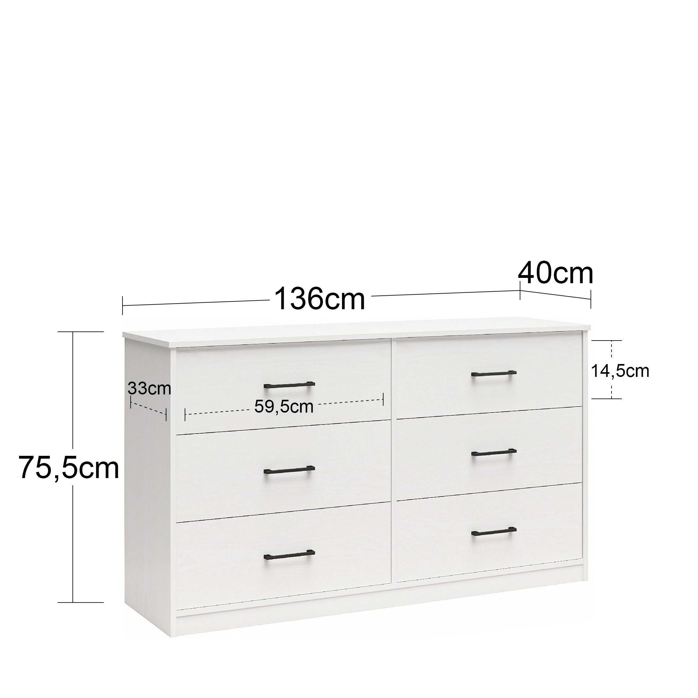 Denne kommode med 6 skuffer er lavet af lamineret spånplade. Den har et sammenlåsende SwitchLock-system og formonterede skuffeskydere. Dette reducerer monteringstiden. Kommoden sendes fladt og kræver to voksne til montering. For at forhindre væltning kan kun én skuffe åbnes ad gangen. Et vægankersæt medfølger for ekstra sikkerhed.