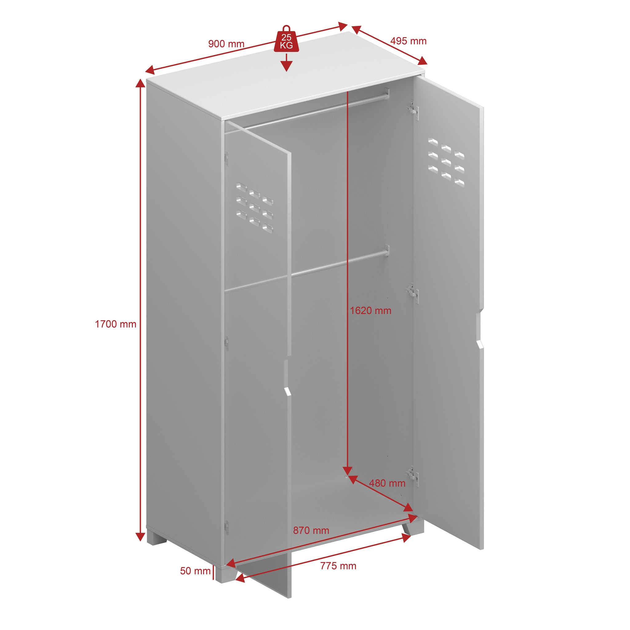 Bag de to døre finder du rigelig opbevaringsplads til dit tøj. Garderobeskabet har to bøjler, der giver plads nok til at hænge dit tøj på en organiseret og tilgængelig måde. Dette giver mulighed for effektiv opbevaring, der hjælper dig med at holde dit tøj rynkefrit og let tilgængeligt, når du har brug for det.