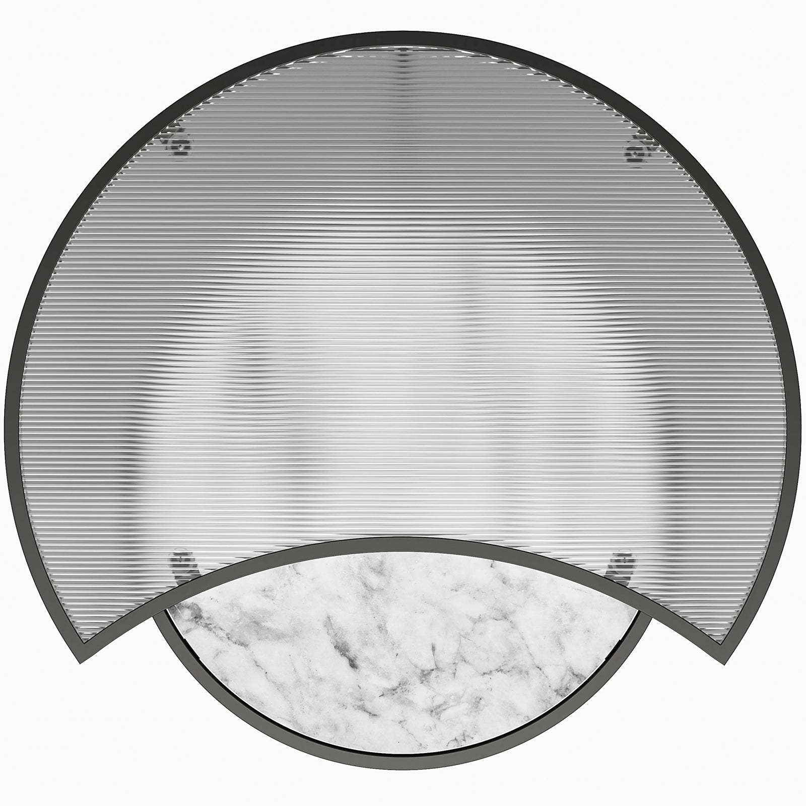 Slanke og sarte rammer omkranser en elegant, halvmåneformet riflet glasplade, der afslører en moderne blød, cirkulær plade i imiteret marmor på bordet nedenfor, der væver moderne minimalisme sammen med lækre kurver. Designet med små rum og alsidighed i tankerne, er de indbyggede sofaborde en lokkende og pladsbesparende tilføjelse til ethvert rum i hjemmet.