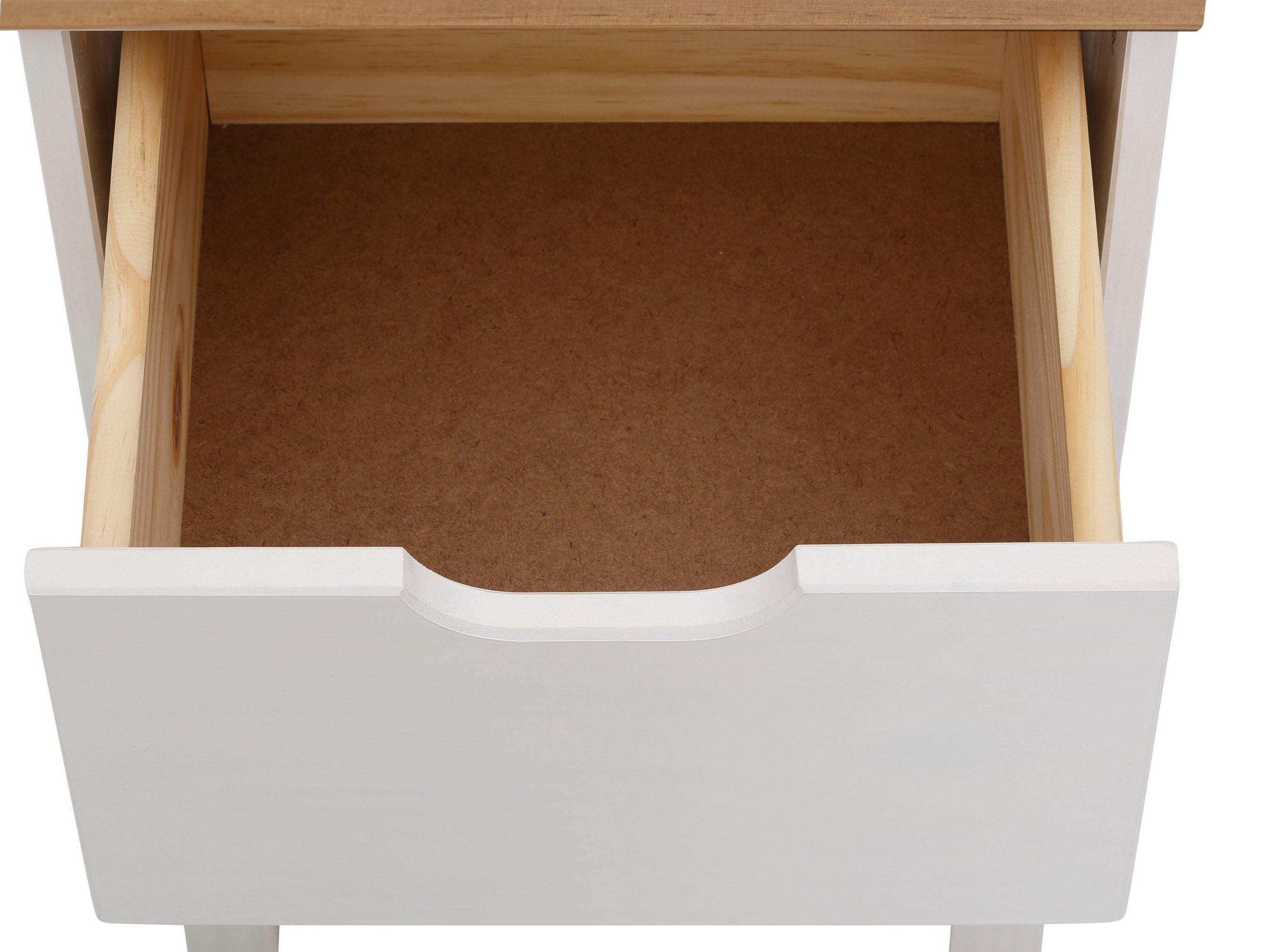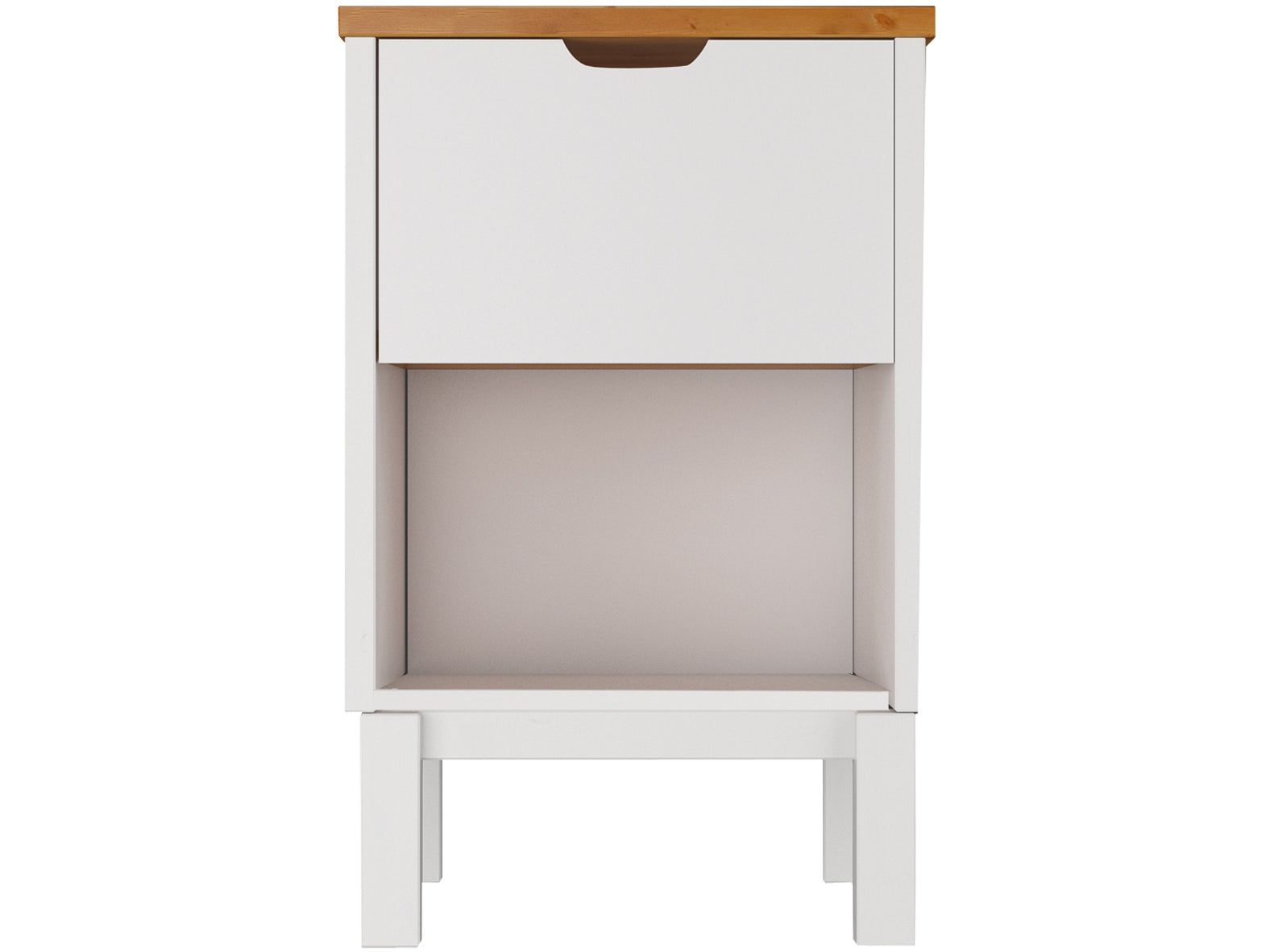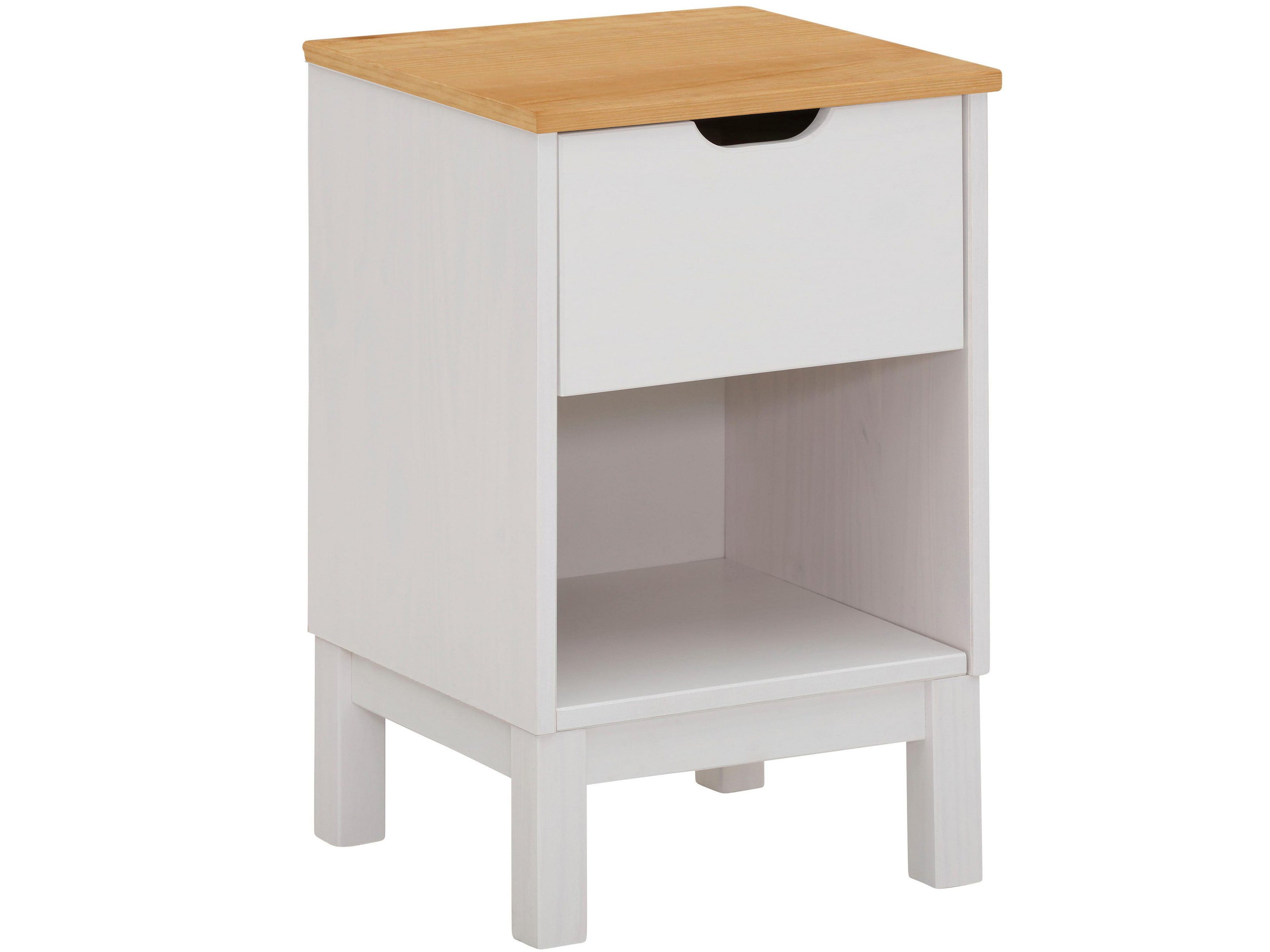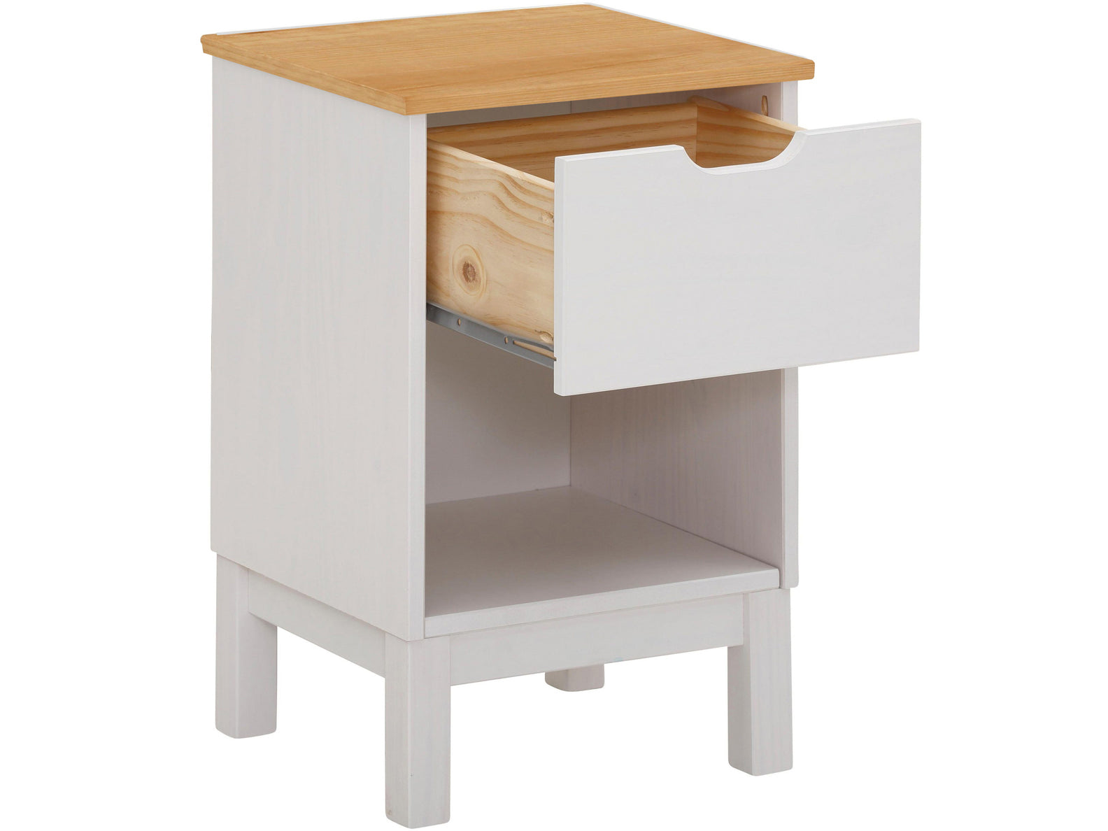 Natbordet med easycare overflader er lavet i en moderne landlig stil. Udseendet er præget af brugen af massivt fyrretræ. Udseendet rundes af af de fræsede forsænkede greb. Natbordet byder på masser af opbevaringsplads private ting kan opbevares i skuffen. Bøger kan placeres i det åbne rum. Der er plads nok på hylden til en natlampe, et vækkeur eller en mobiltelefon. FSC®-certificeret massivt træ anvendes til produktion. Sengebordet med easycare overflader kan kombineres på mange måder.