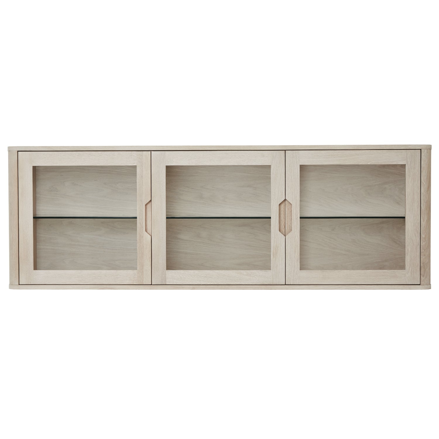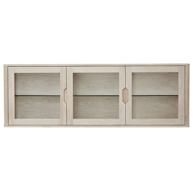 Væghængt skab i egefiner, massivt træ og MDF med hvid-olie finish. Tre låger og tre justerbare hylder-glas (8 mm). Dæmpbar LED-belysning og soft-close system. Bredde: 180 cm.