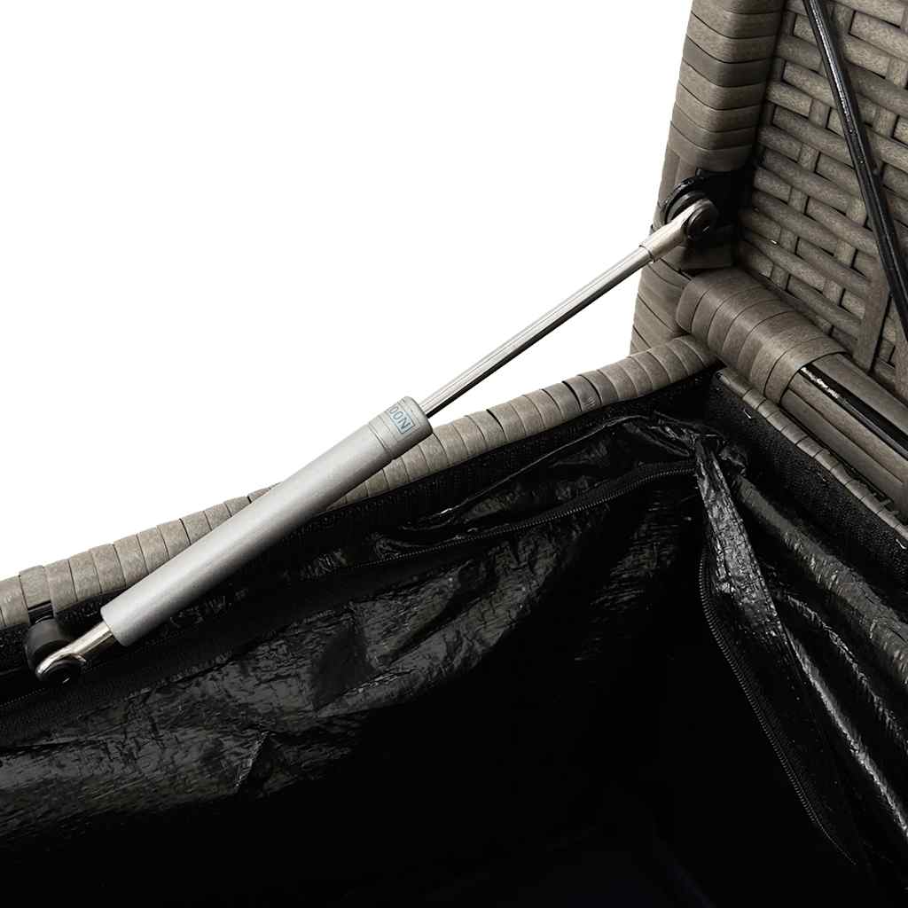 - Opbevaringsfunktion: Havesædet har opbevaringsplads nedenunder og er udstyret med en vandafvisende pose til opbevaring af hynder, legetøj og andre ting. Den indvendige pose kan fastgøres sikkert til sædet med velcrobånd, hvilket sikrer stabilitet og forhindrer bevægelse.