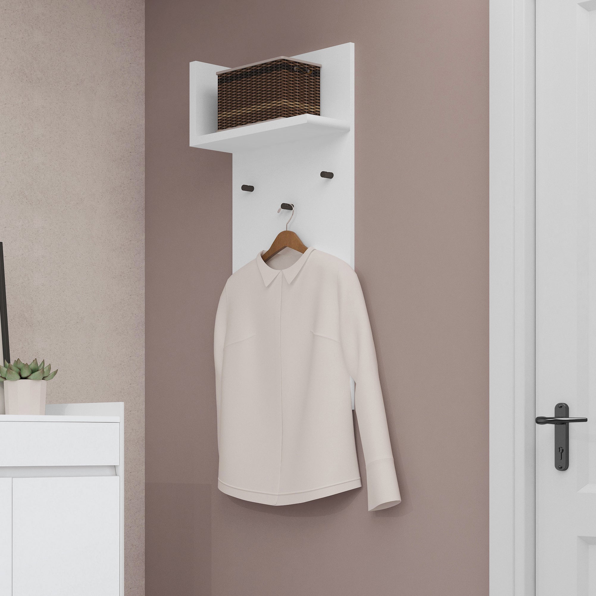 Dette vægmonterede frakkepanel har et moderne design. Det er en praktisk hjælper i din entre og entré. Det subtile farveskema og det rene minimale design gør den velegnet til mange boligstile. Med sine smalle dimensioner passer vægpanelet godt i små rum. Den er udstyret med metalkroge til at hænge jakker frakker og tasker. Ovenover er der en hylde til hatte og andet tilbehør. Der er brugt robuste materialer til produktionen af denne hallgarderobe.