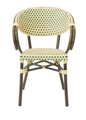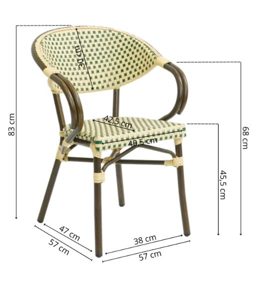 Opgrader dit udendørsområde med Paris caféstol med armlæn og flet, der forener høj kvalitet og elegant design. Stolen er ideel til caféer, hoteller, campingpladser og virksomheder, der ønsker at tilbyde deres gæster både komfort og et indbydende visuelt udtryk.
