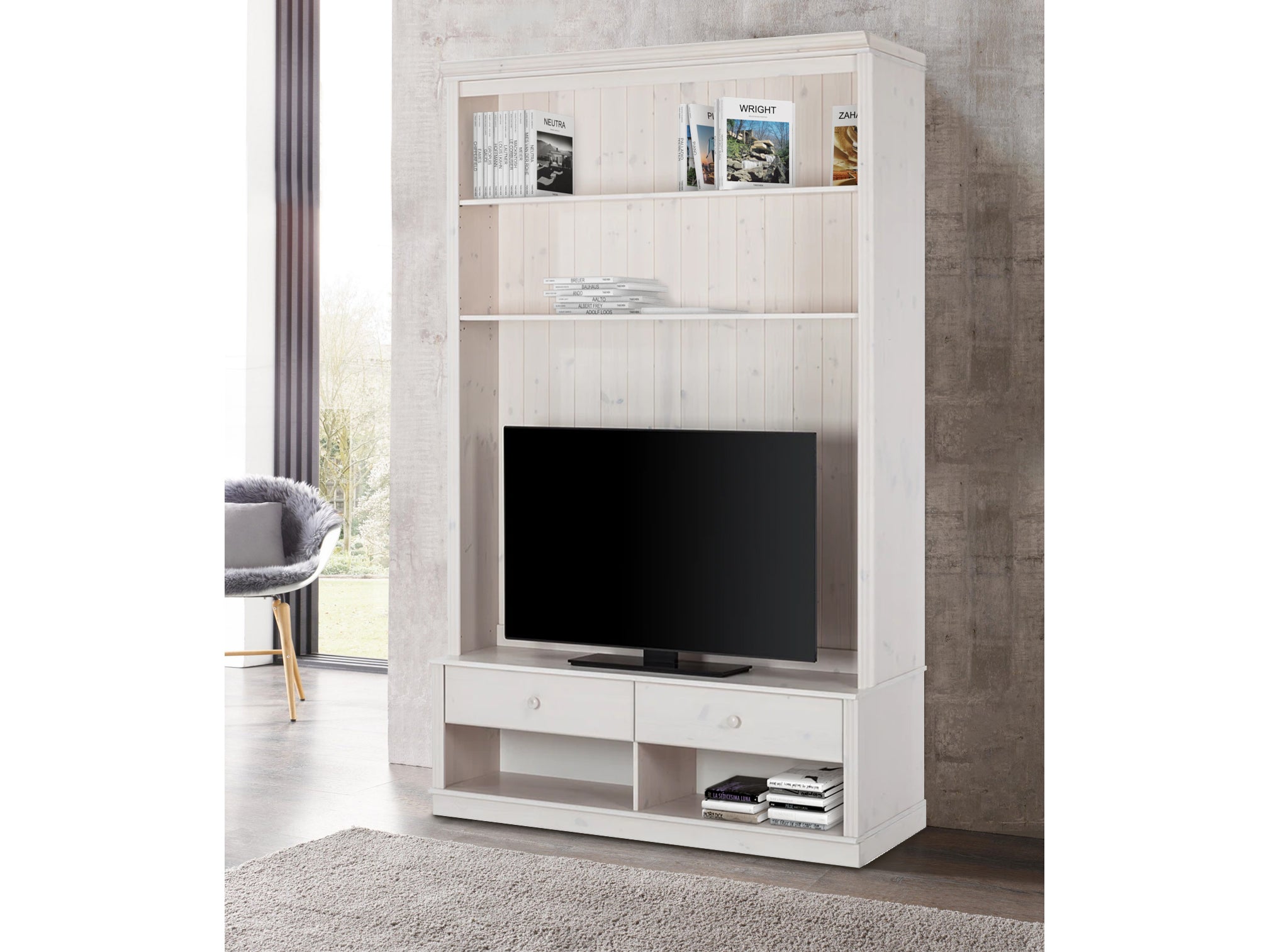 Reol lowboard med 2 skuffer i fyrretræ hvid